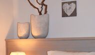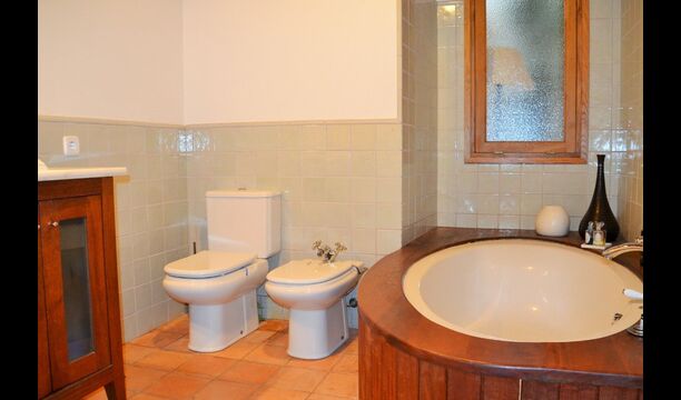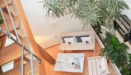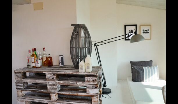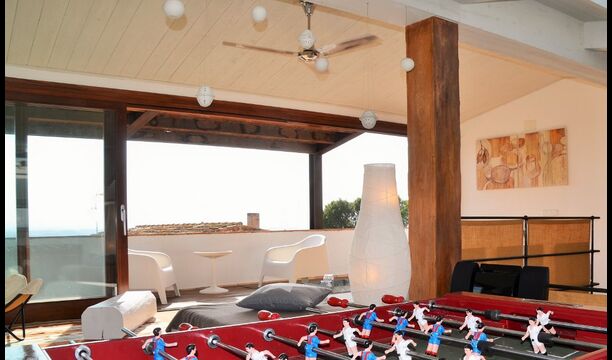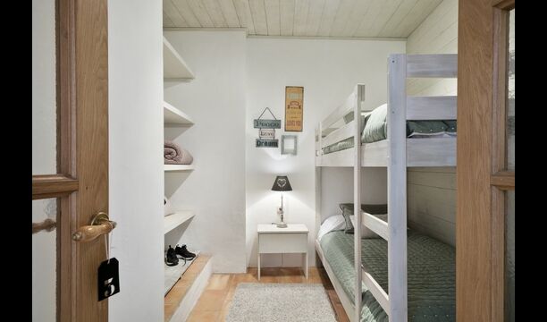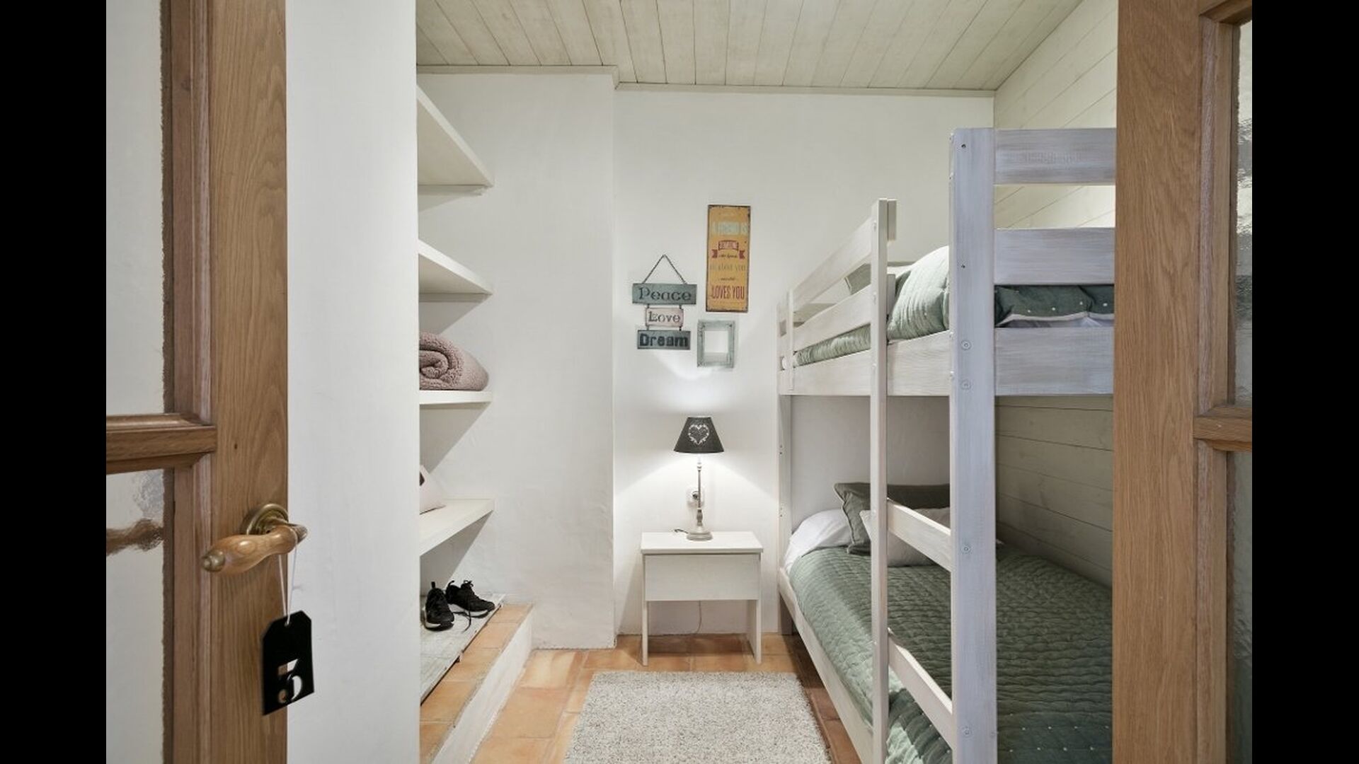As you enter, you will find a bedroom on your left and another one on your right; both of them arranged to perfection. They both have en suite bathrooms (one of them with a bathtub) and flat screen televisions as well as modern, cosy decorations. Further down the hallway, you find the last two bedrooms on the first floor. The first one has a double bed and a single bed, also with an en suite bathroom. The second one has a bunk bed and is suited for children. Likewise, these two are organized in a very modern and comfortable style. Four of the total five bedrooms are situated on the first floor, with the remaining one on the second floor, which provides two single beds, of course with the possibility of joining them into one double bed. The first floor ends in a stylishly arranged chill-out area with open roof to the third floor.