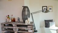 On the second floor, there is a bedroom, a living room, a kitchen, a bathroom and a dining room. The living room is arranged in a very cosy mood, with the owner paying attention into every single detail. The living room has a large couch as well as two, comfortable chairs, all pointing towards the flat screen TV and the fireplace. The kitchen has everything you will need and probably even more. Here, you will also find a balcony with a view of the quiet street and the hangout area, which belongs to the house.