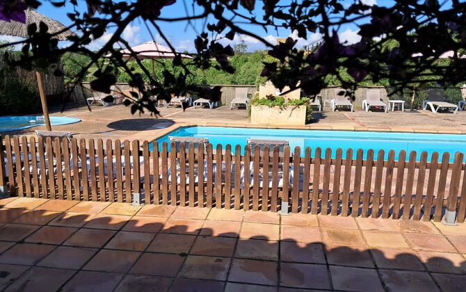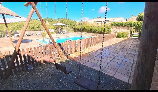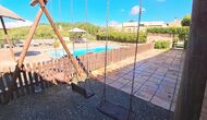 One is the shared, communal pool, with a separate round pool for the children. Both pools are in the same area, which is fenced. There are multiple sun loungers to recline and relax in as well. On the other side of the fence, there is a swing for the kids.