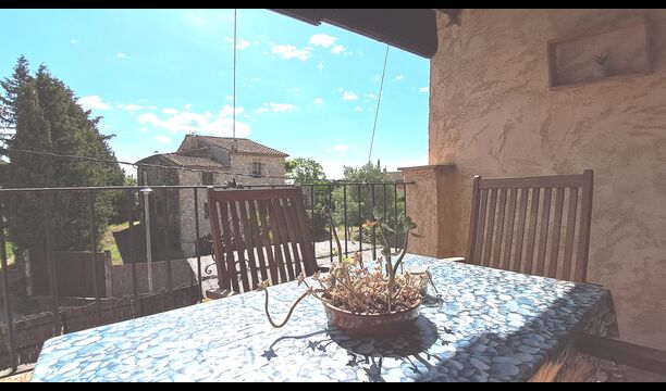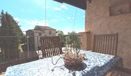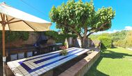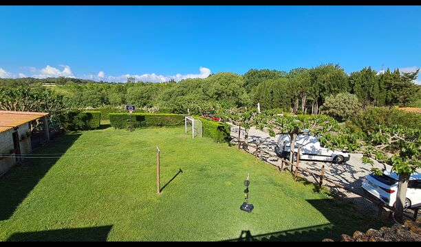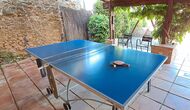 There is also the covered terrace, with chairs, a small table, and – further back – a wall-attached stone sofa. In the garden you will also find a table tennis setup and a small football pitch.