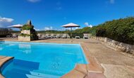 One is the shared, communal pool, with a separate round pool for the children. Both pools are in the same area, which is fenced. There are multiple sun loungers to recline and relax in as well. On the other side of the fence, there is a swing for the kids.