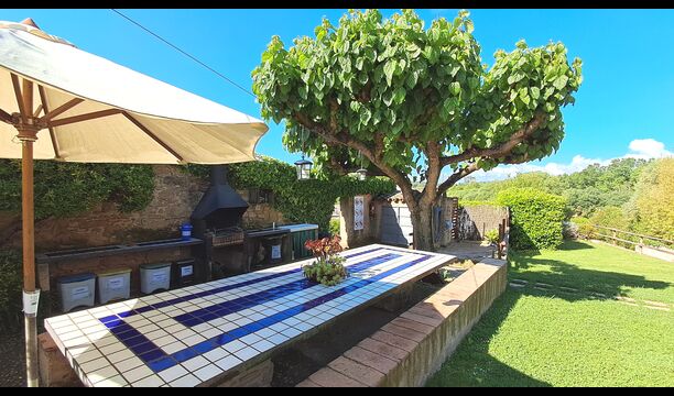 There is also the covered terrace, with chairs, a small table, and – further back – a wall-attached stone sofa. In the garden you will also find a table tennis setup and a small football pitch.