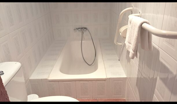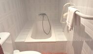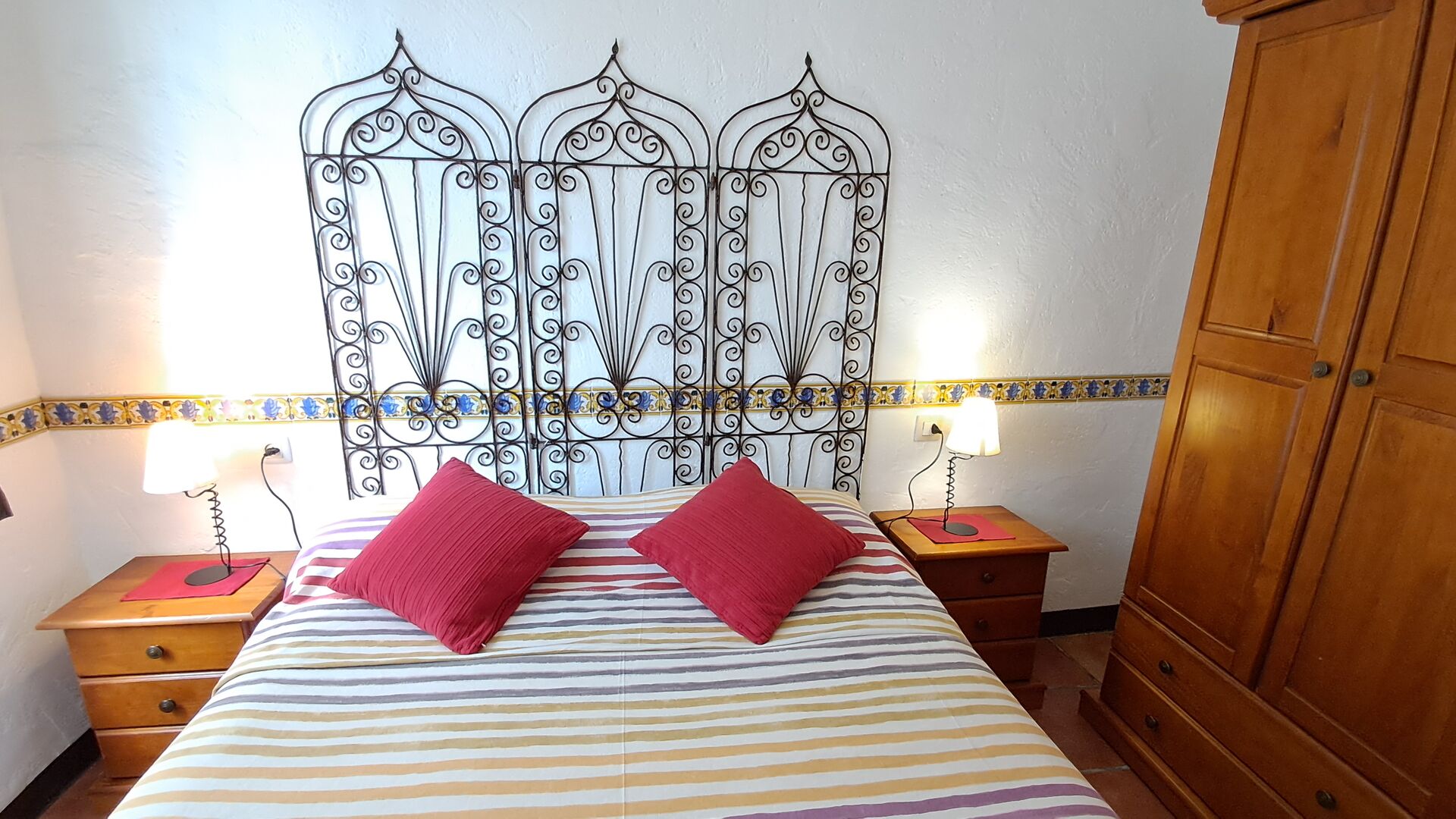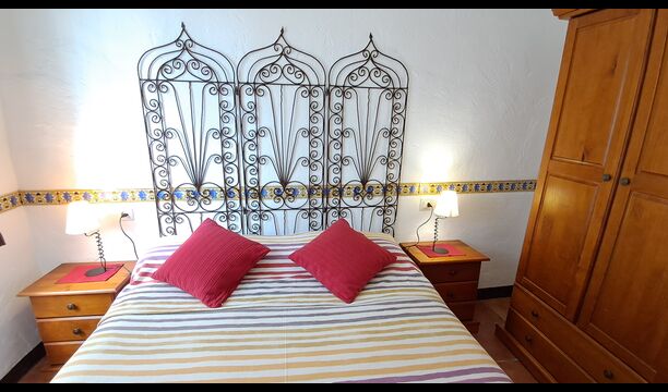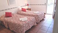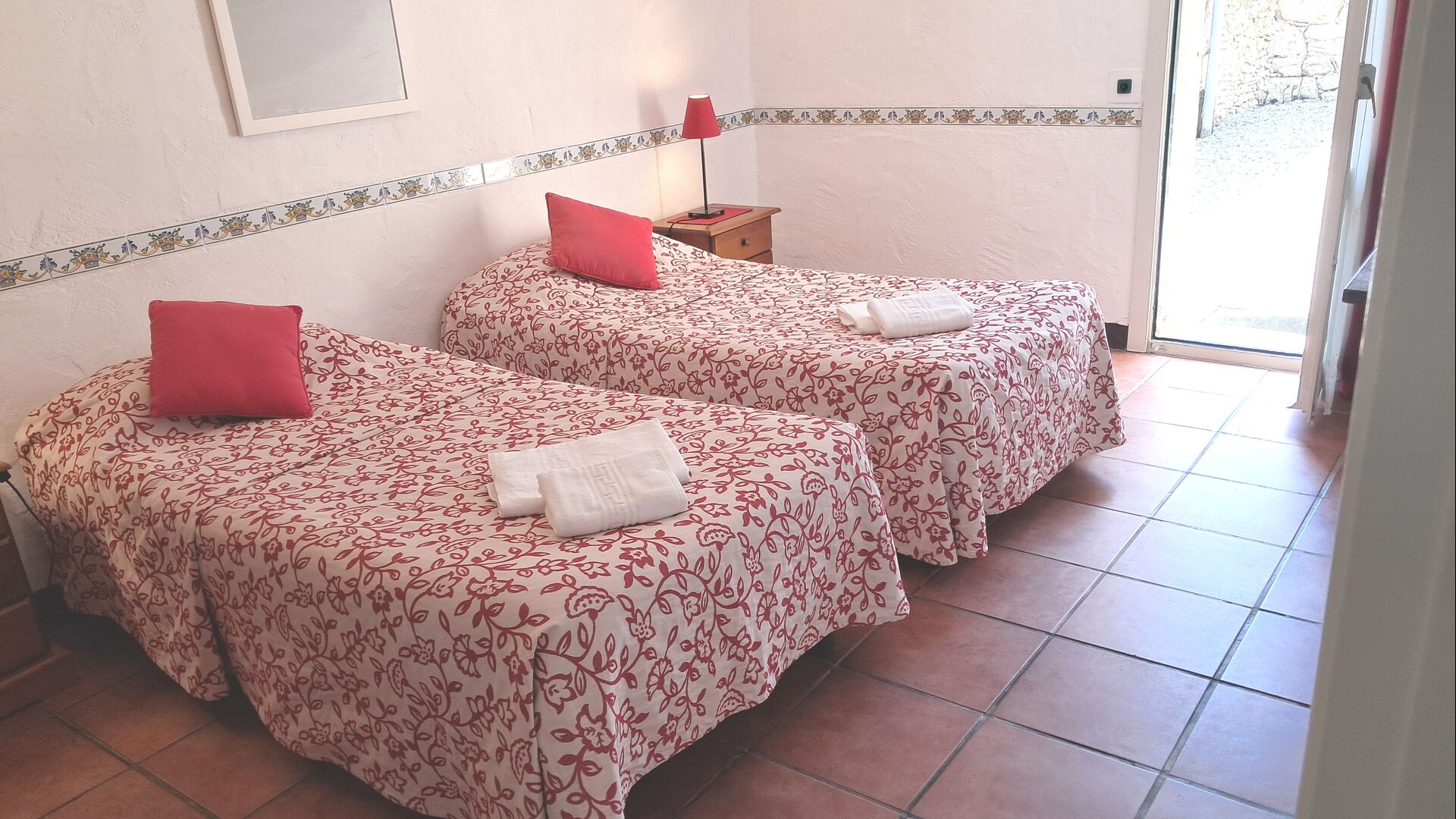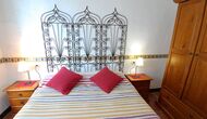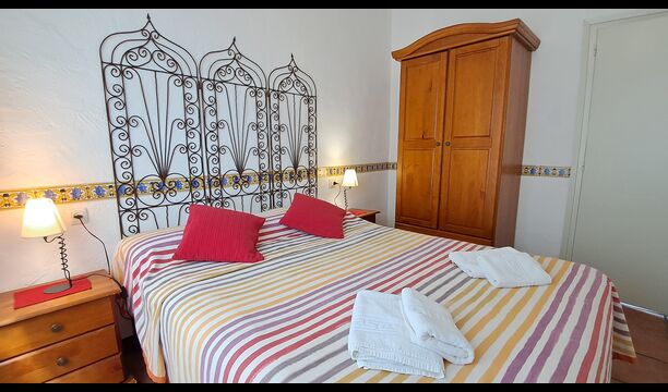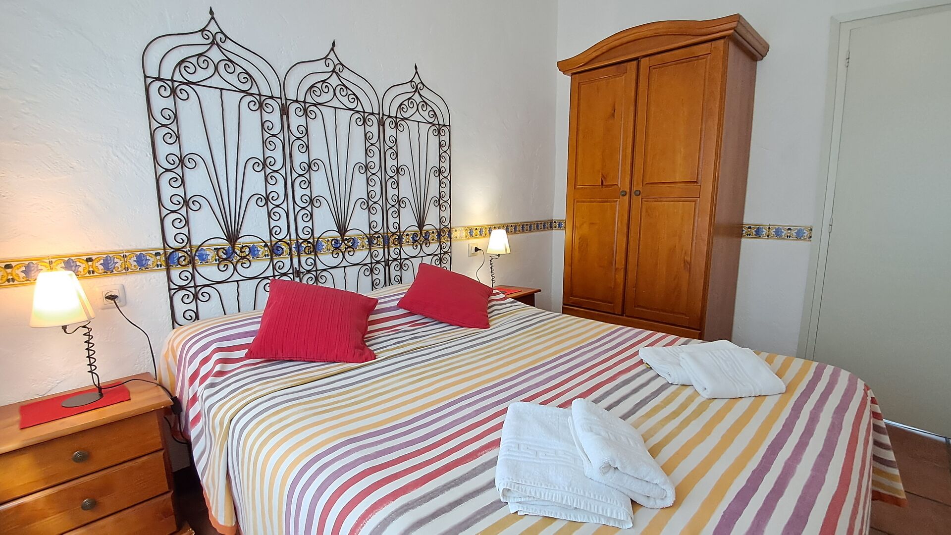 There are two cosy bedrooms, one with two double beds, where you also find the access to the private patio. It has fans for warm nights. Then there is the second bedroom, which is a double room and here, there is a ceiling fan to keep the temperature pleasant. The two bedrooms share the the bathroom with bath tub.
