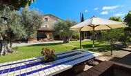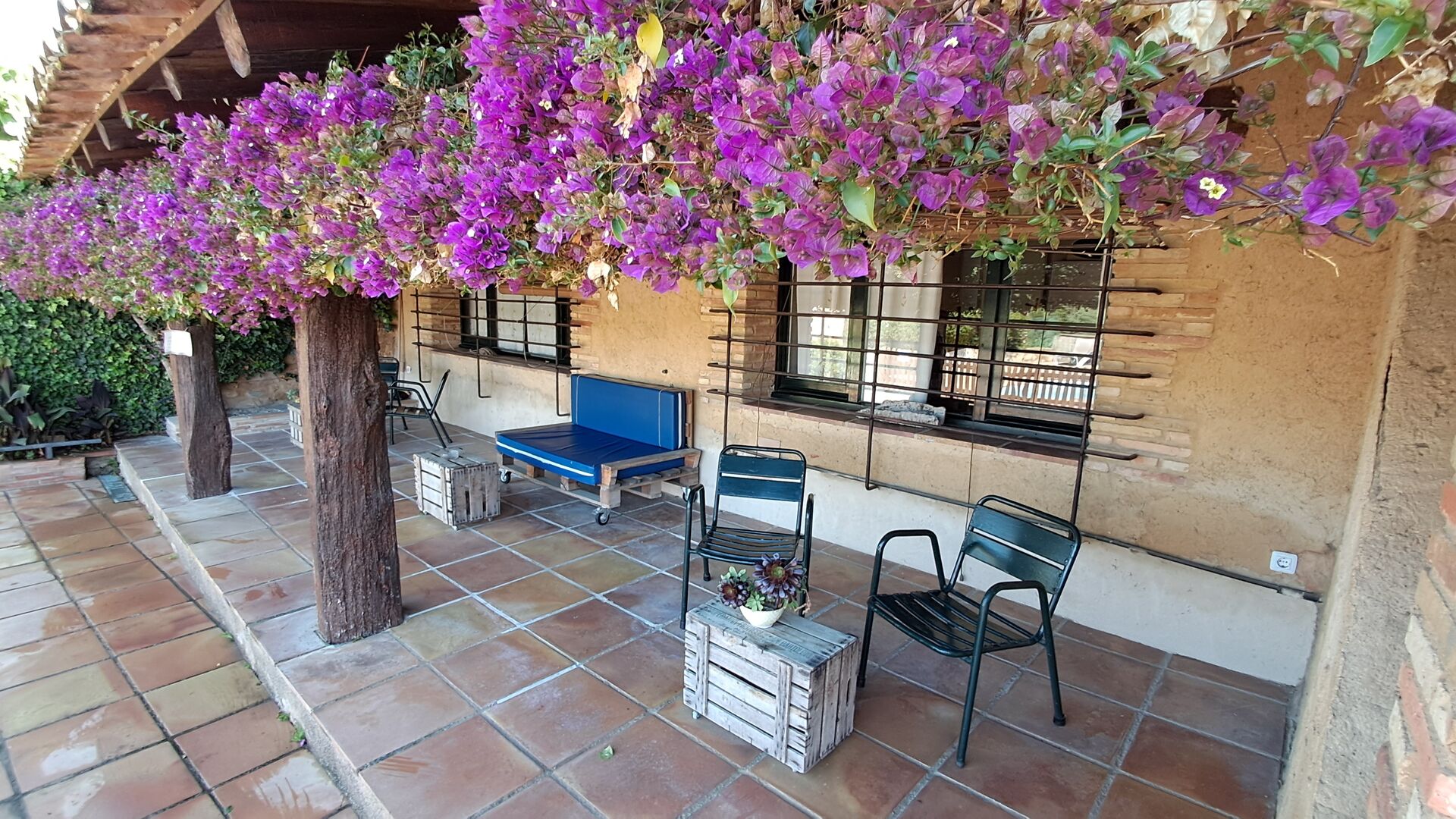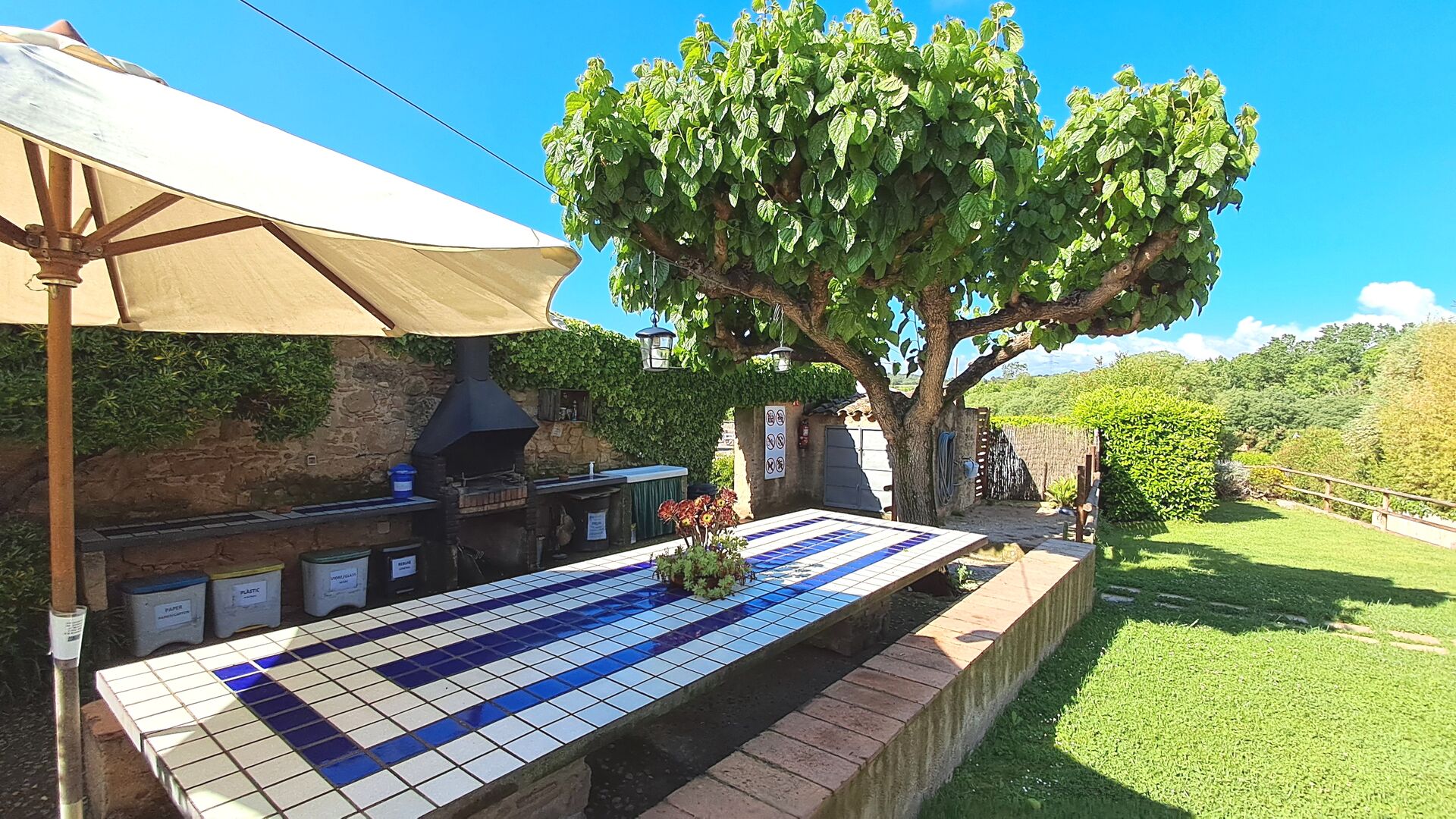 There is also the covered terrace, with chairs, a small table, and – further back – a wall-attached stone sofa. In the garden you will also find a table tennis setup and a small football pitch.