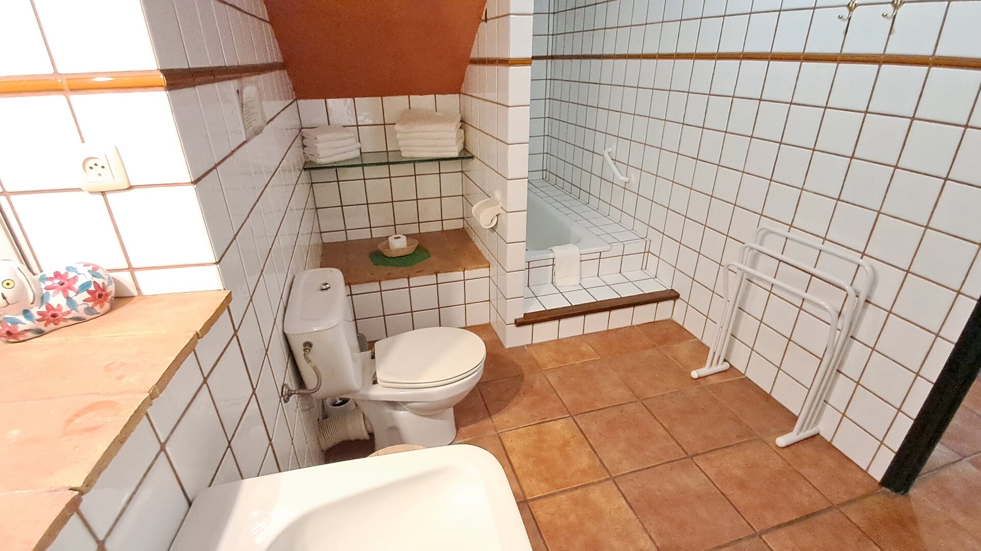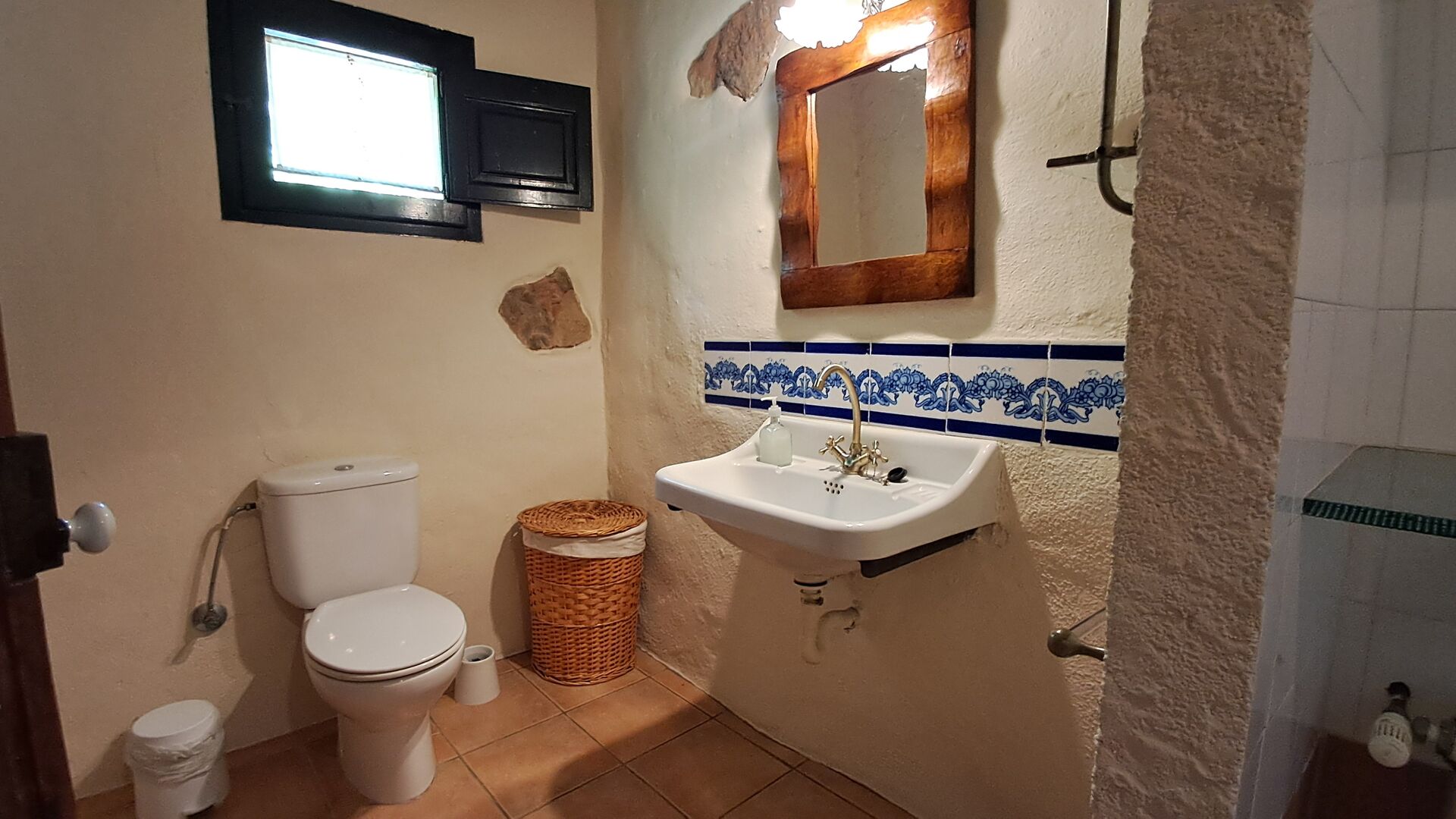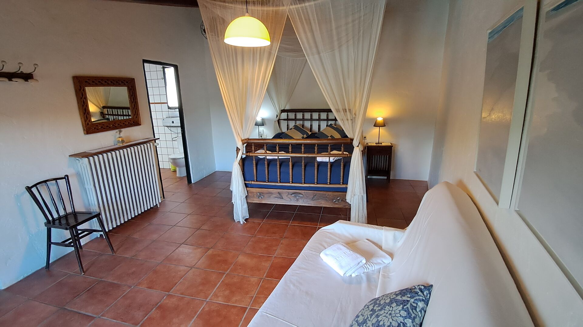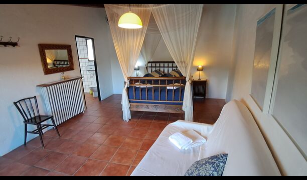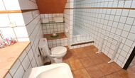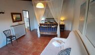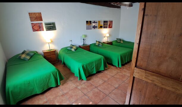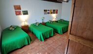 Also in the ground floor level your find two of the bedrooms. A double bedroom with double bed and a private bathroom, and then some steps down, a bedroom with 4 single beds and also a bathroom. Both have also ceiling fans for warm nights. On the first floor, you find the third bedroom. It has a double bed and a single bed and a bathroom.
