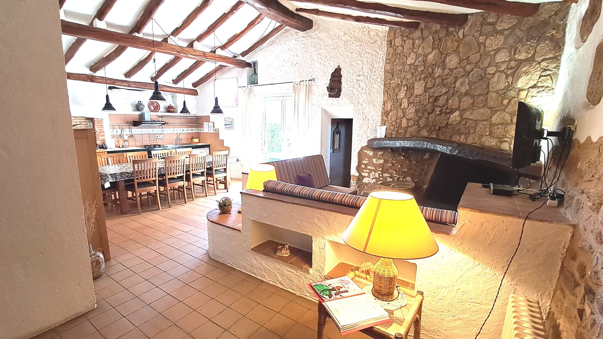 You enter the big common room, where the dining area and the kitchen has been perfectly integrated. The kitchen and dining area has direct access to the patio with table for outside dining. So you can decide if you would like to eat inside or outside depending on the weather and temperature.