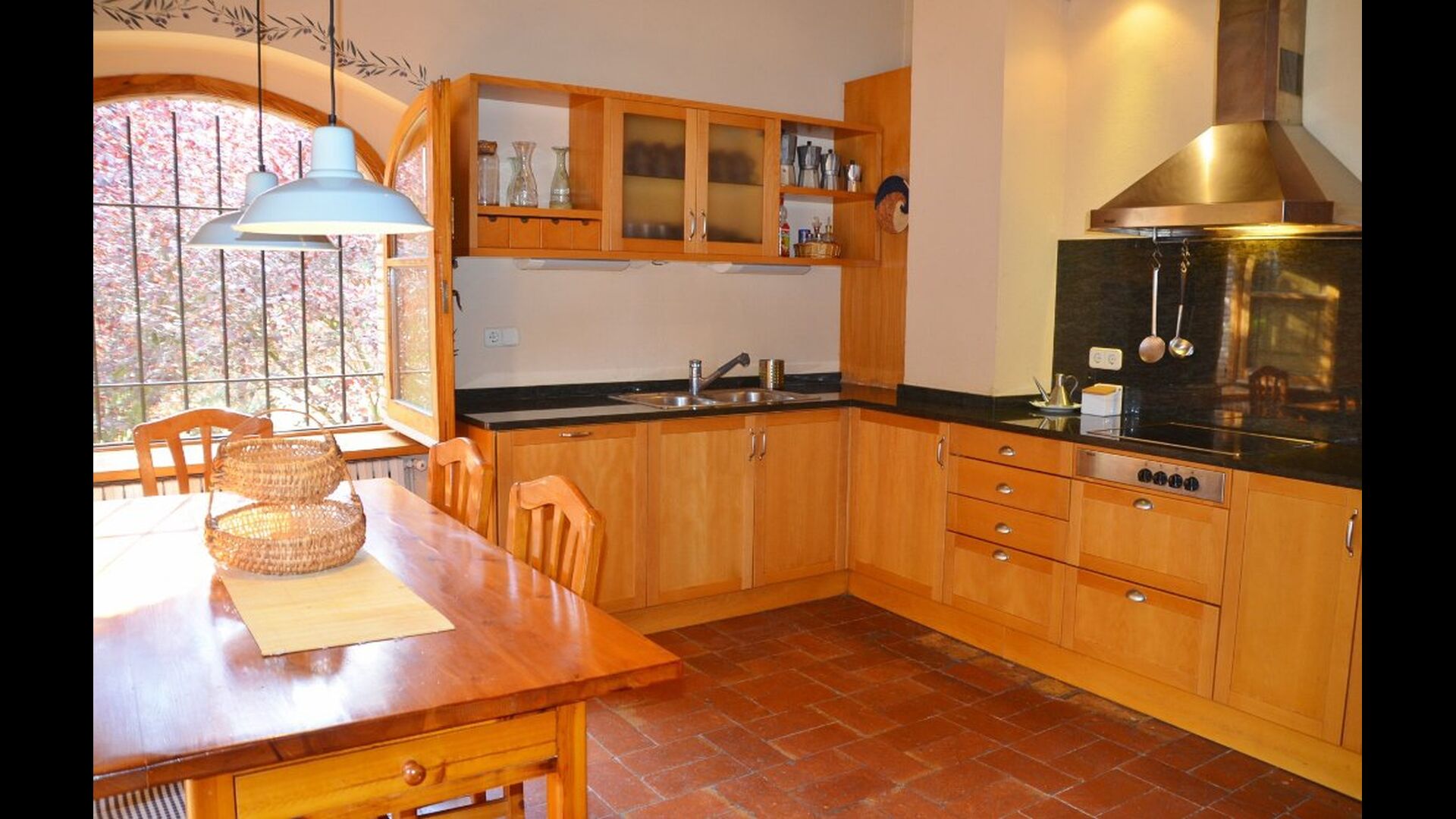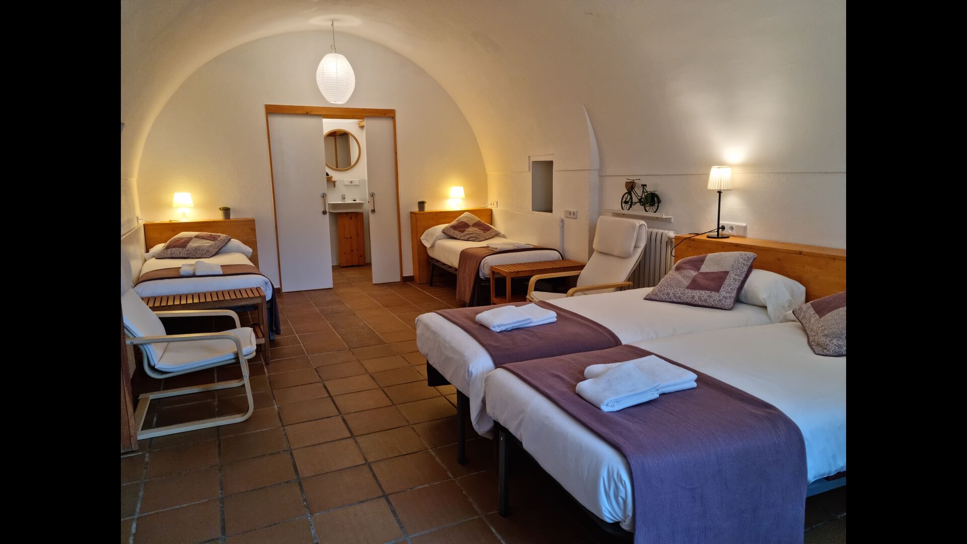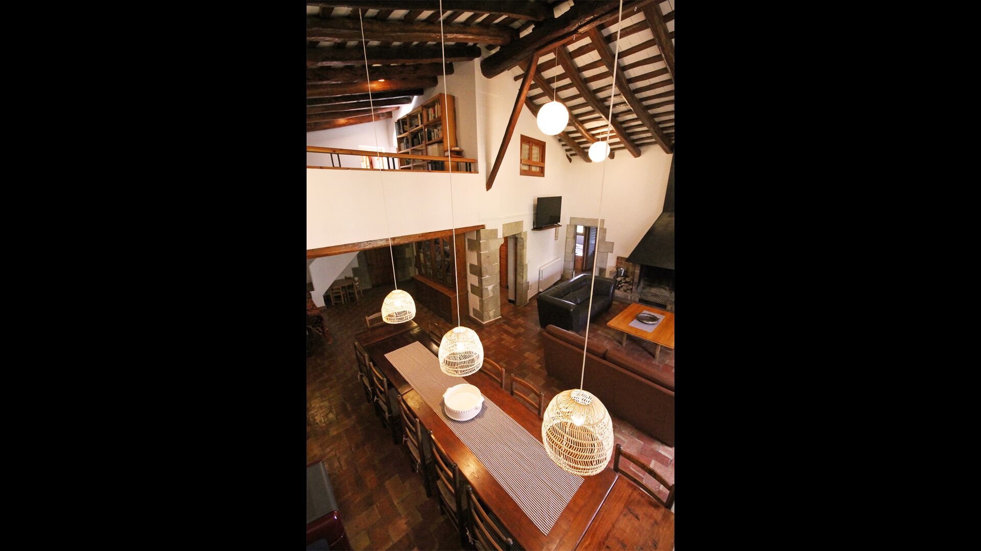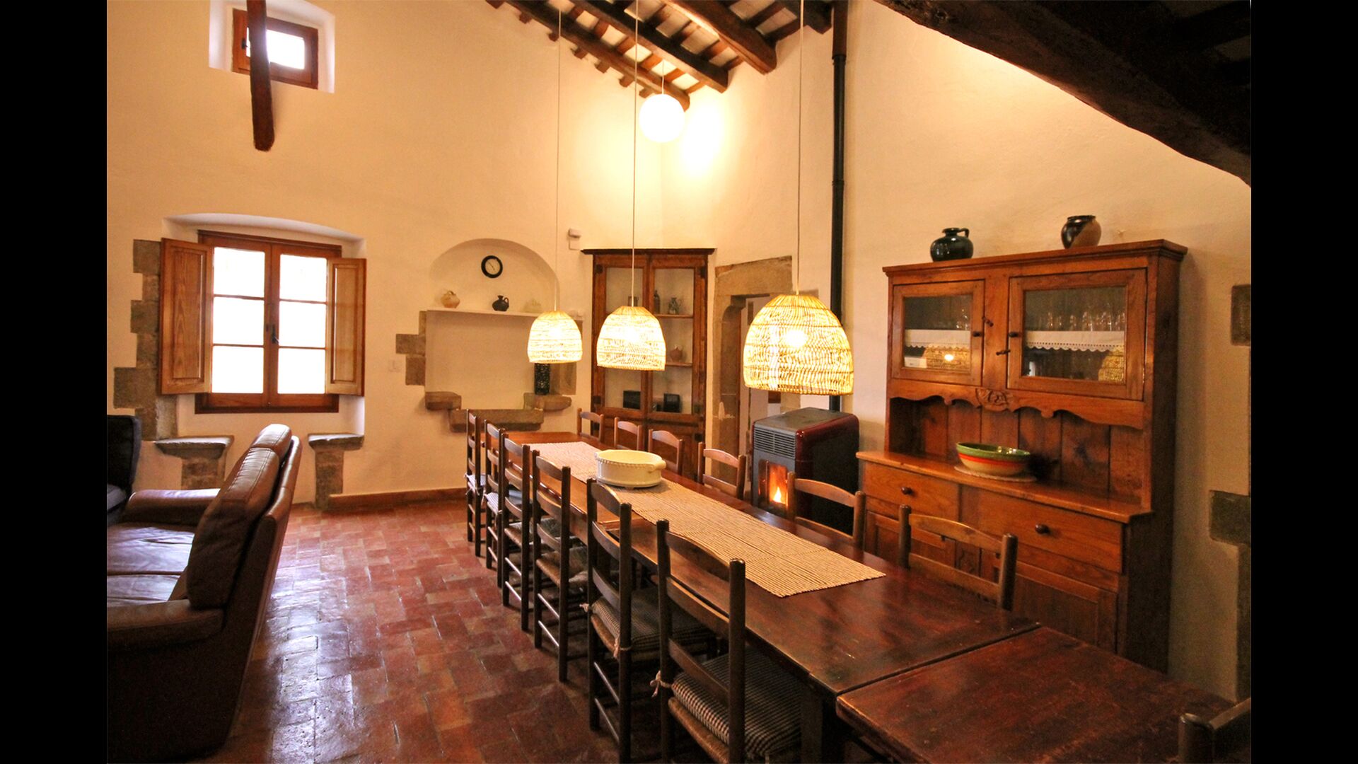 At the first floor, there is a very big common area in more classic Catalan style, where you will really sense the long history of the house. In this big area, there is a sofa-corner with TV and DVD and a long dining table. In connection, there is a fully equipped kitchen (dish washer, stove, hotplates, American fridge etc.) with a small dining area. In the house, there is a WIFI Internet connection.