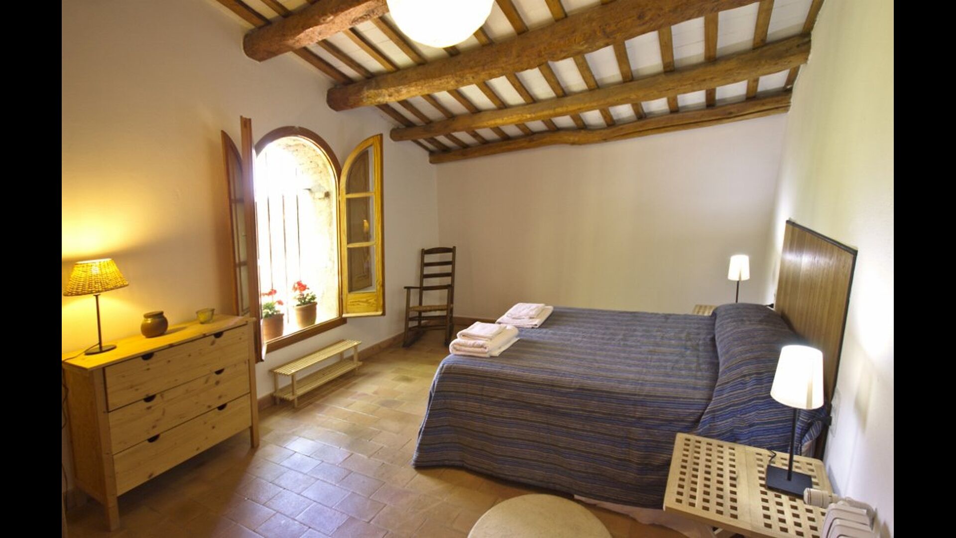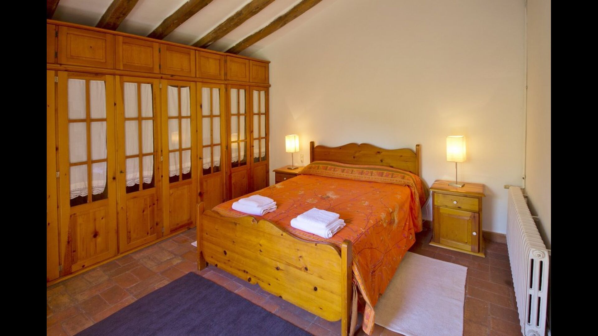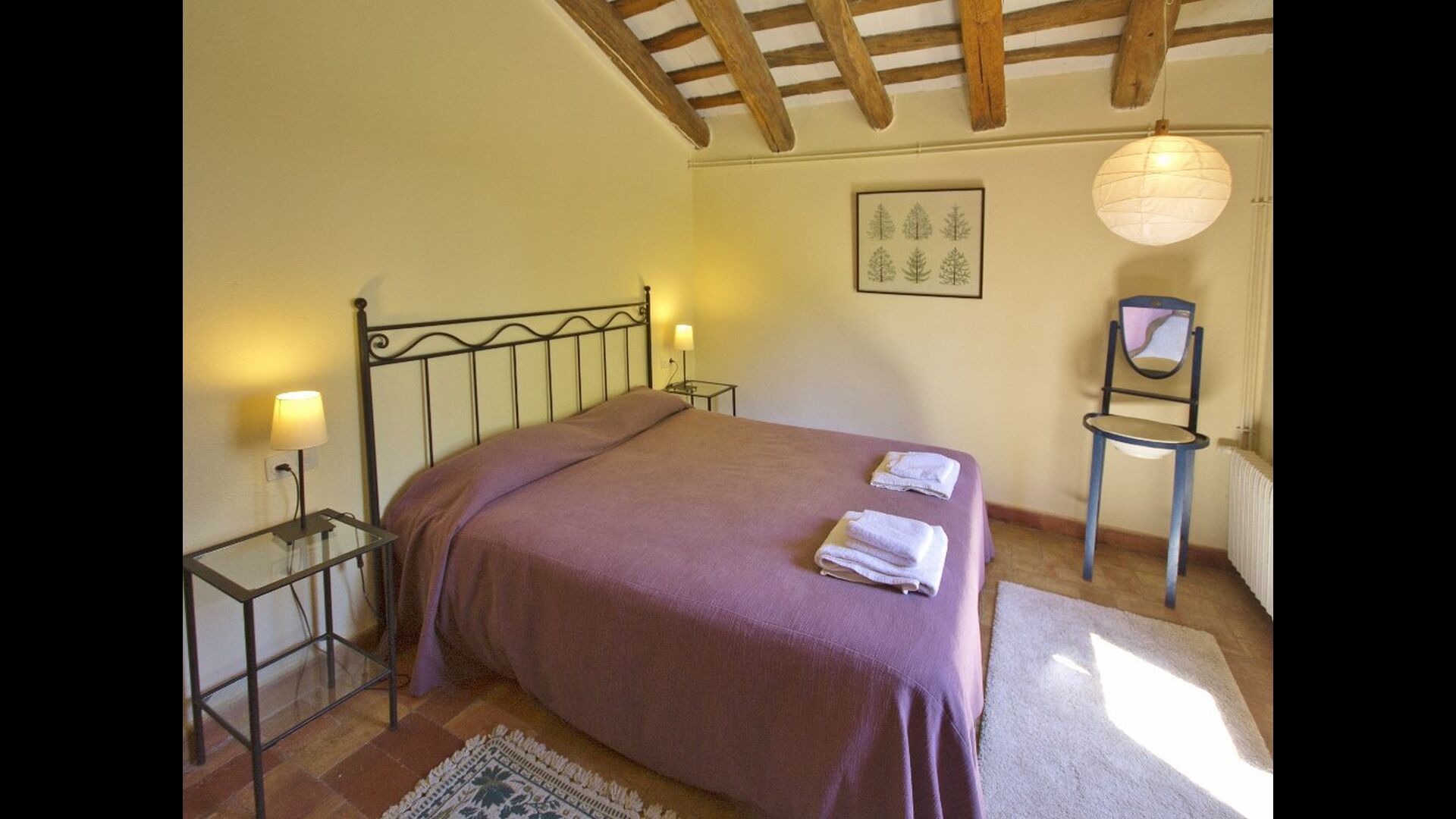 From the common area, there are access to five additional bedrooms, two of them doubles with double bed, one double with two single beds and one of them triple with 3 single beds. The rooms have a very nice view over the landscape and down towards the village. On this floor, there are two bathrooms to share.