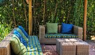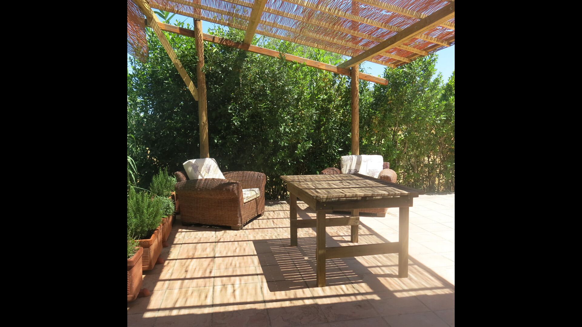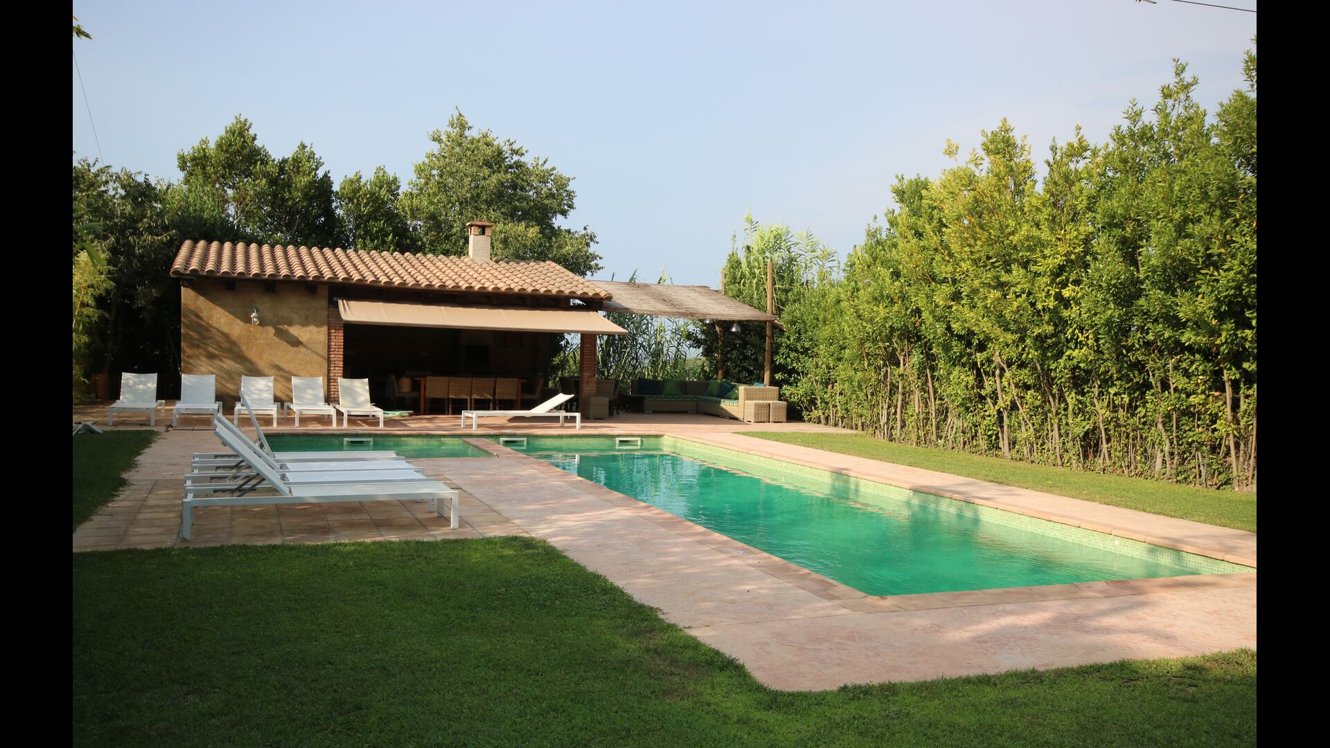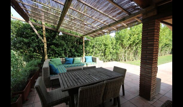 At the end of the garden, with an excellent view over the fields, you find the big pool area (fenced to protect small children). The salt water swimming pool is 10 x 4 meters and in addition, there is a small basin for young children. At the end of the pool, there is a big, covered terrace with outdoor kitchen with running water, fridge and barbecue, so you can have your meals here and cold drinks. There is also a toilet, so you will not have to enter the house.