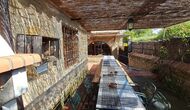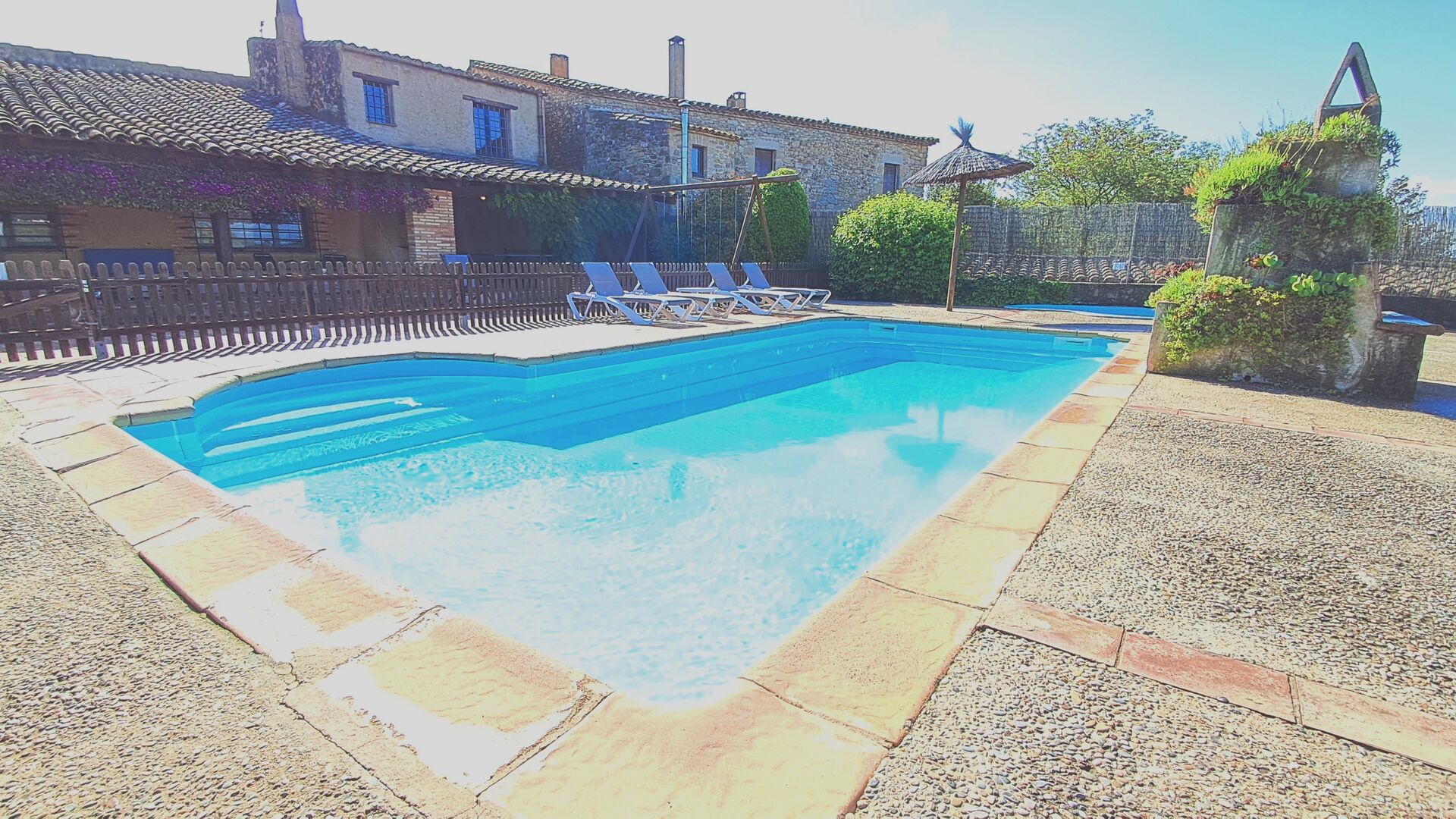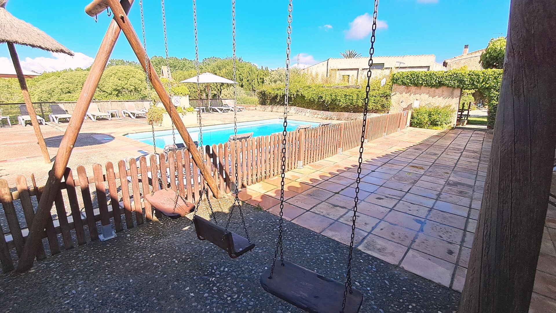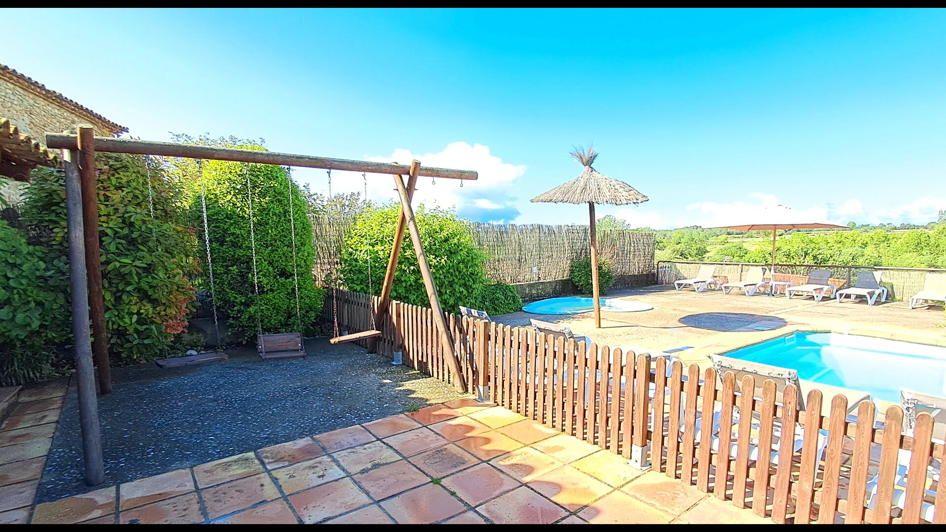 One is the shared, communal pool, with a separate round pool for the children. Both pools are in the same area, which is fenced. There are multiple sun loungers to recline and relax in as well. On the other side of the fence, there is a swing for the kids. There is also the barbecue area, a covered terrace, with chairs, a small table, and a wall-attached stone sofa. In the garden you will also find a table tennis setup, a basketball hoop, and a small football pitch.