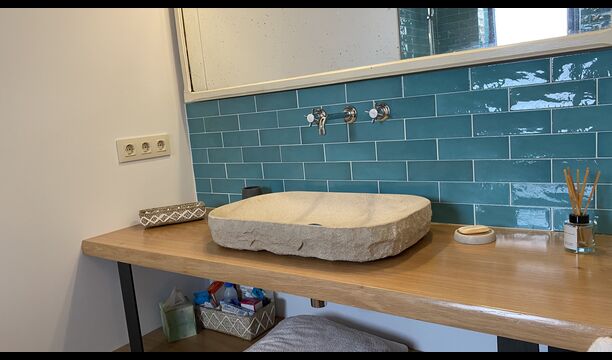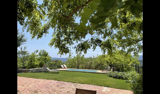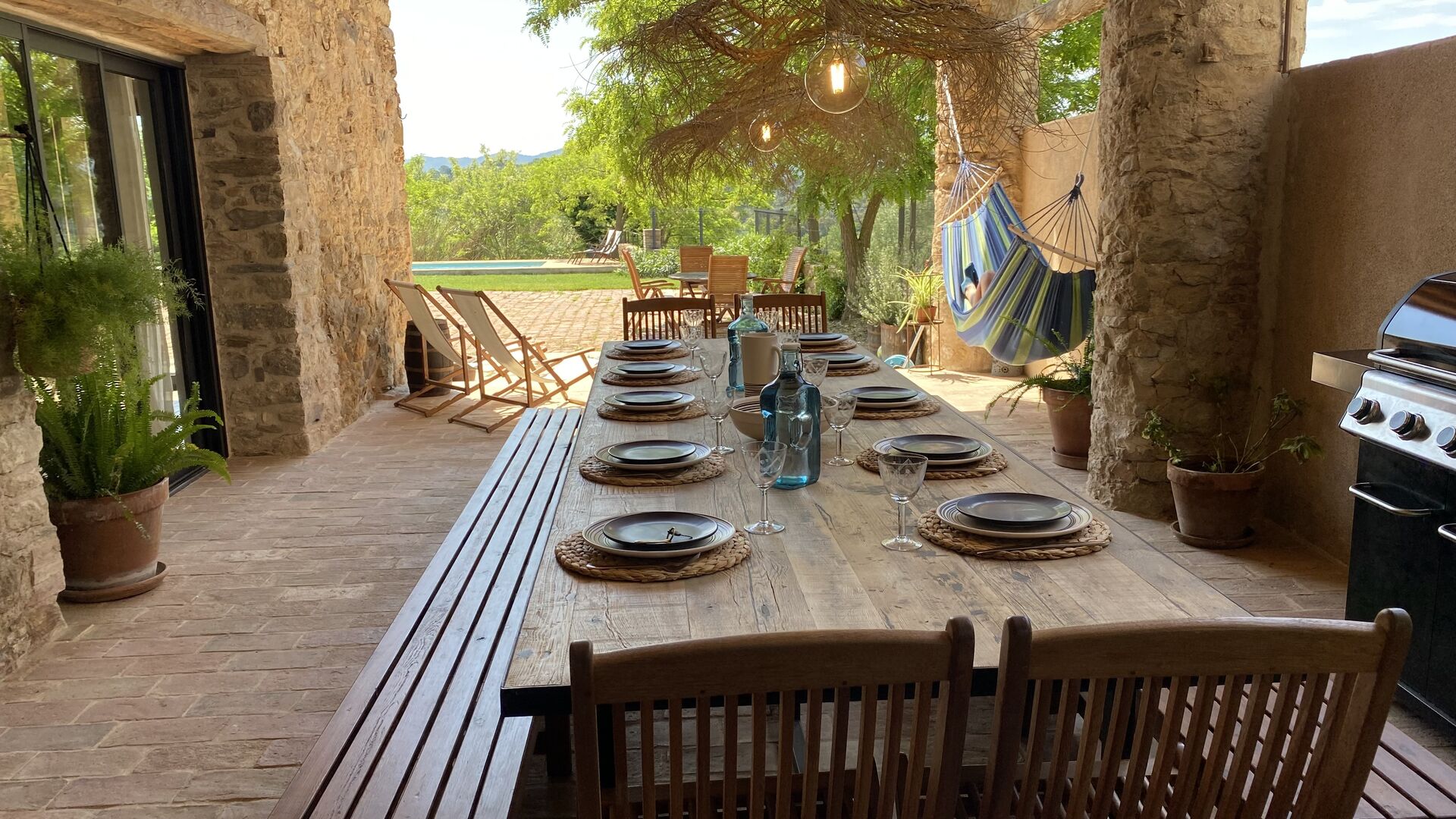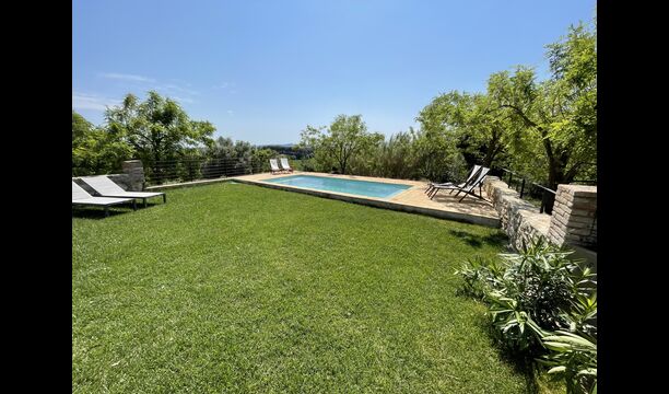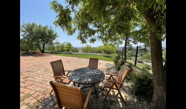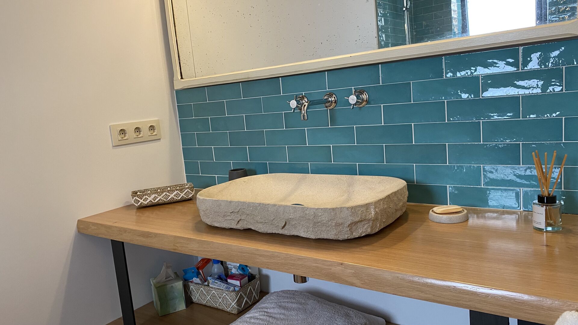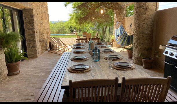 The terrace area might just be the highlight of this holiday pearl: here, the whole group can comfortably enjoy a meal together in the shade – perhaps even made on the grill right by the dining table. The outside dining area is cleverly connected directly to the kitchen inside as well. Other places on the expansive terrace include the hammock, some sun loungers, and even another shaded table with chairs, where parents perhaps could relax with a book or a glass of wine while keeping an eye on the children by the pool.