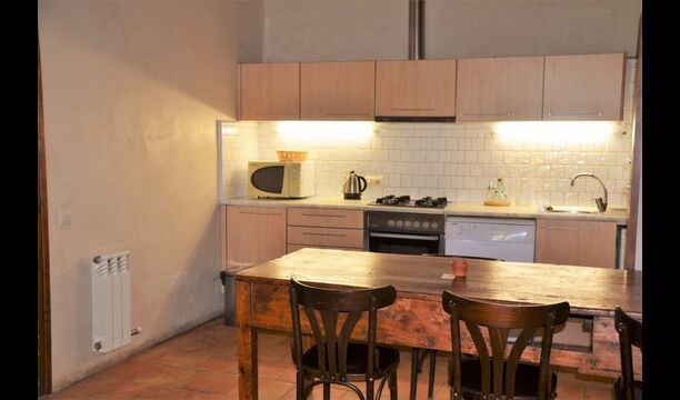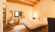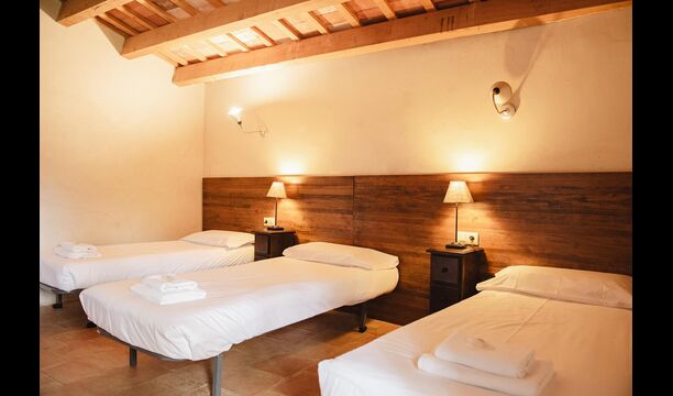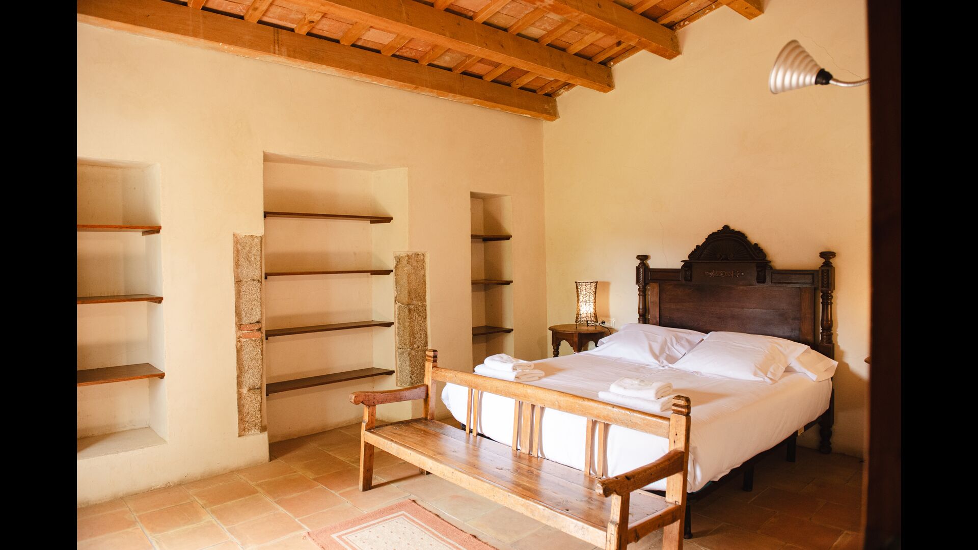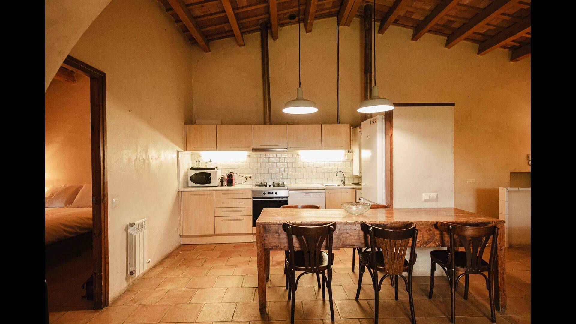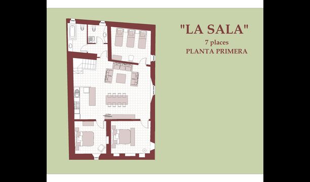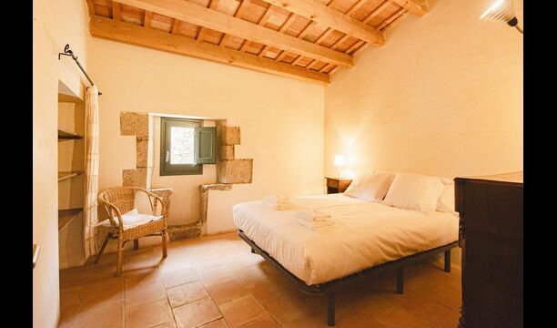 The apartment for 7+1 persons is located on the 1st floor in the main building. When you pass the through the shared activity room, you will reach La Sala and the large living room. The living room is beautifully decorated in traditional Catalan style with modern features. In the living room you will find two beautiful dining tables, three couches, a coffee table and a television. A great place to relax! On the walls of the apartment there are various paintings and wall murals providing a homely atmosphere. The fully equipped kitchen with washing machine and dishwasher is connected with the living room.