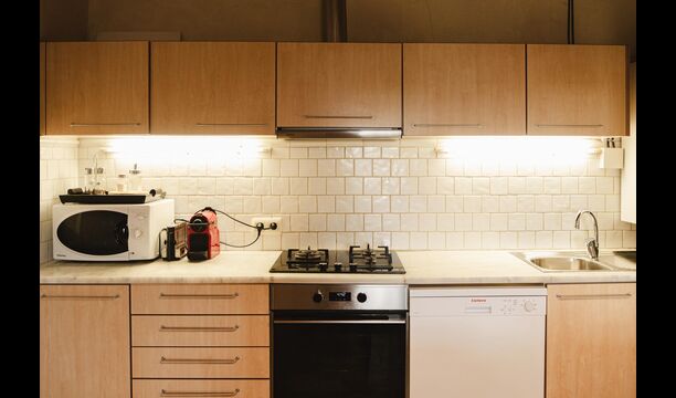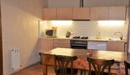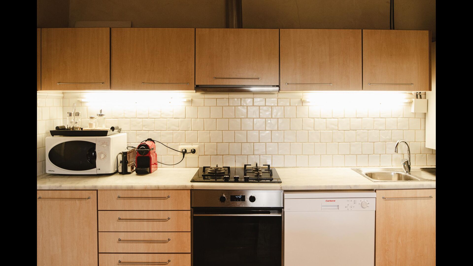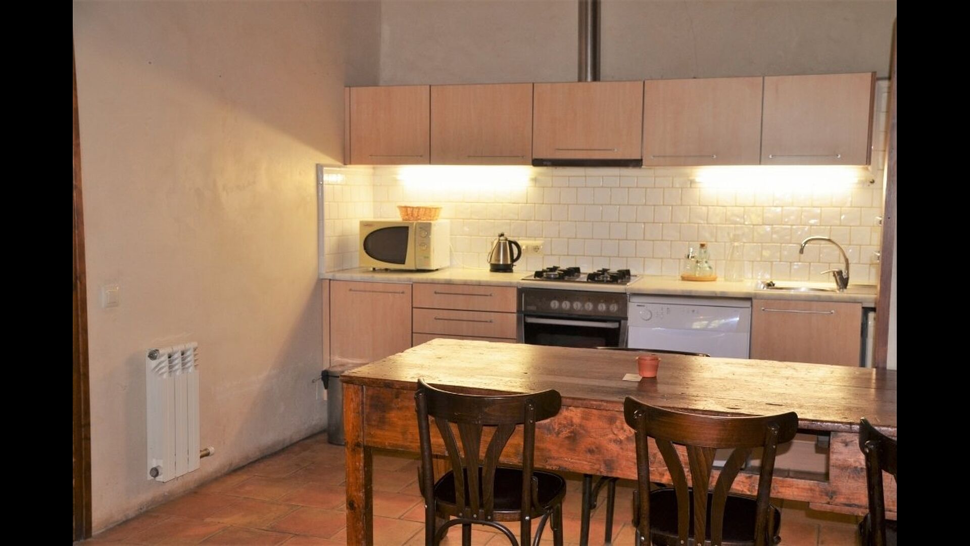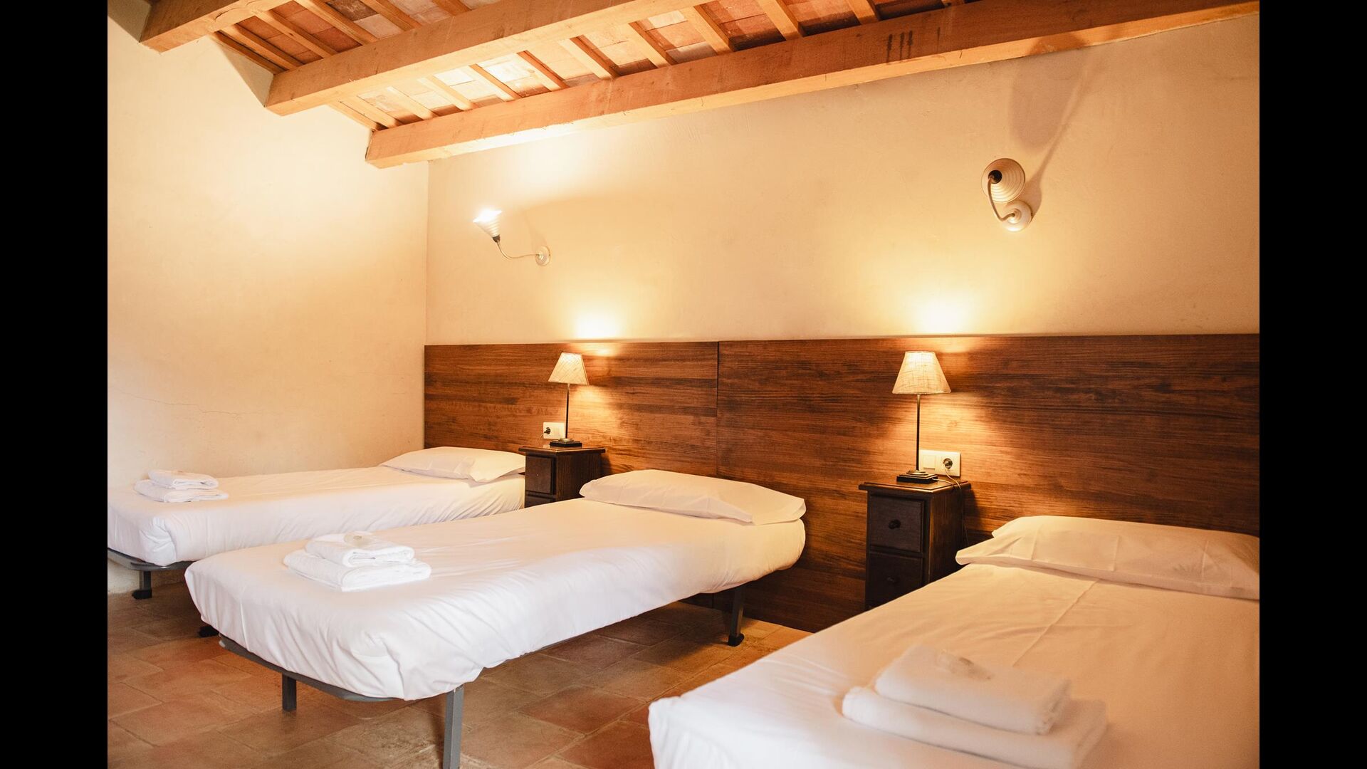 The apartment for 7+1 persons is located on the 1st floor in the main building. When you pass the through the shared activity room, you will reach La Sala and the large living room. The living room is beautifully decorated in traditional Catalan style with modern features. In the living room you will find two beautiful dining tables, three couches, a coffee table and a television. A great place to relax! On the walls of the apartment there are various paintings and wall murals providing a homely atmosphere. The fully equipped kitchen with washing machine and dishwasher is connected with the living room.
