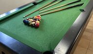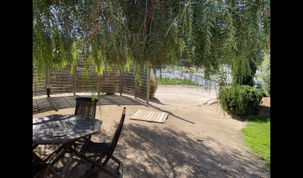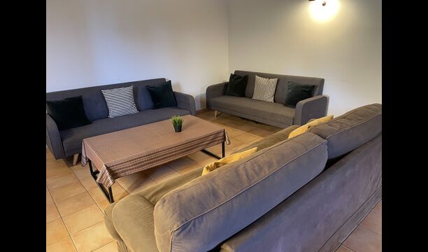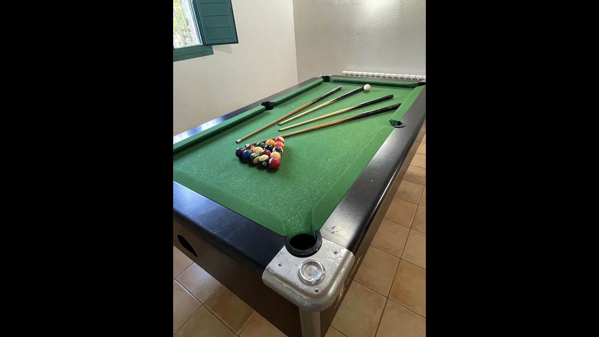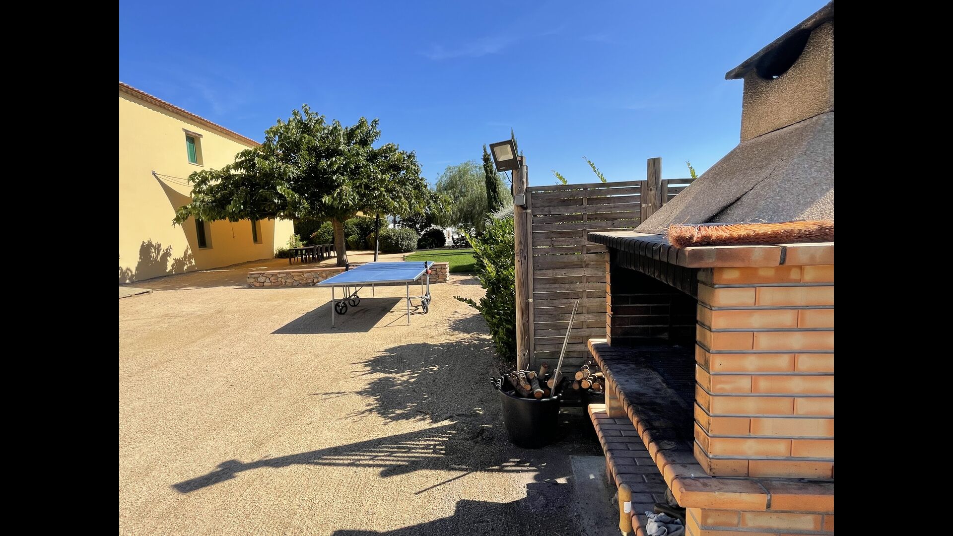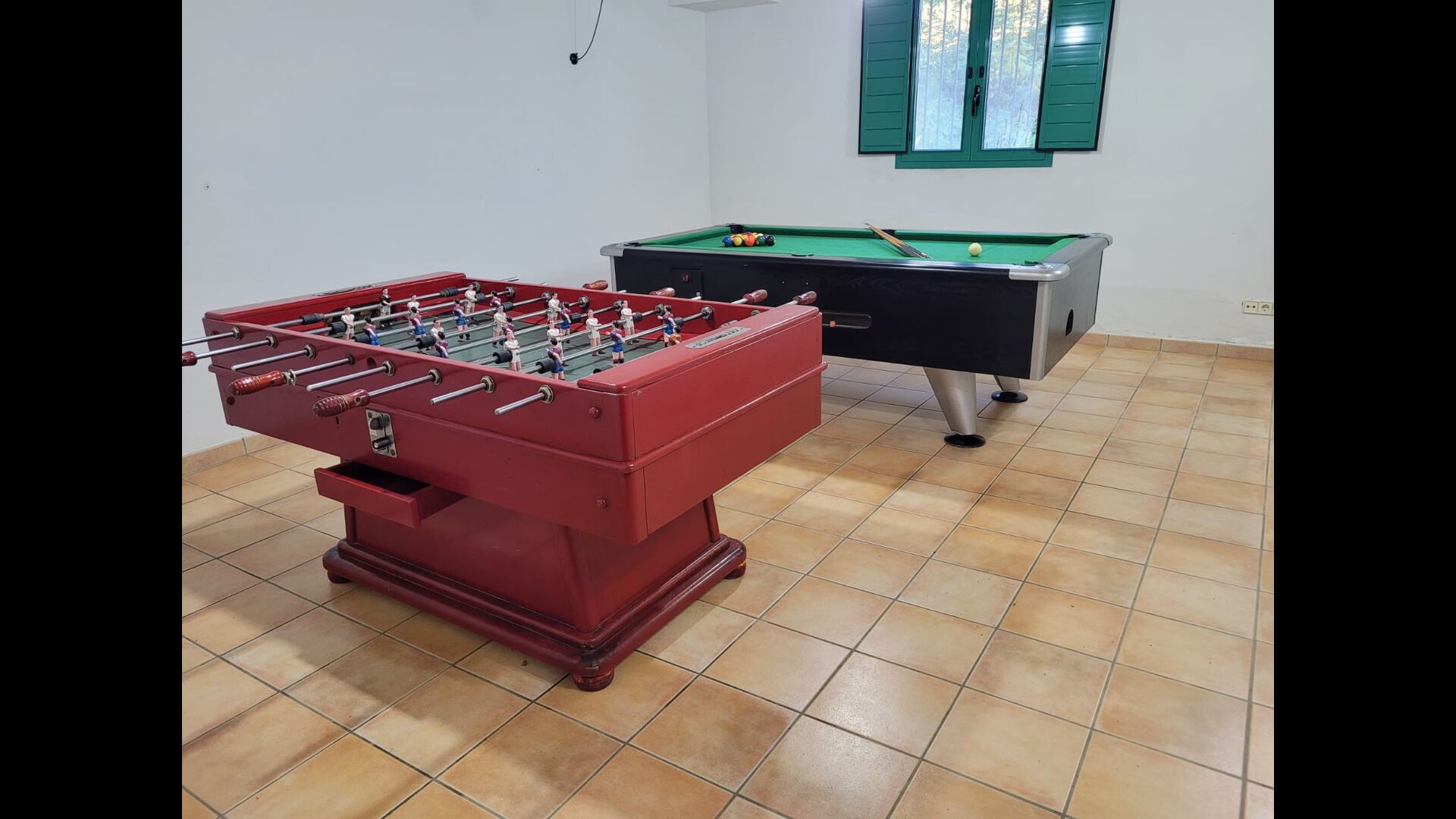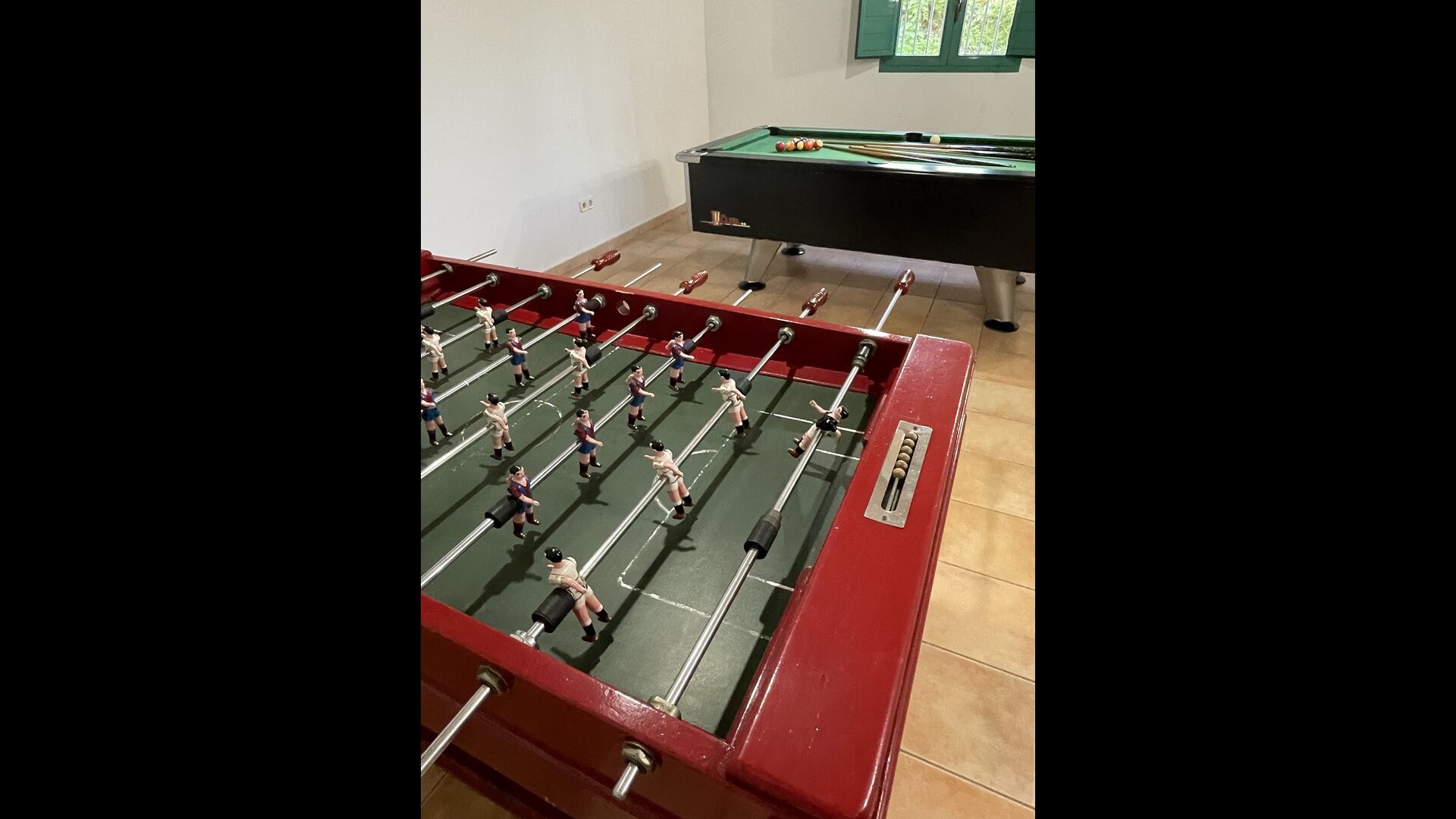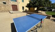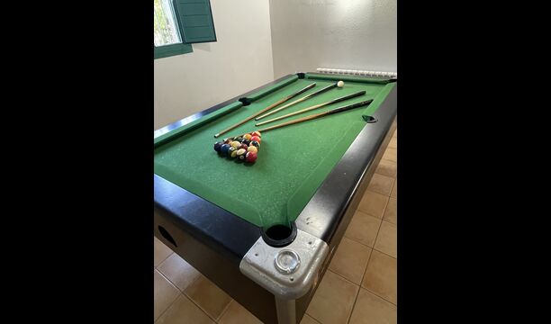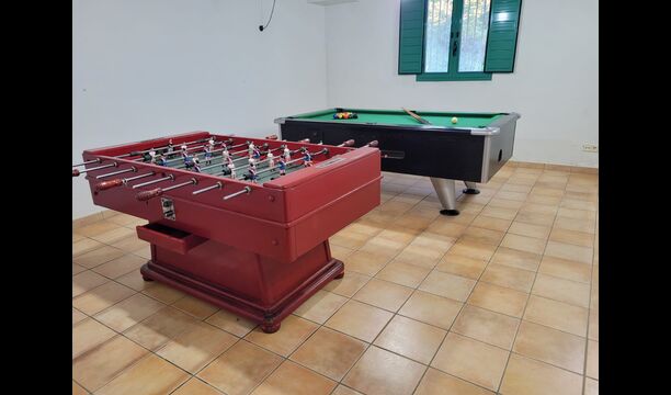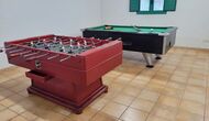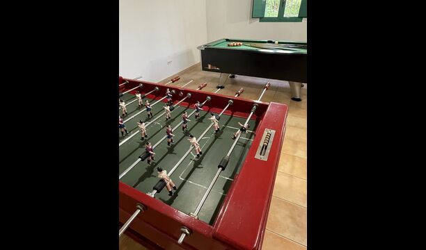 The large sitting room comes with a dining table and 3 sofas. There is also a TV. There is also the game room, containing table football, throwing darts and billiards, and in the garden, you will also find a table tennis setup. Plenty of things to keep the children – and adults - entertained! Also on the first floor you will find 2 bedrooms - both are double bedrooms.