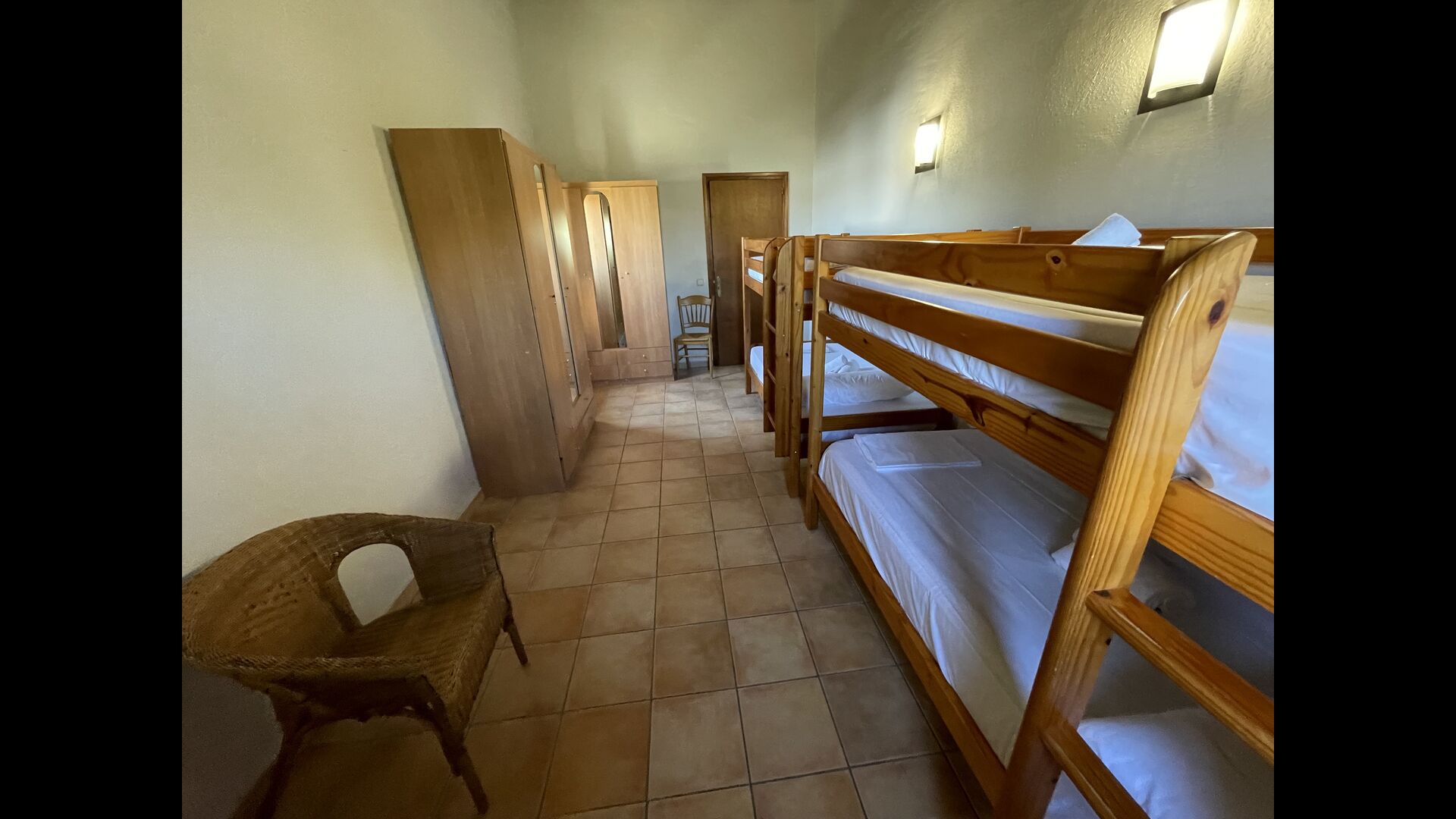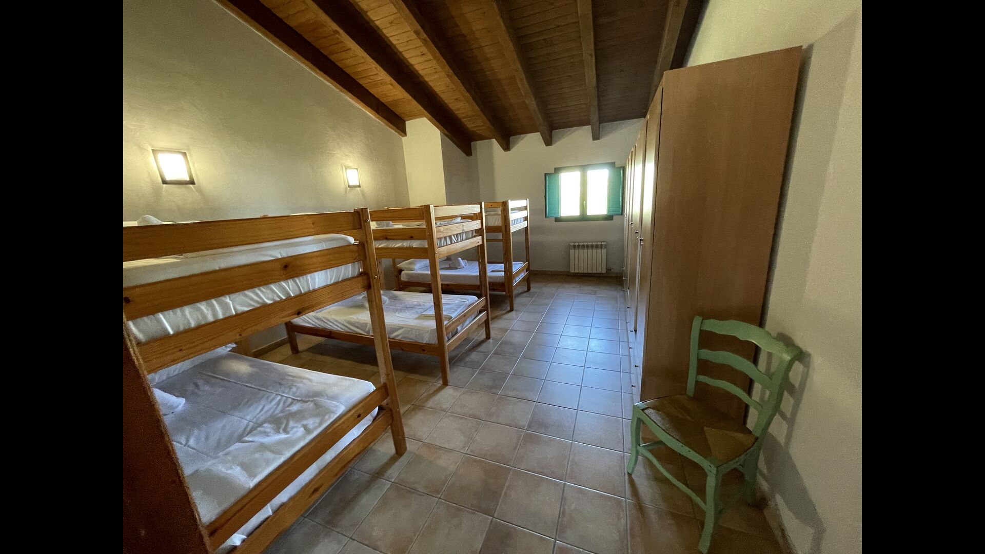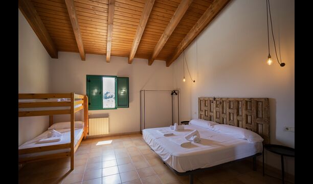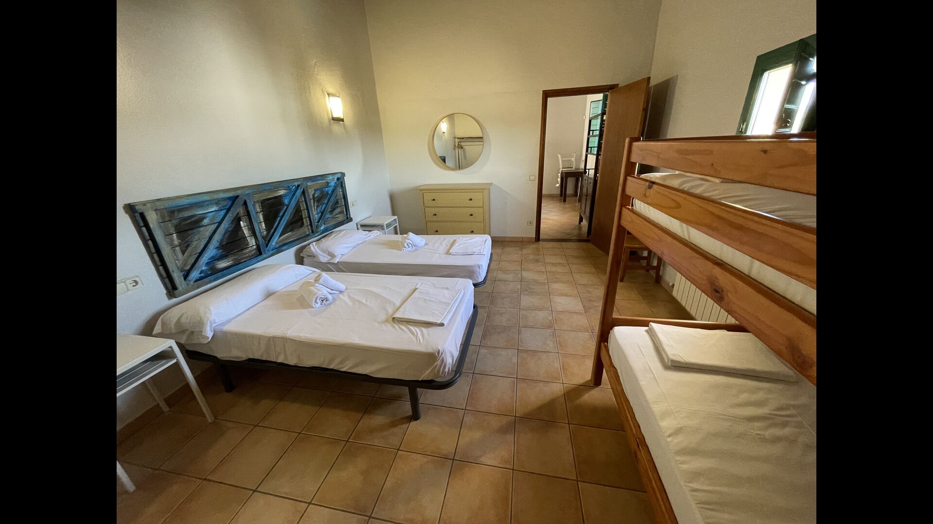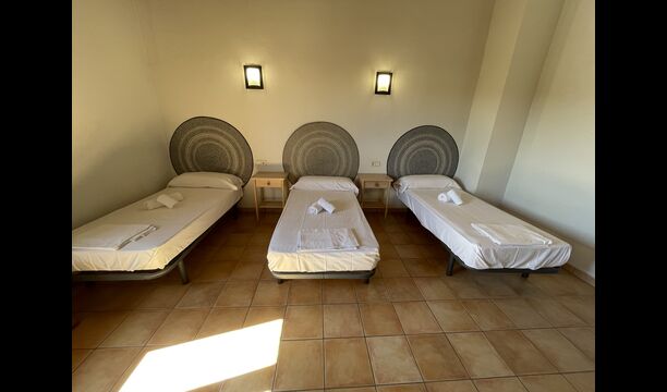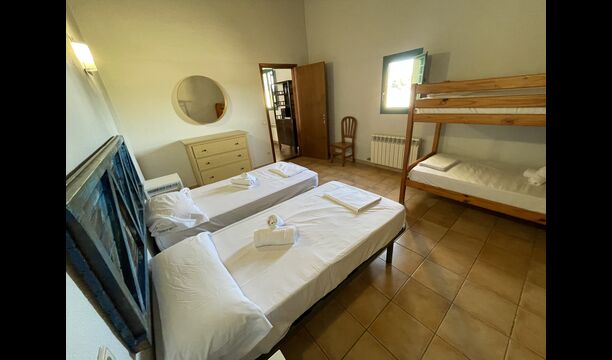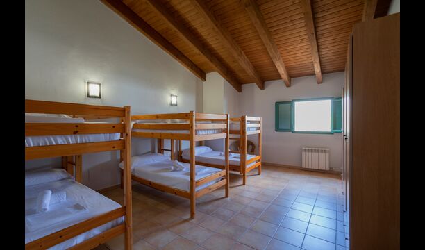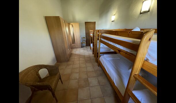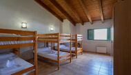 1 double bedroom with one additional single bed (ideal for parents with 1 small child); 2 rooms with 2 single beds and 1 bunk bed each; 1 room with 3 single beds, 1 room with 2 bunk beds, and 1 room with 3 bunk beds.