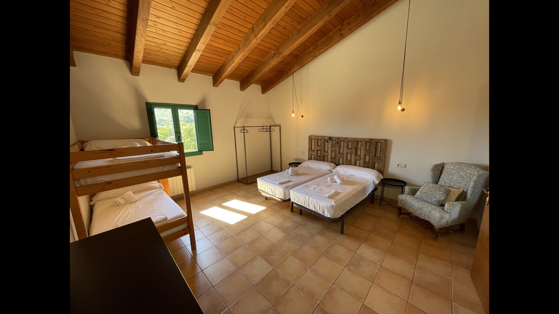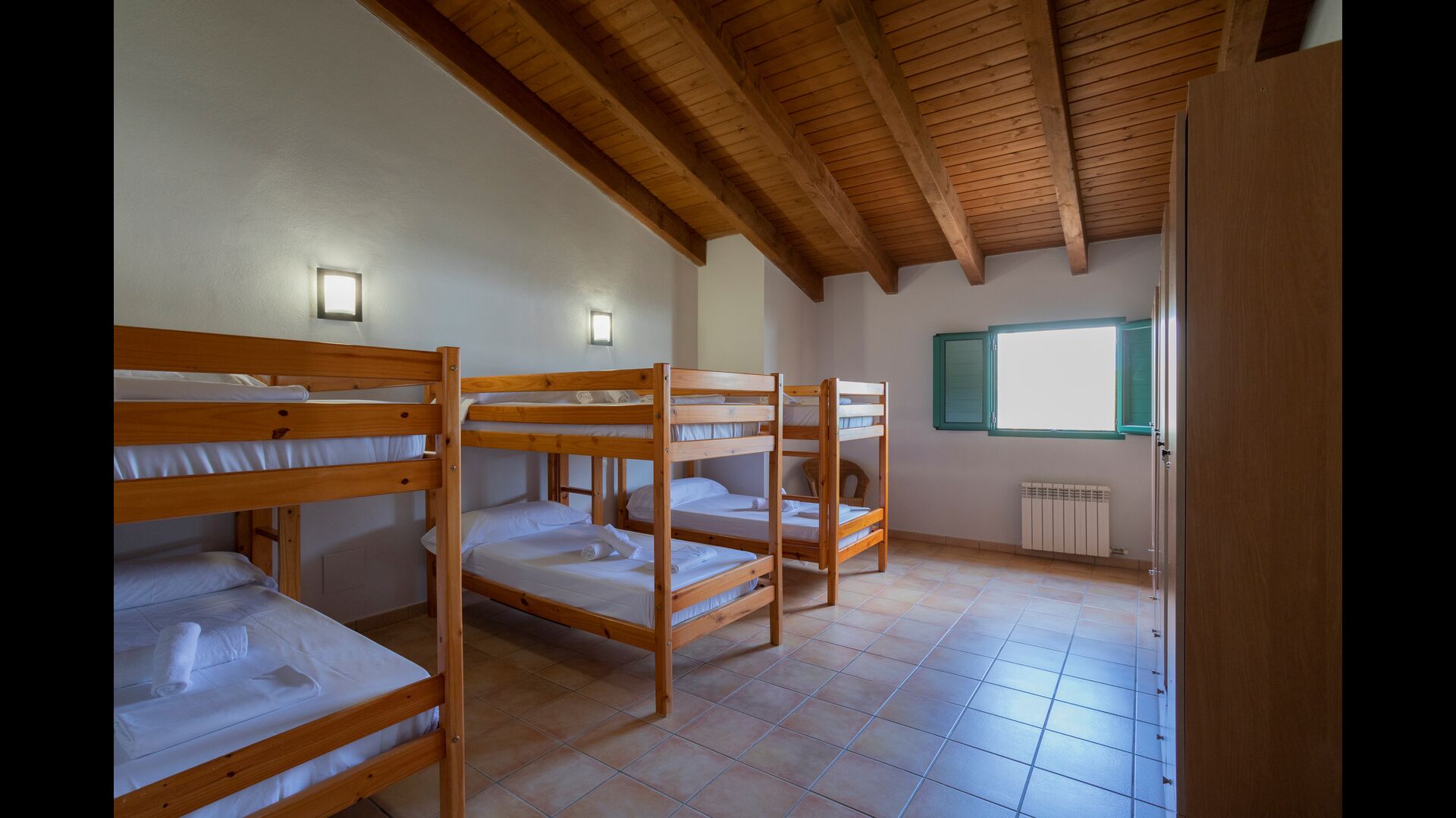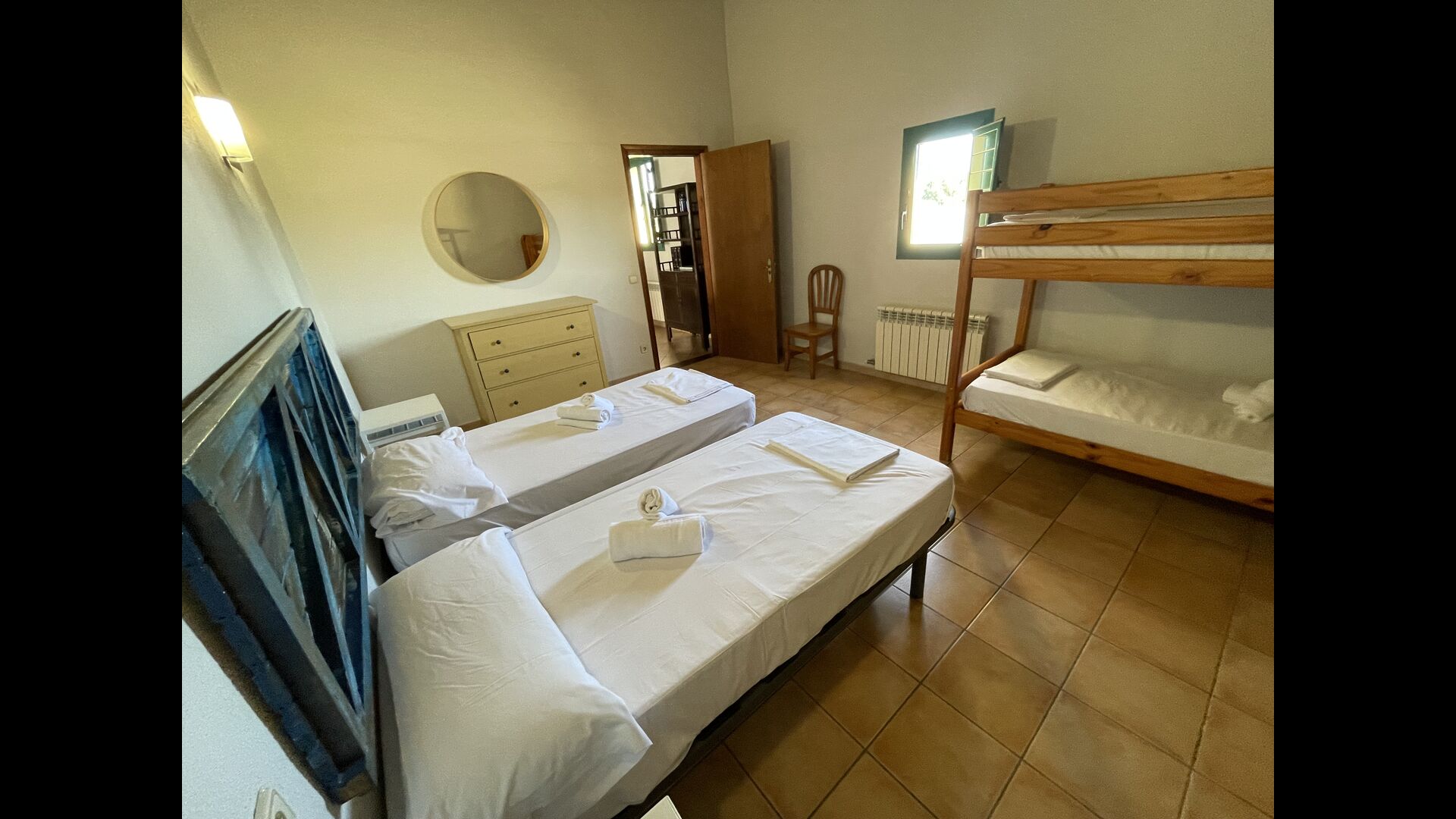 1 double bedroom with one additional single bed (ideal for parents with 1 small child); 2 rooms with 2 single beds and 1 bunk bed each; 1 room with 3 single beds, 1 room with 2 bunk beds, and 1 room with 3 bunk beds.