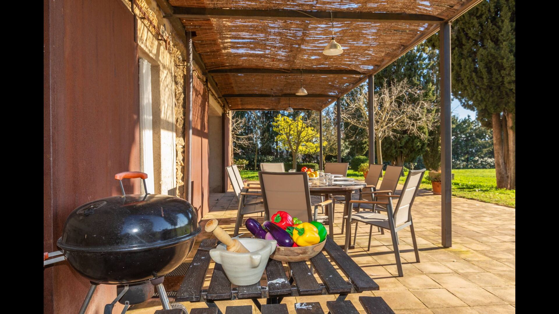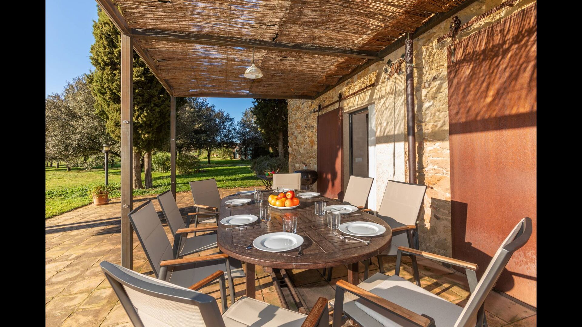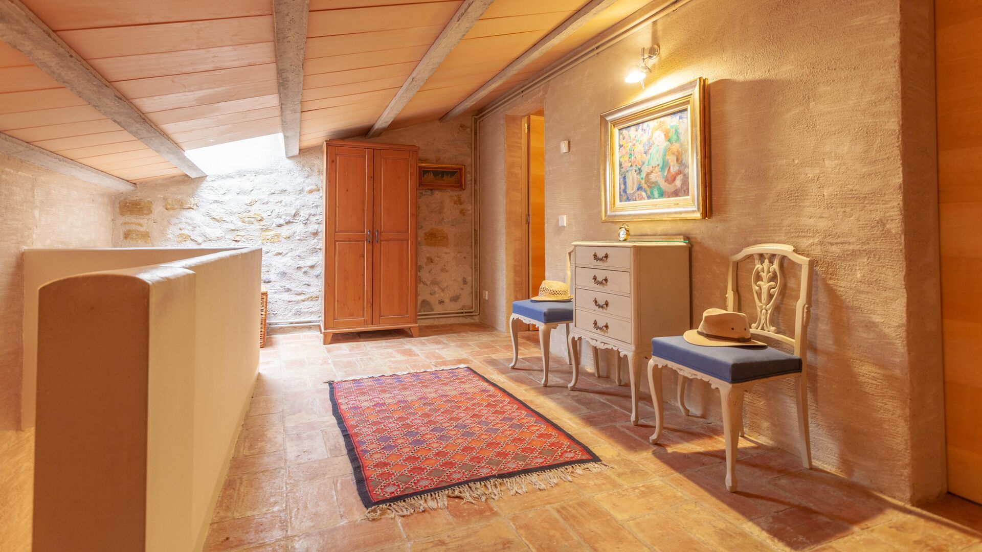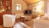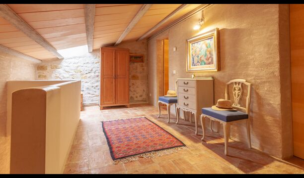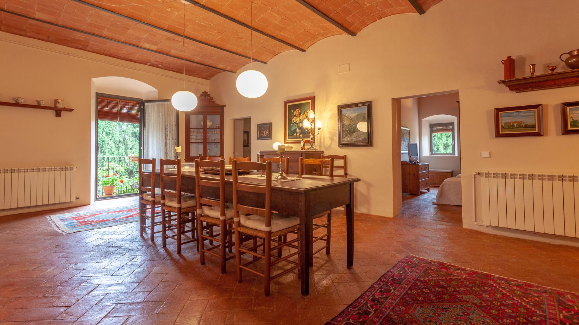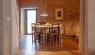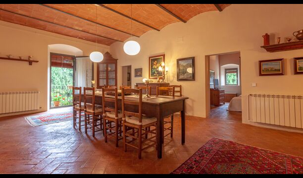 Large open-plan living and dining area connecting all rooms on this level. The original farmhouse kitchen has been renovated and fully equipped and opens onto a covered terrace with beautiful views across the entire property.