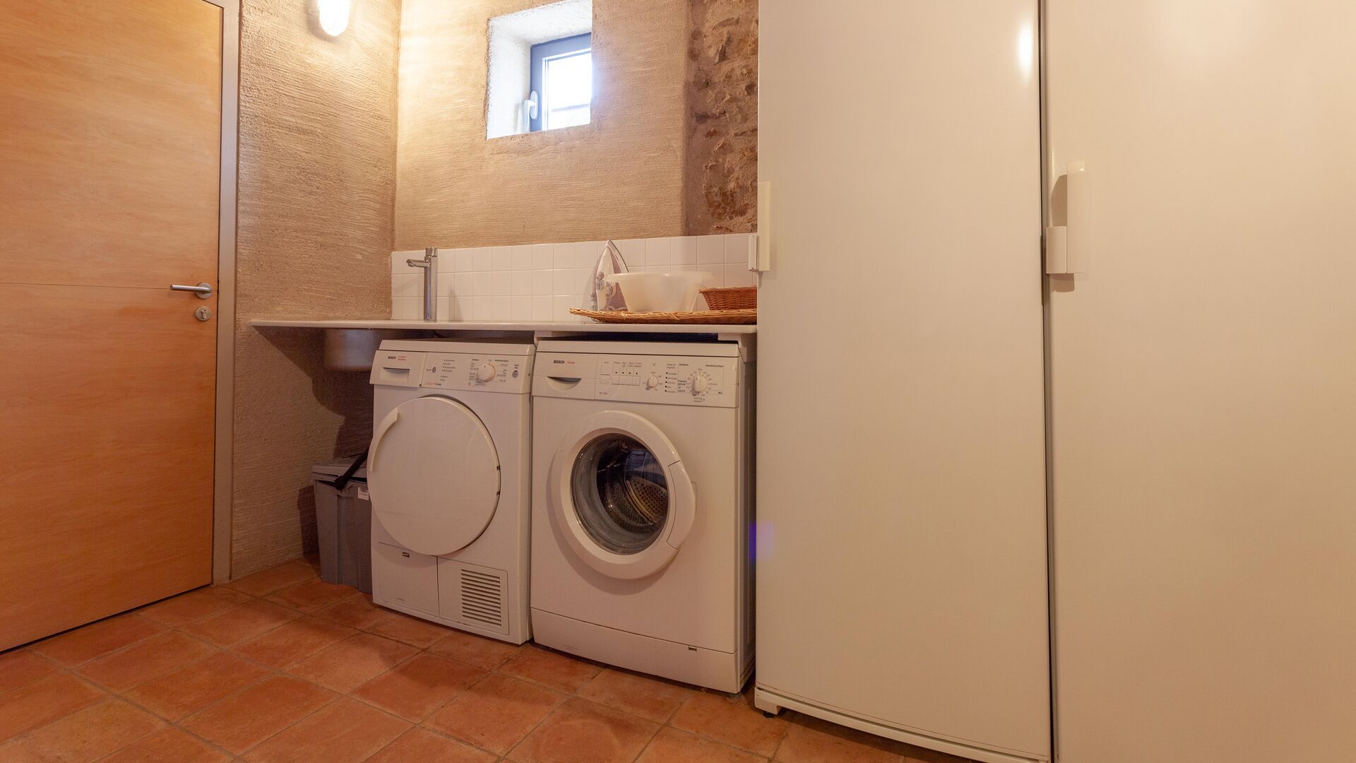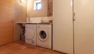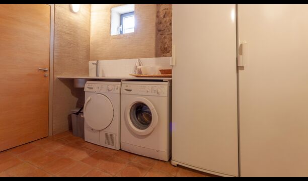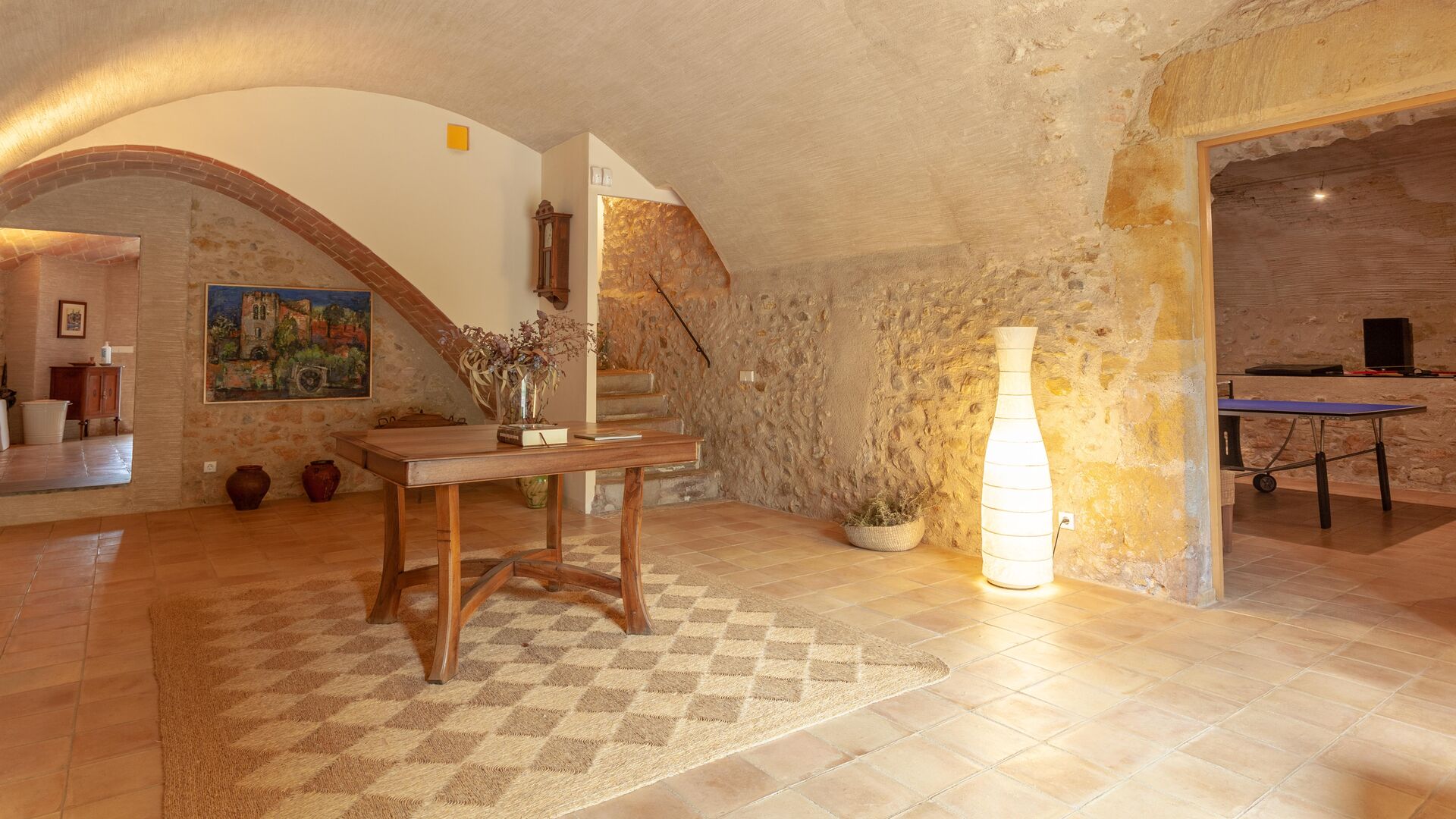 Entrance hall with Catalan vaulted ceiling, spacious living room with fireplace and access to a covered terrace, fully equipped independent kitchen with terrace access, guest WC, laundry room with washing machine, dryer and drying rack, and a versatile games or multi-purpose room opening onto a furnished outdoor porch.