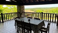 From the terrace with barbecue area, you enter the hall. If you go straight on, you will enter the “Truit” unit. It is very spacious and with high ceiling. It has a big open kitchen with all commodities, (dishwasher, microwave, oven, hot plates, washing machine). Furthermore a dining area with dining table, a sofa corner with TV and a toilet. There is access to another terrace area with garden hammock and a beautiful view.