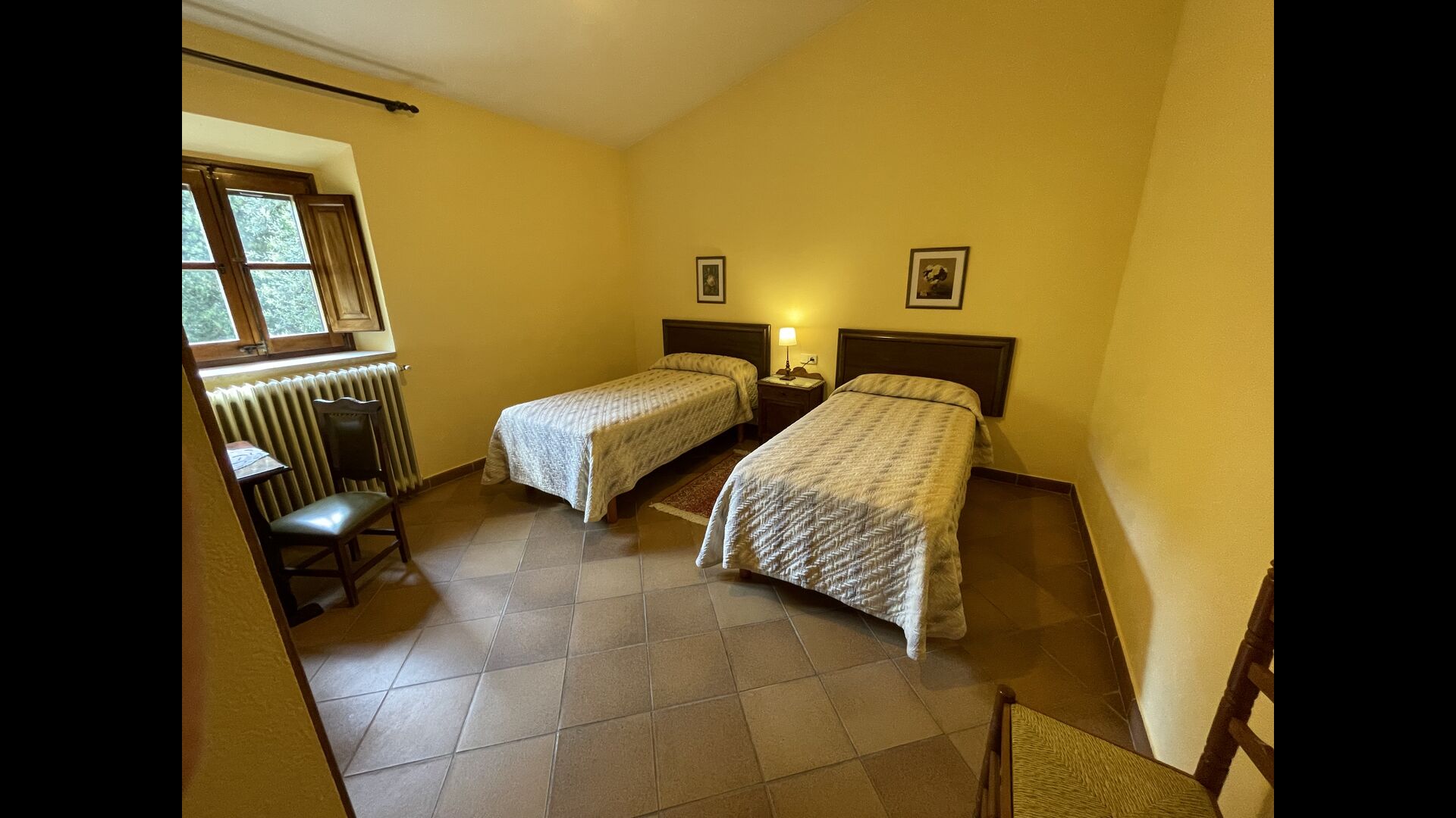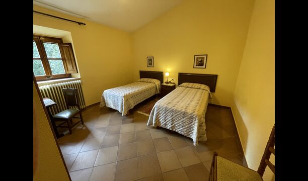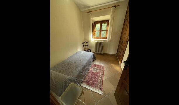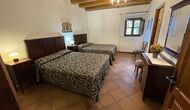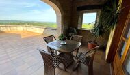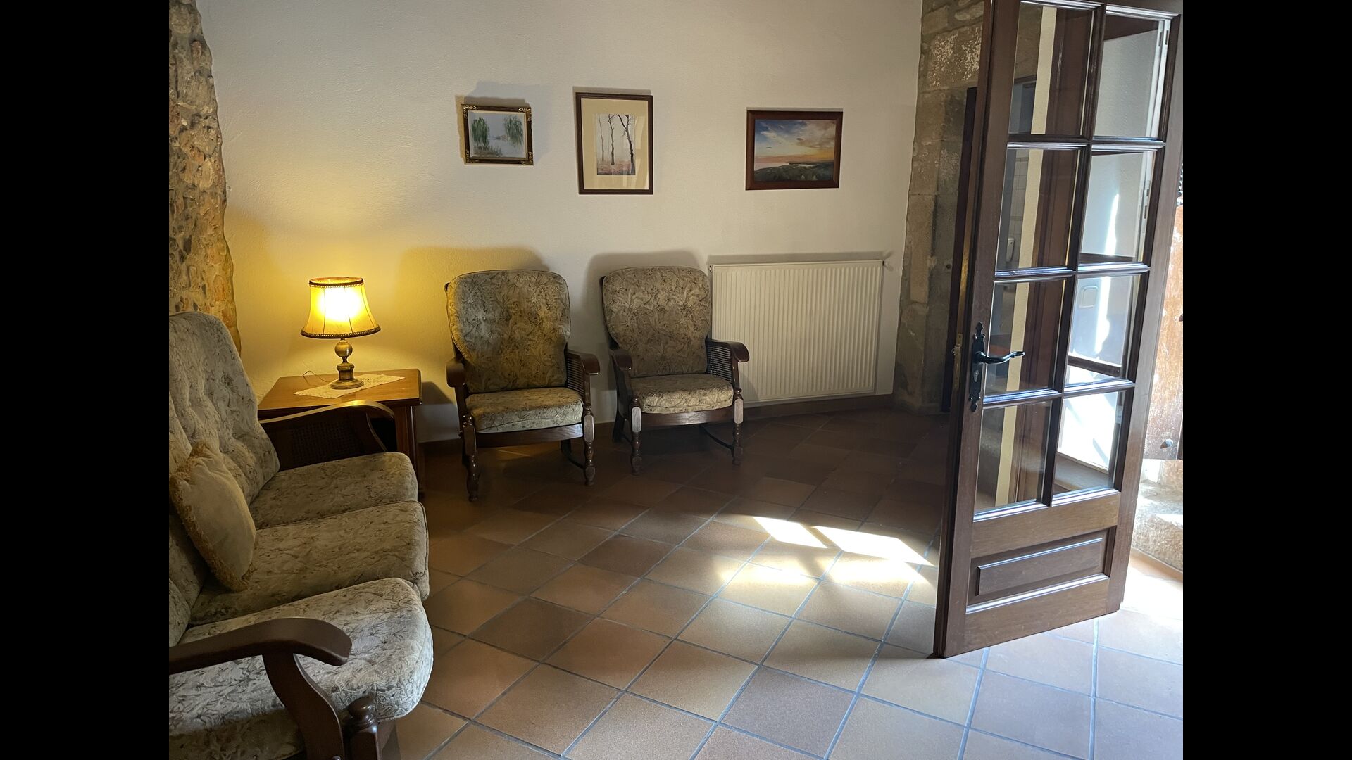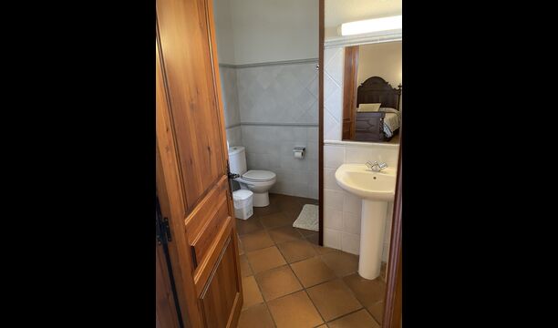 By climbing the stairs to the first floor, you enter the “Mirador” unit. This apartment has a huge terrace with a wonderful view over the landscape. It is the obvious place to gather, when you are a big group. Also the common room inside is huge and with high ceiling. There is a dining table, a sofa corner with TV and access to the separate kitchen with another dining area and dishwasher, oven, hot plates, microwave etc. There is access to 3 bedrooms, one double room, one twin room and one single room. There is one bathroom with shower.