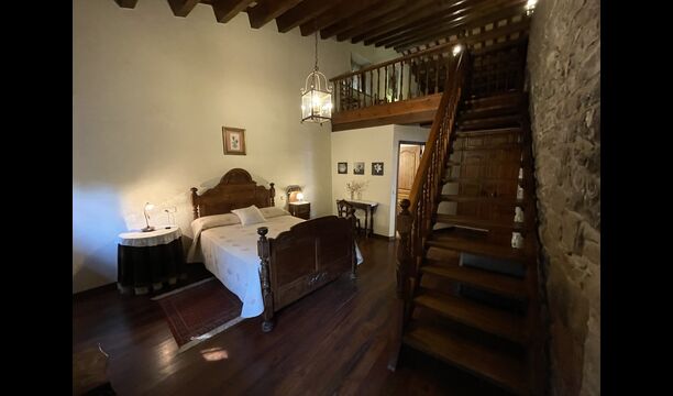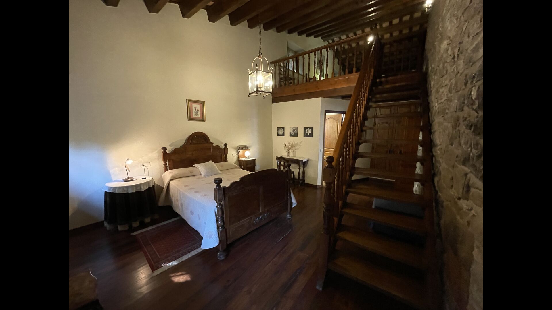 From the common room, there is access to a double room with bathroom with bathtub ensuite. On the other side of the common room, you can enter another double room with bathroom ensuite with shower. There is a very big bedroom with a double bed and two single beds and own bathroom with shower. There is a fourth double room with bathroom. Finally, there is a very spectacular room. There is a very high ceiling. In the level you enter, there is a double bed and a bathroom, and then inside the room, there is a stairway up to a loft with two single beds.