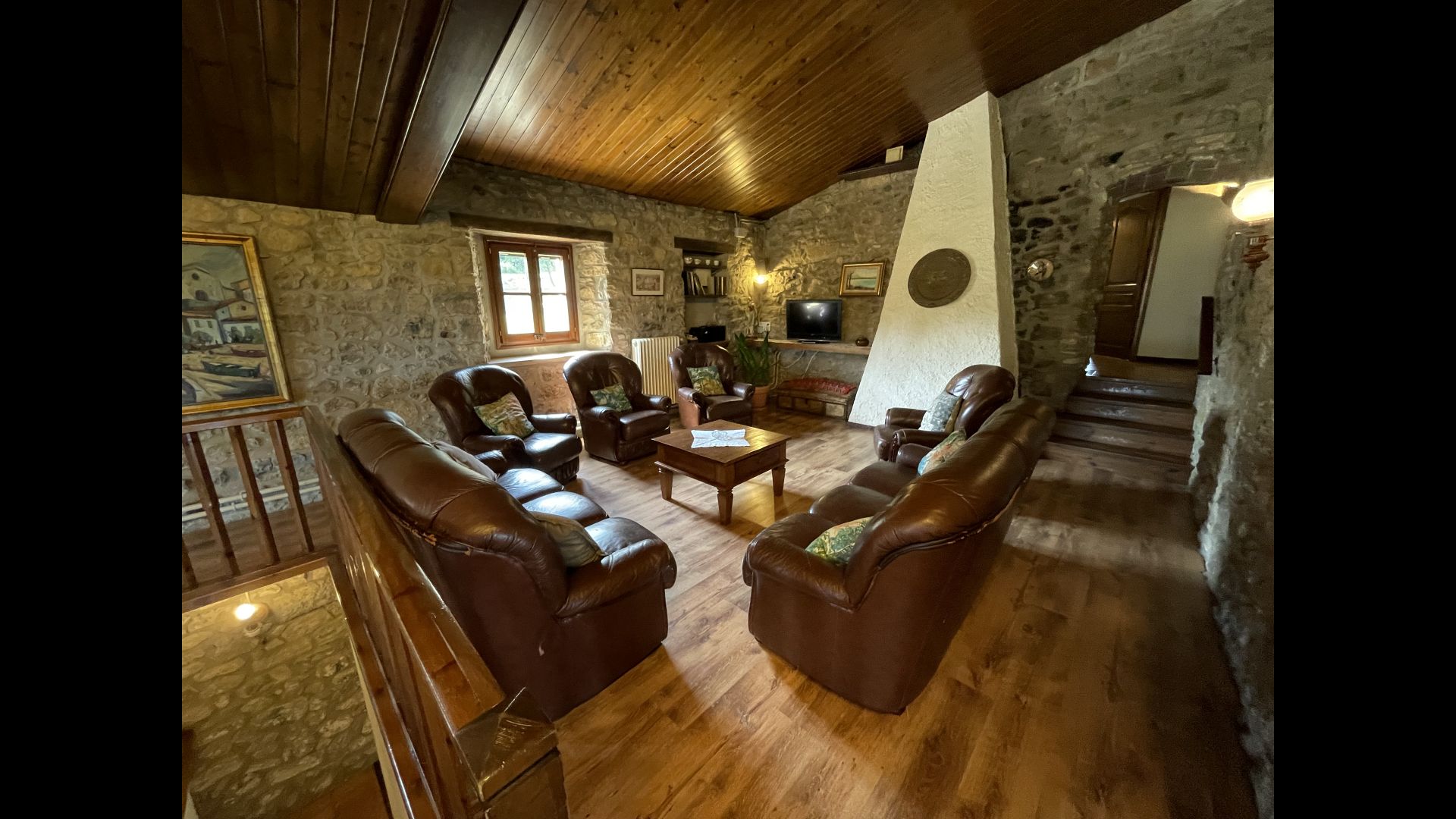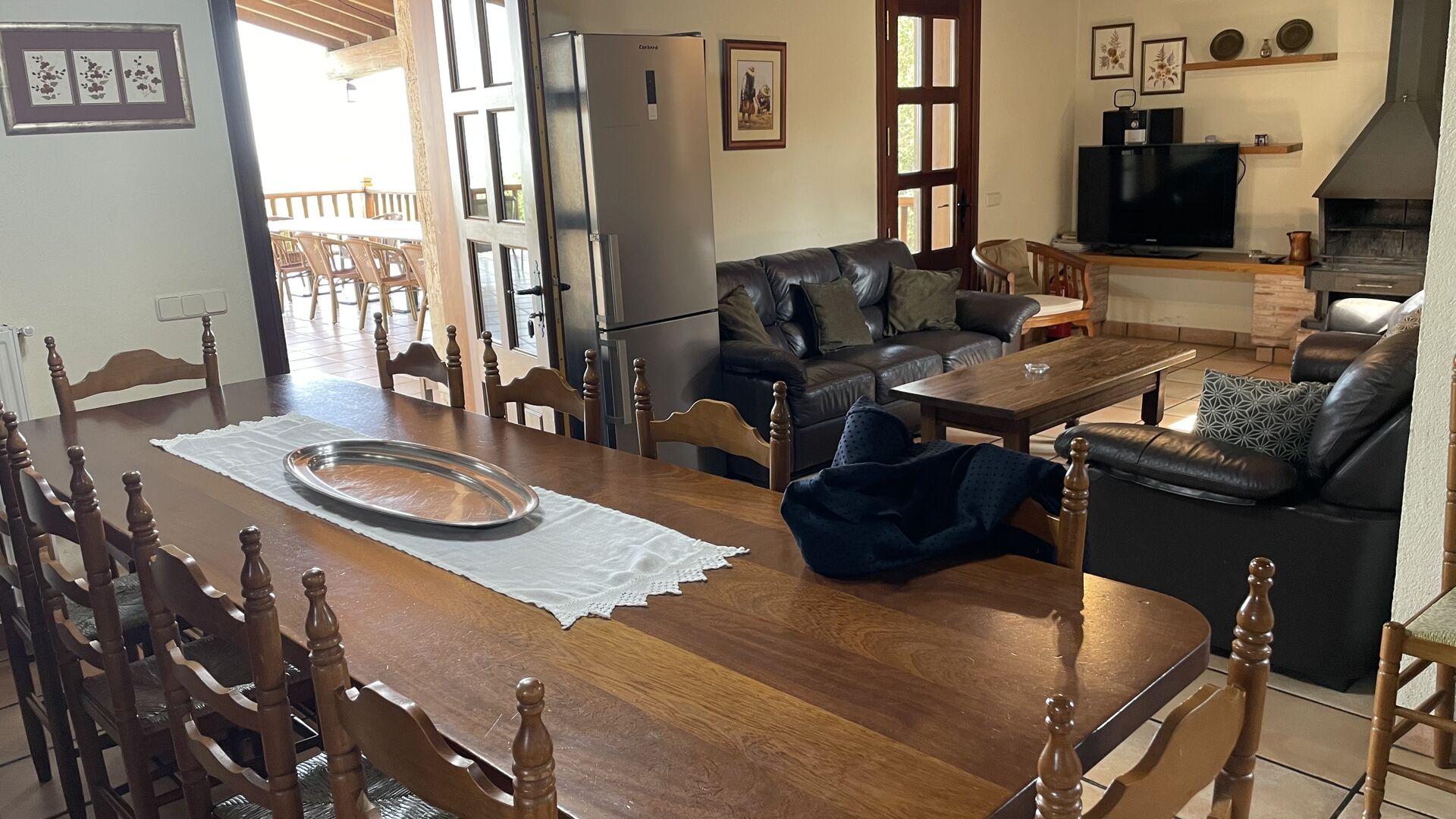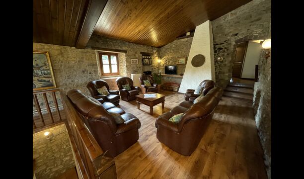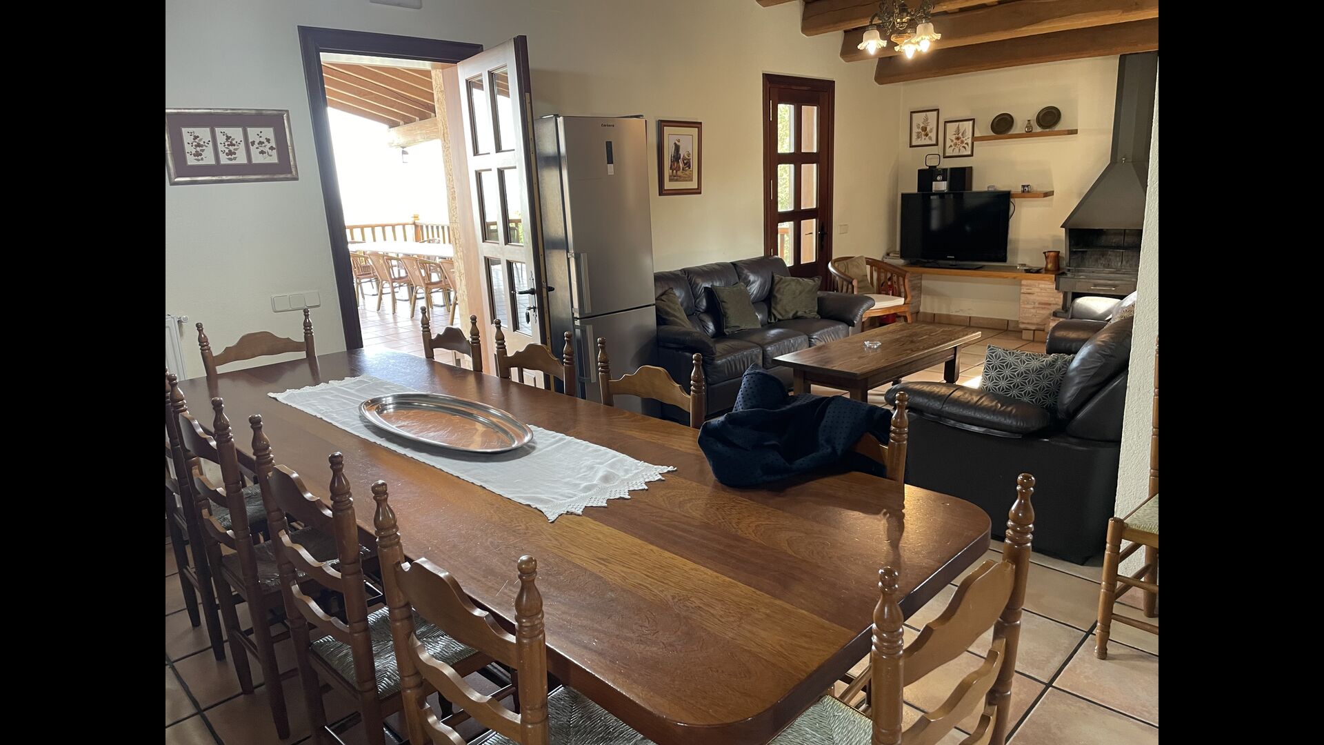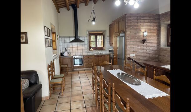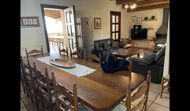 You have access to the Masover-building directly from the terrace to a big common room with dining area with a big dining table, open kitchen with hotplates, oven, microwave, dishwasher, fridge and freezer. Then there is a sitting room with TV and fireplace, and there is a toilet to be used upstairs and from the terrace.
