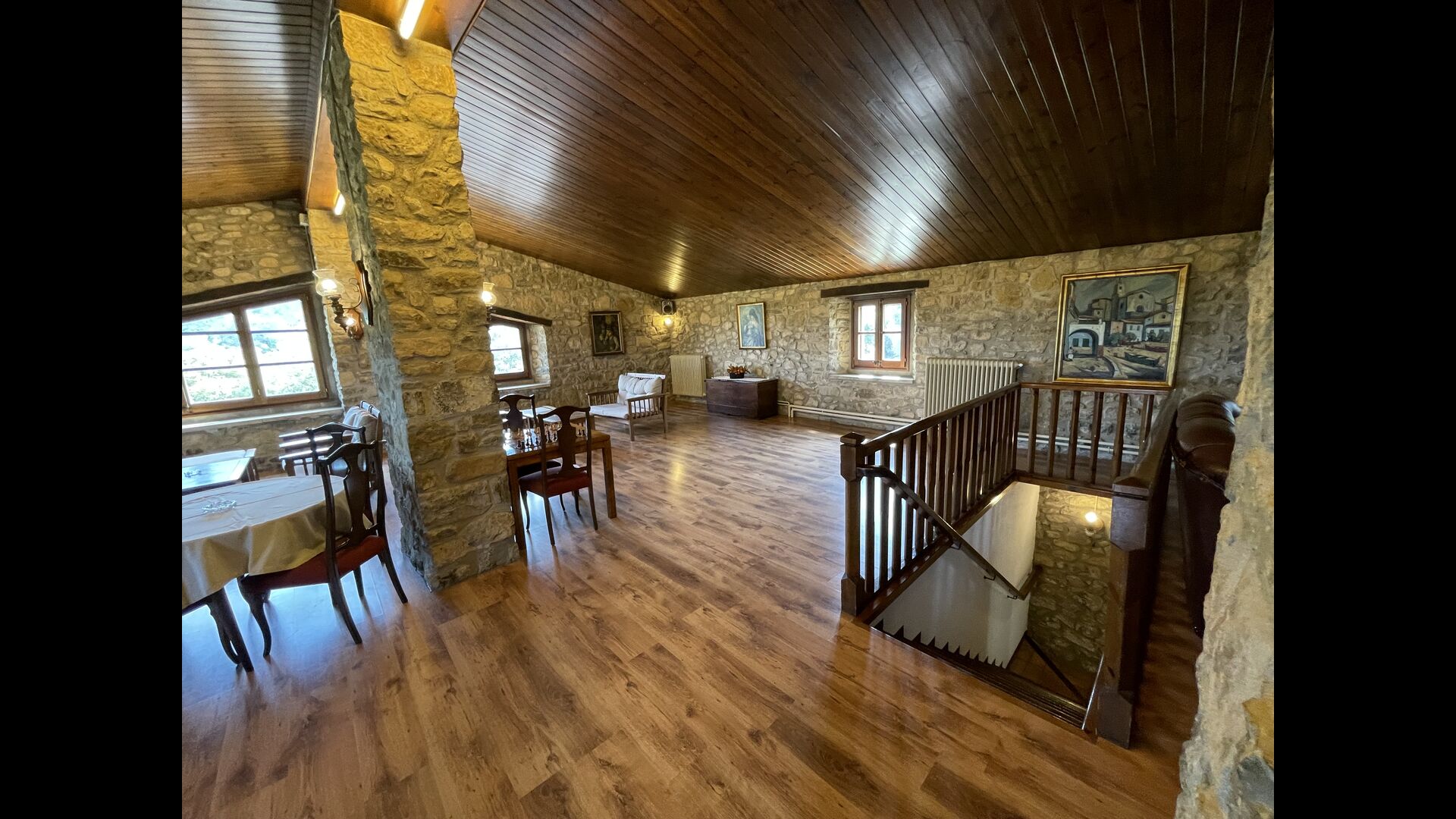 On the first floor with very high ceiling, there are a very spacious living room with different sitting zones, some with a view and one with sofas and television and stereo. There are four more bedrooms: A big double room with bathroom ensuite and a very nice view, a double room with two single beds, a small double room with 2 single beds and a bathroom with bathtub.