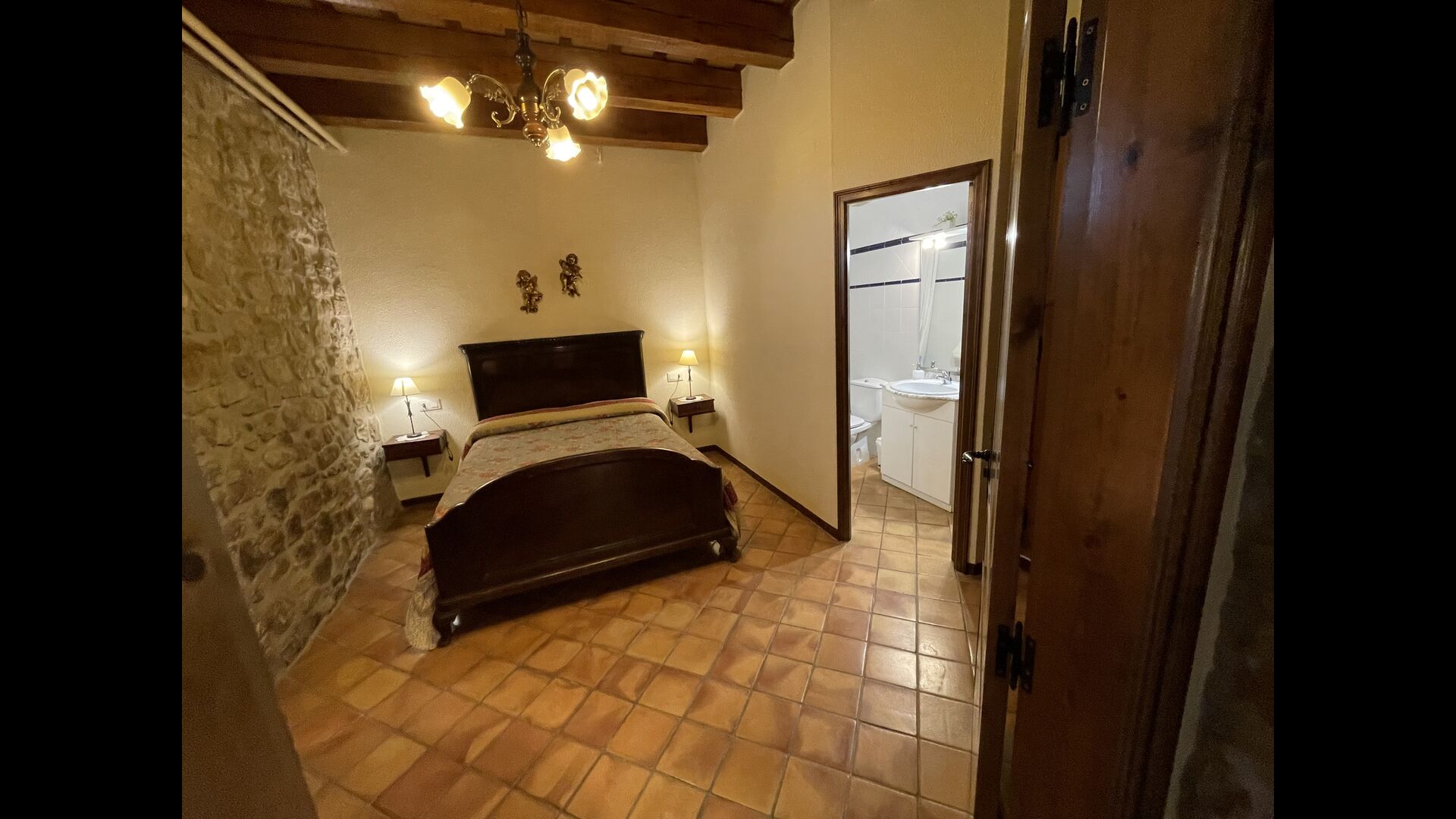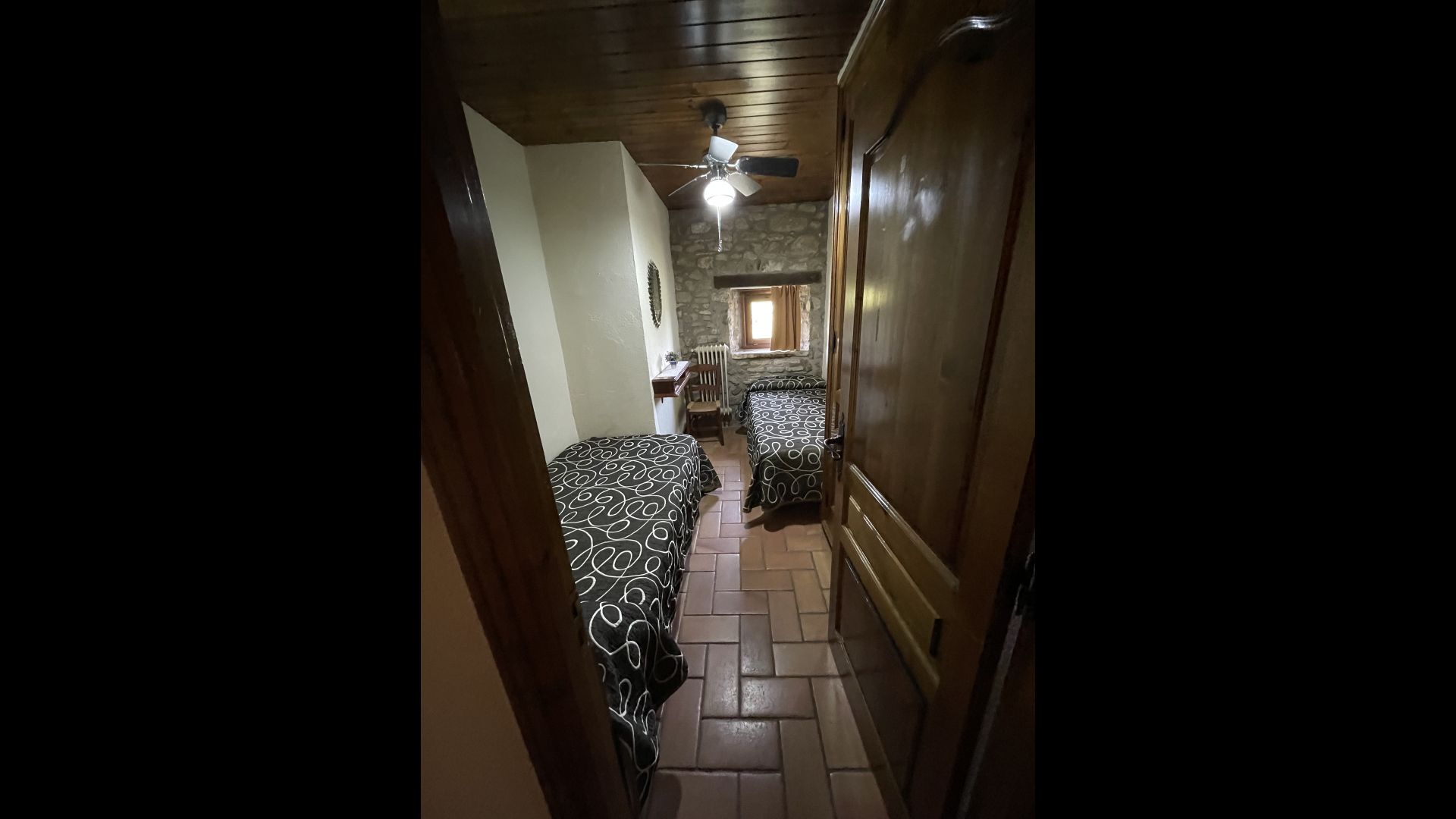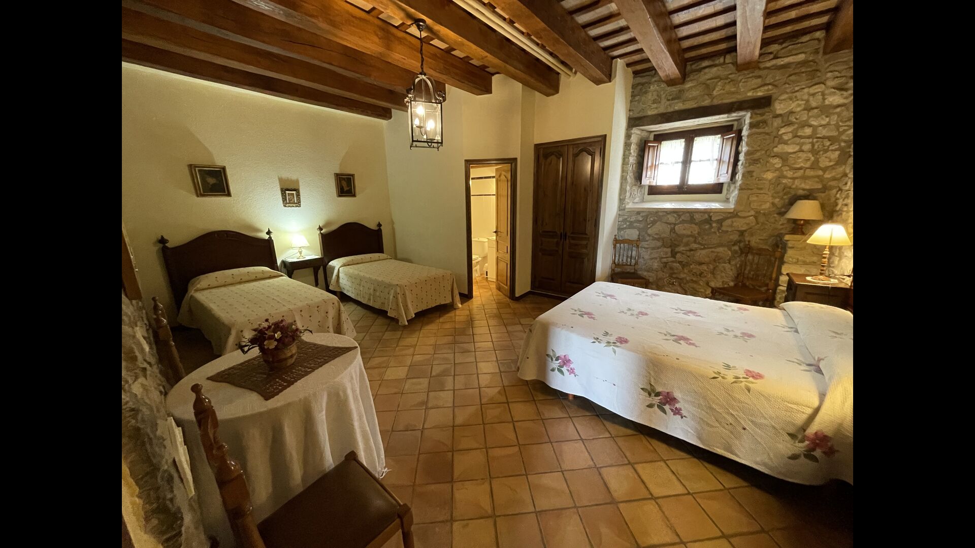 Downstairs, you find the bedrooms connected with a long aisle. There are four spacious triple rooms, all with a double bed, a single bed and bathrooms ensuite. The thick walls keep the rooms nice and cool during the summer. At the other end of the aisle, there is another exit giving direct access to the pool area.