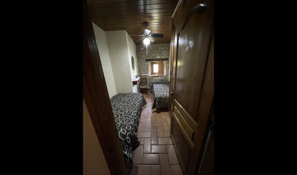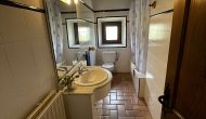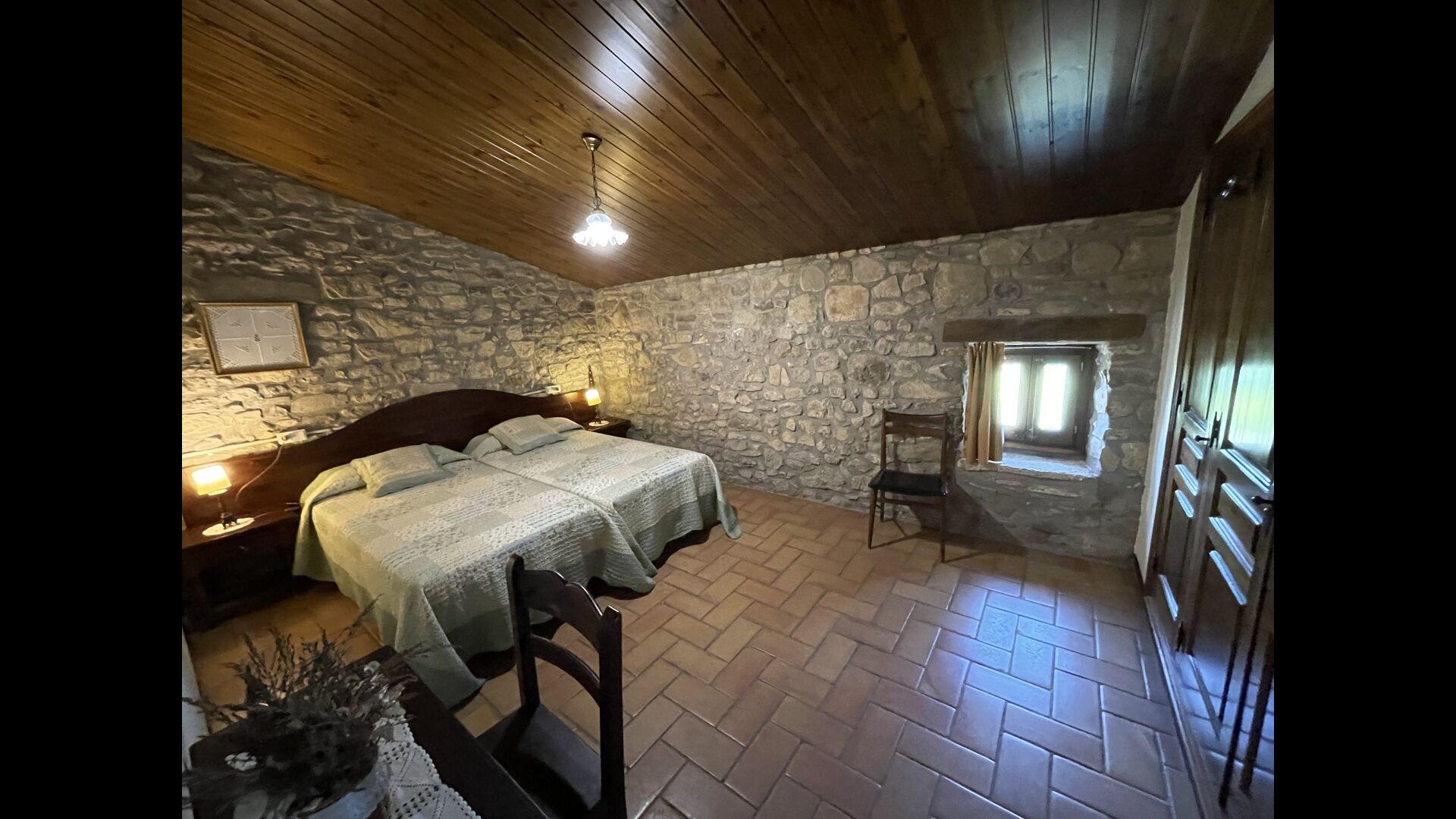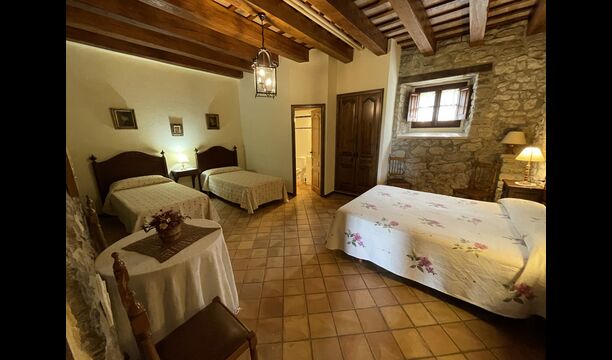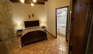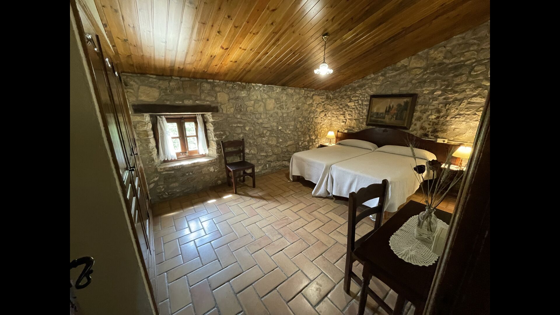 Downstairs, you find the bedrooms connected with a long aisle. There are four spacious triple rooms, all with a double bed, a single bed and bathrooms ensuite. The thick walls keep the rooms nice and cool during the summer. At the other end of the aisle, there is another exit giving direct access to the pool area.