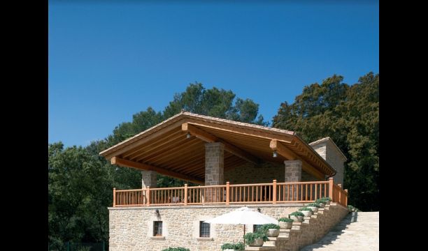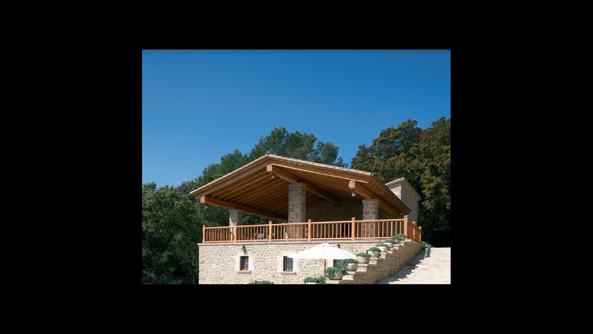From the road, following in distance the shore of the idyllic Banyoles lake, you turn right to drive uphill through a tiny forest until you arrive to the impressive driveway in front of the house. The house has two buildings, the main building and the side building also called Masover. Below the building, you have the large pool area with sun loungers, or if you prefer the shade, you can enjoy life on the very big terrace one level above the pool area.