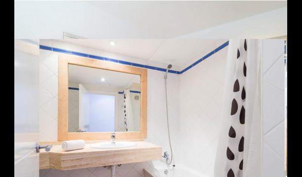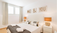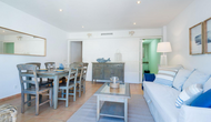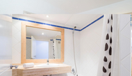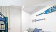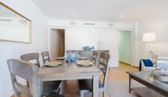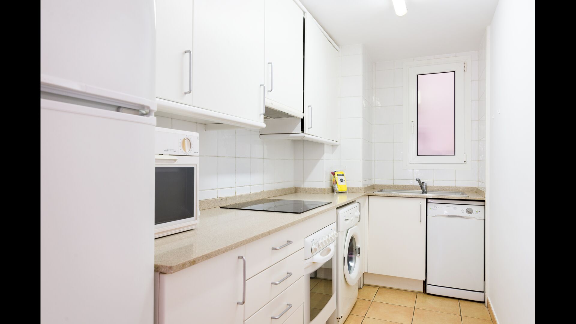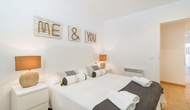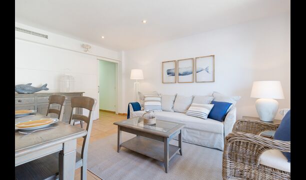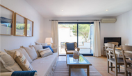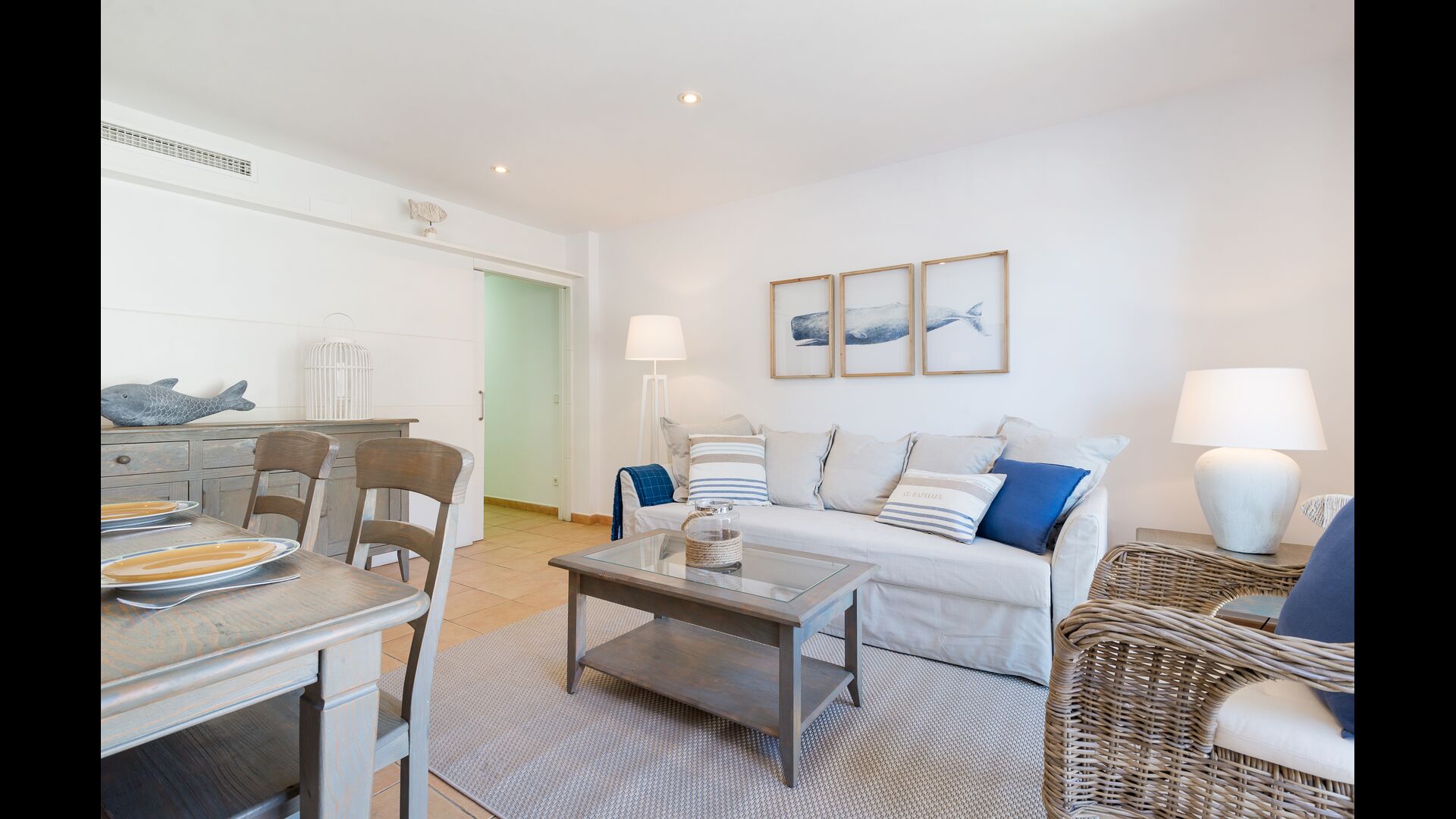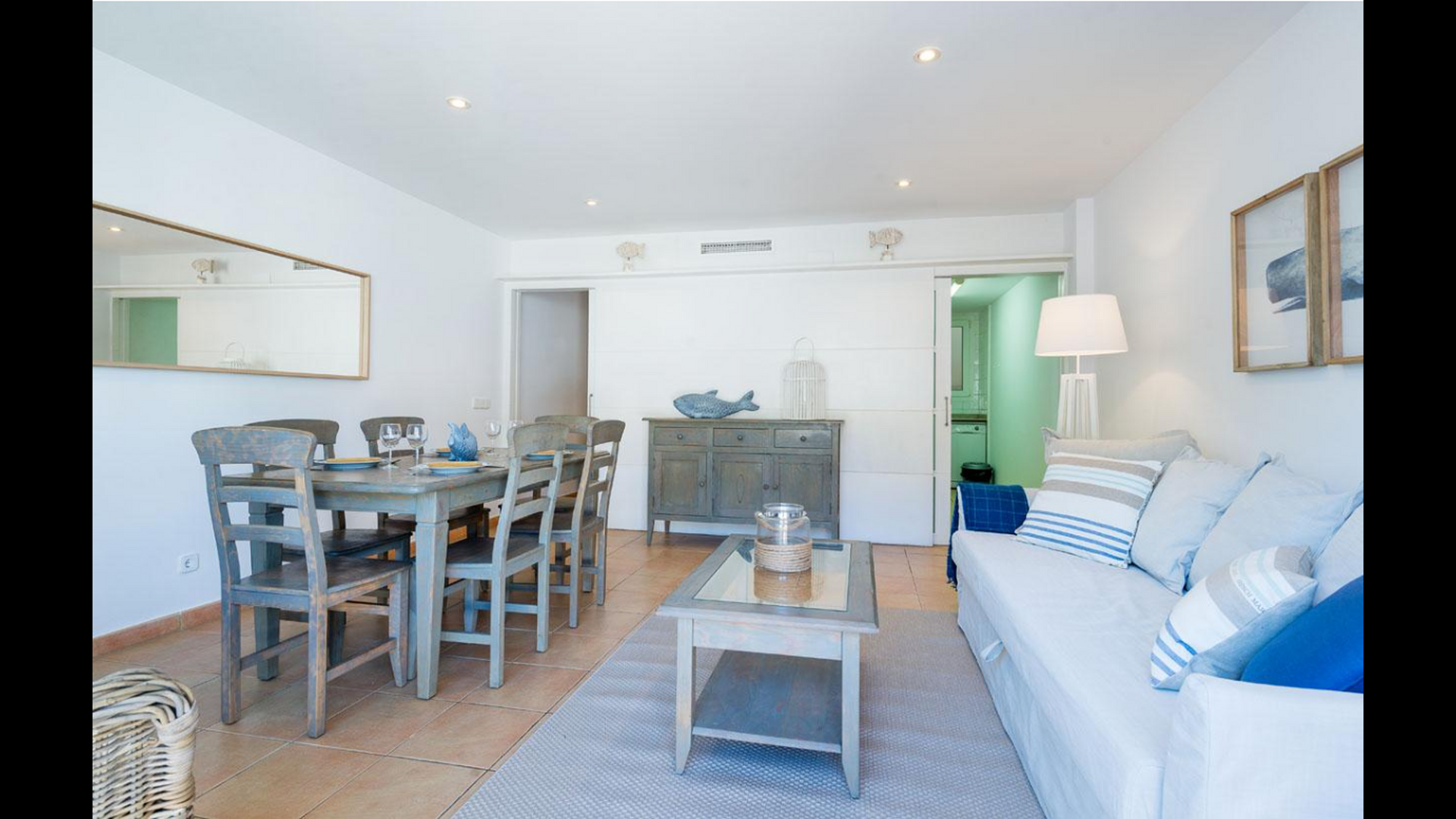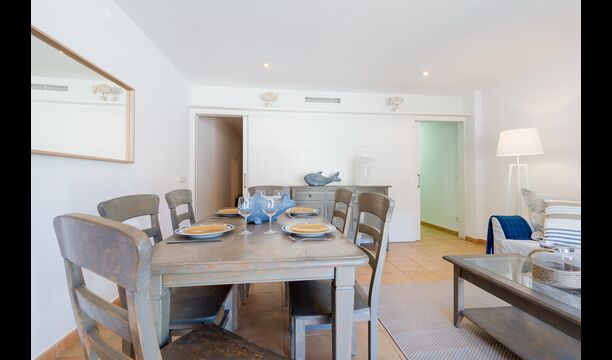 The common room with sofa corner with TV and dining table connects conveniently the terrace with the kitchen. You will find a well-equipped kitchen with a dishwasher and a washing machine. For your convenience and entertainment, the apartment offers WIFI and hot and cold air conditioning.