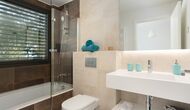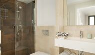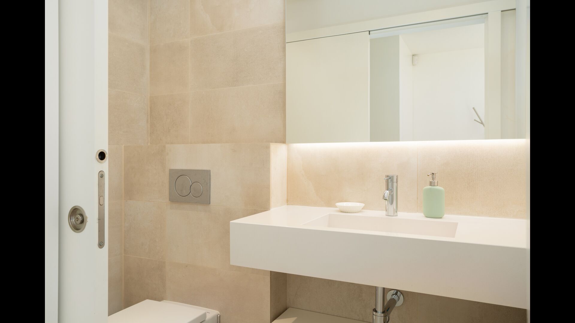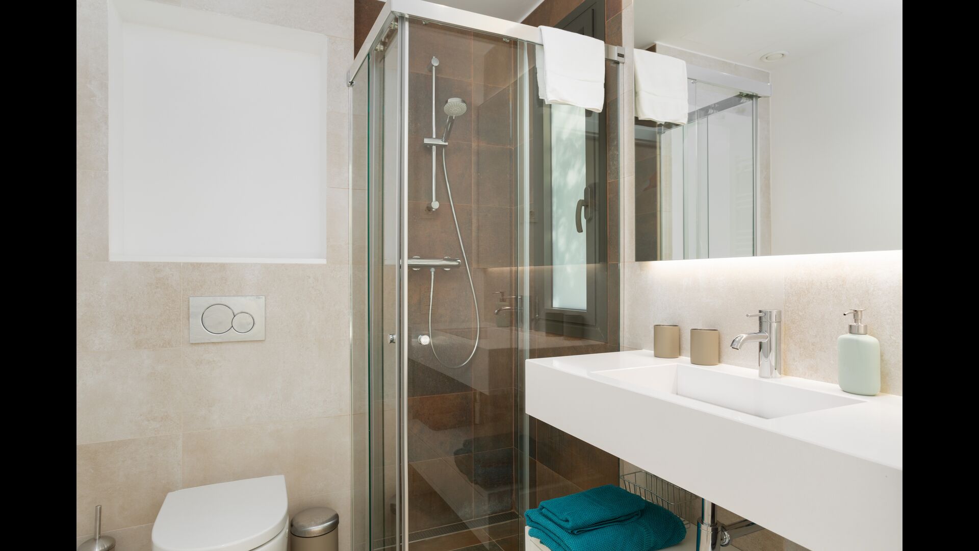 On the upper floor there are two double bedrooms with access to a nice terrace with views of the communal area. These two rooms share a bathroom with a shower. Here also there is a double bedroom ensuite with a bathroom with a bathtub and access to a large terrace with views of the house's garden.