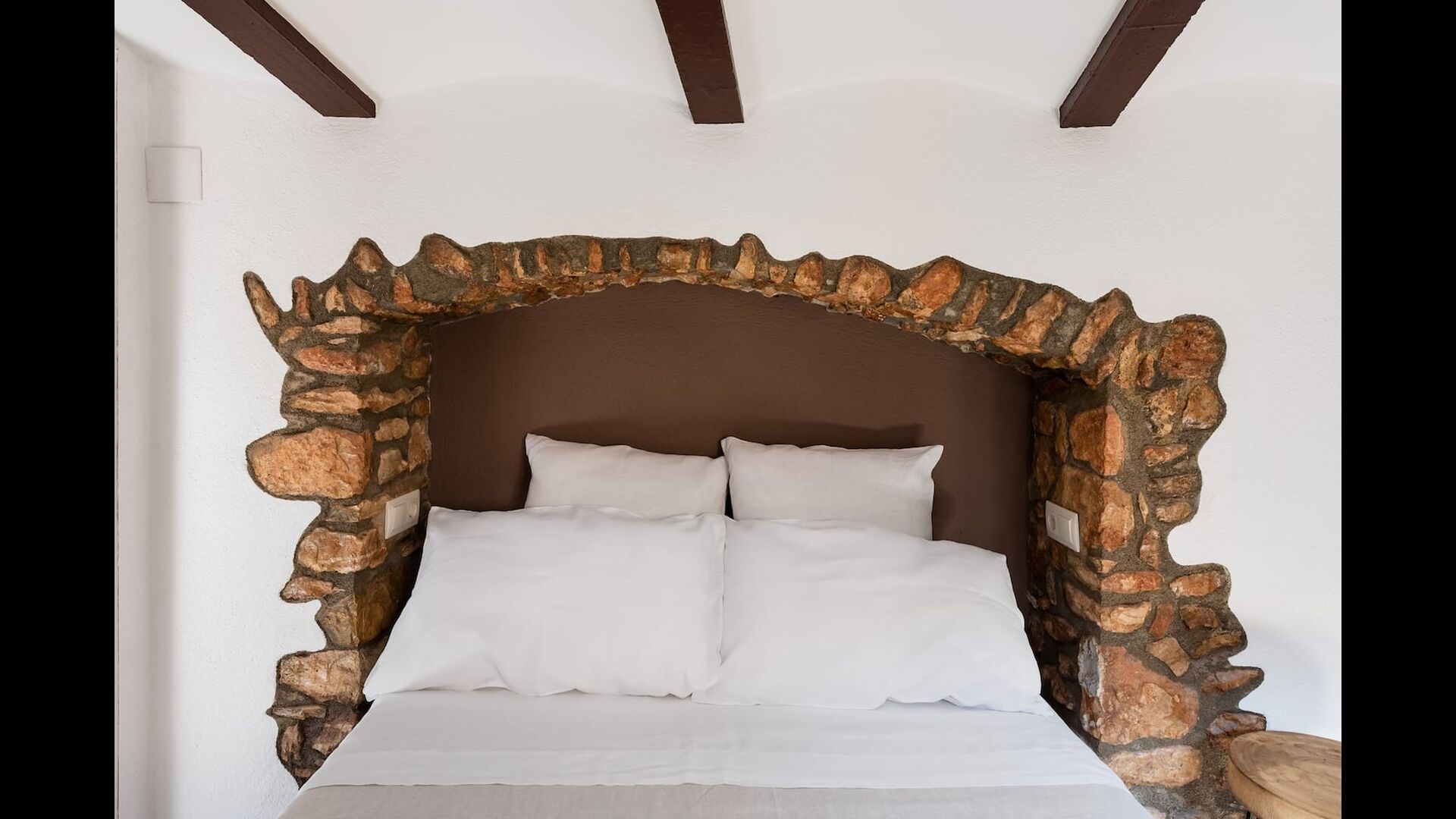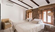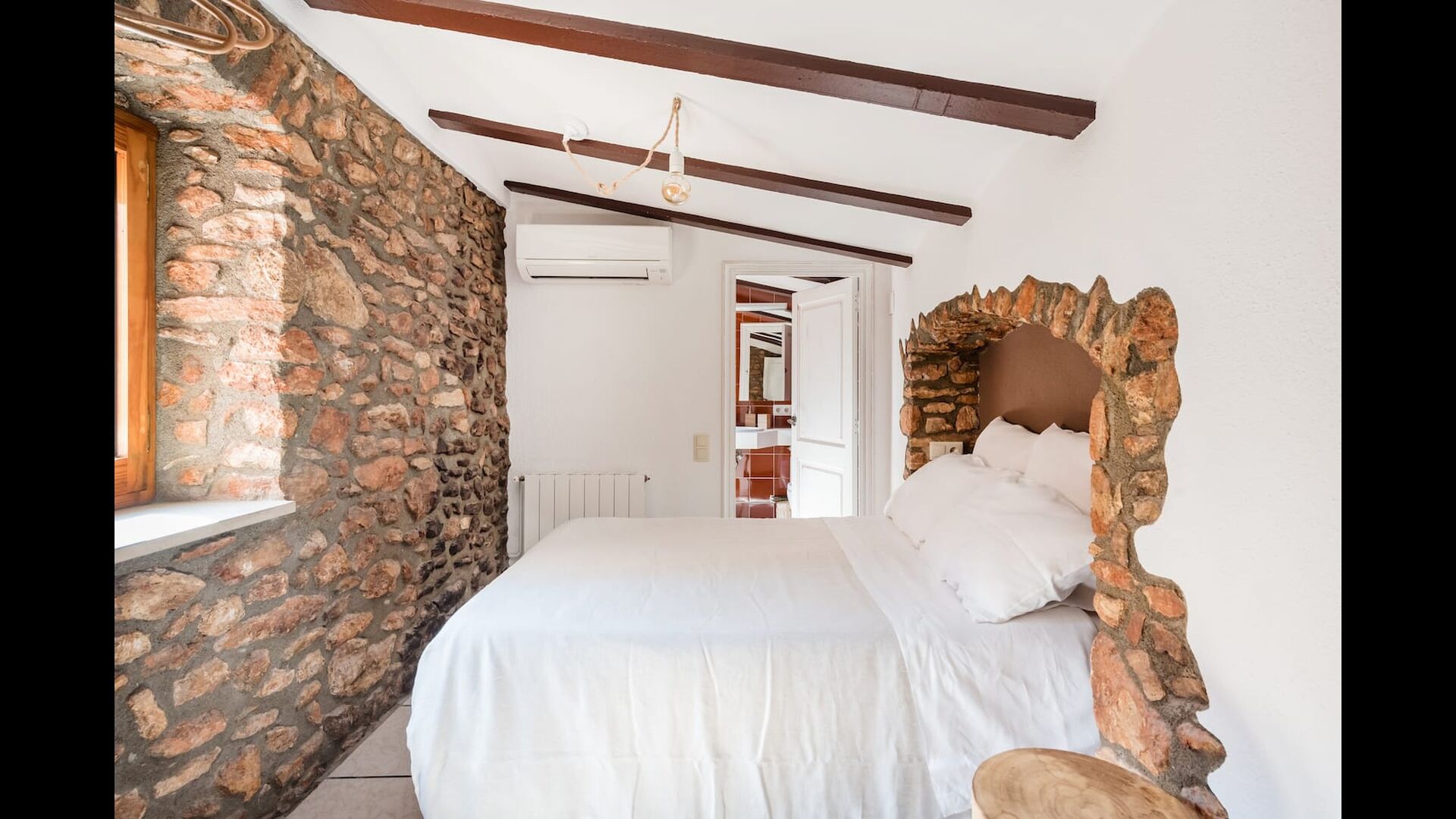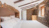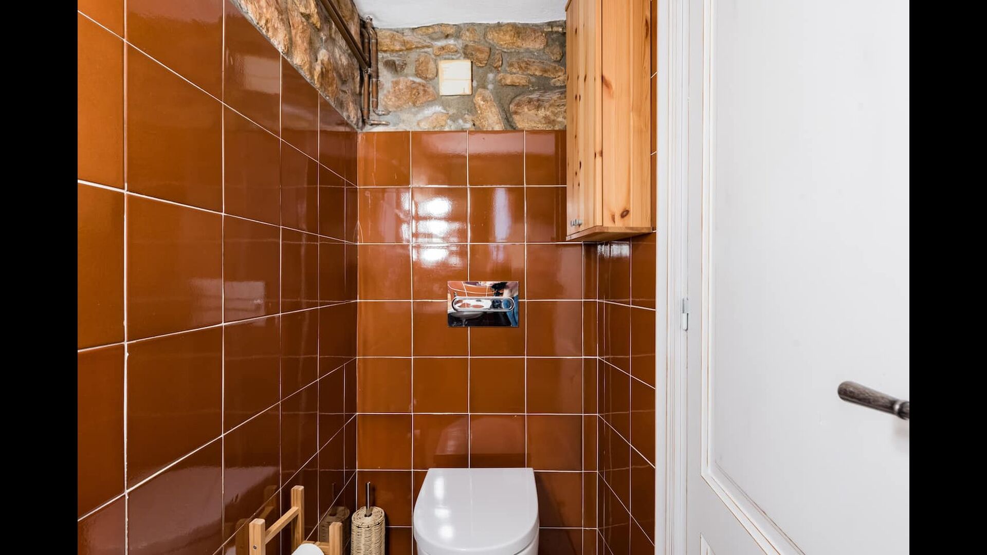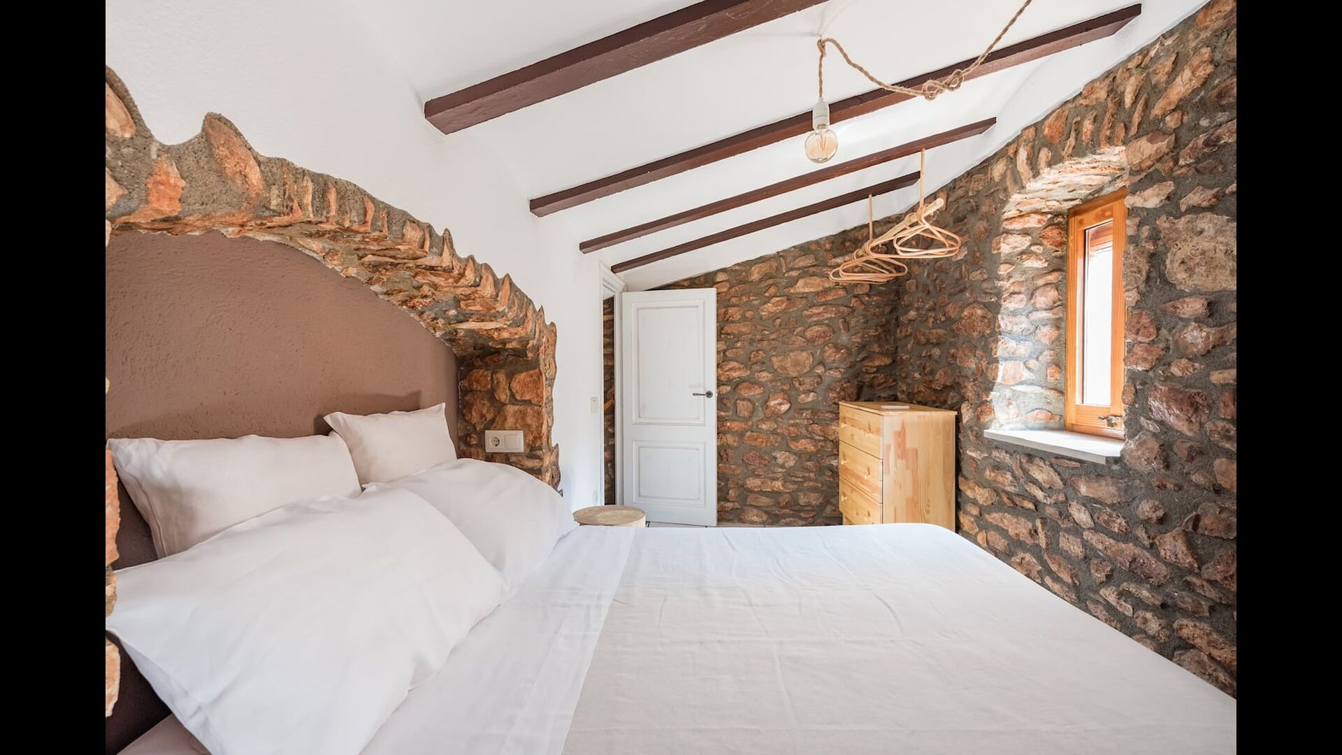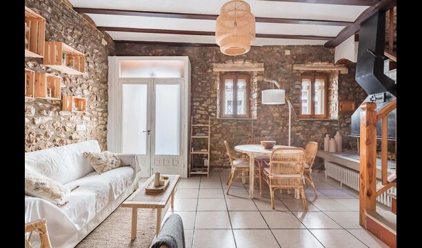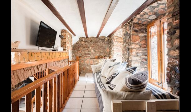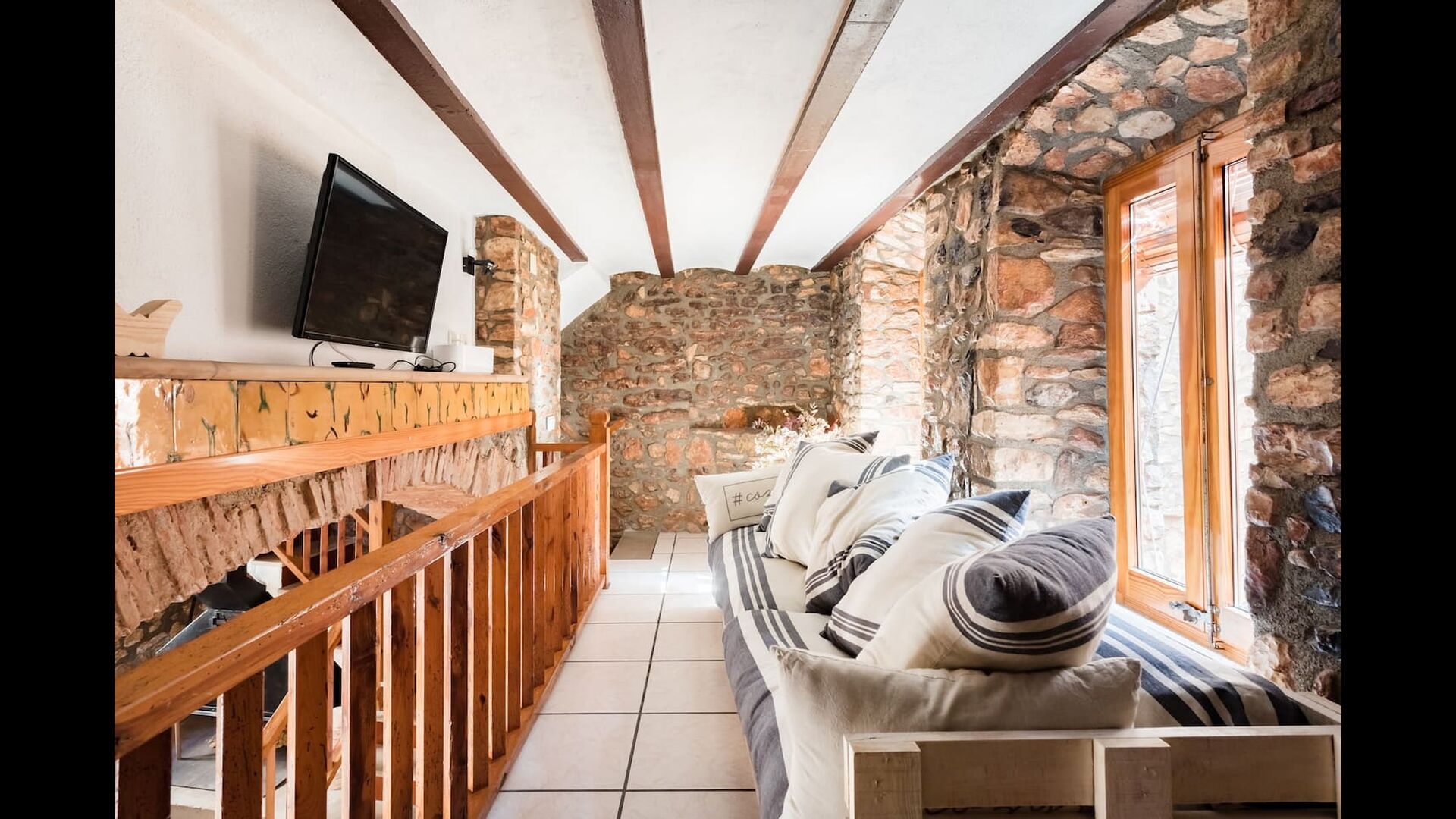 The apartment's walls are built entirely out of stone. On the ground floor is the living room with an open kitchen. From the ground floor, there are doors that lead out onto the apartment's patio. You will also find a small lavatory, and a mezzanine refurbished as a TV room. Upstairs, on the upper floor, there are two double bedrooms; one with a double bed, and another with 1 bunk bed. Both rooms possess their own ensuite bathrooms. Less than 100 meters from the apartment is a parking area for your car.