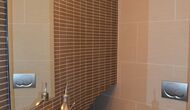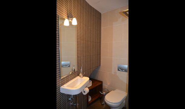 The ground floor has 2 double bedrooms, a bathroom and a large dining or meeting room with space for 15 people, a masonry stove and an open kitchen with access to the garden. This room has a projector and homecinema equipment. One of the bedrooms is oriental inspired and closes with an original wooden sliding door, beautifully carved in Indonesia.