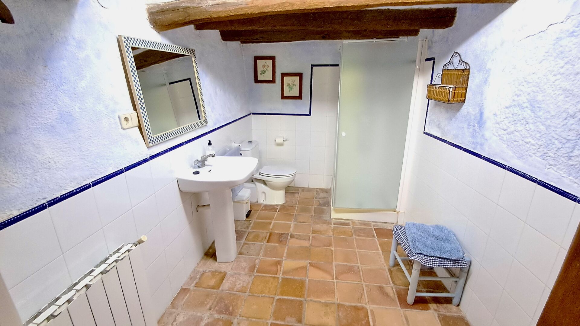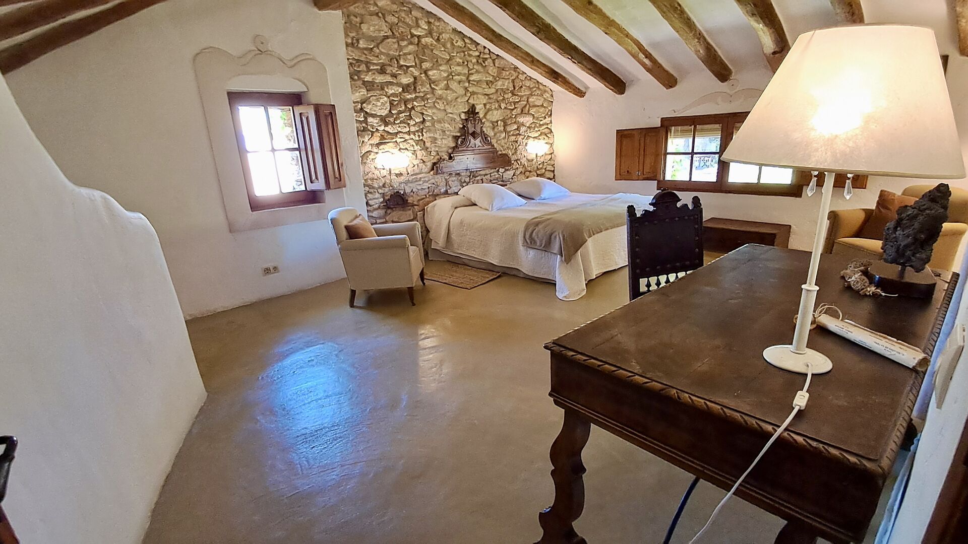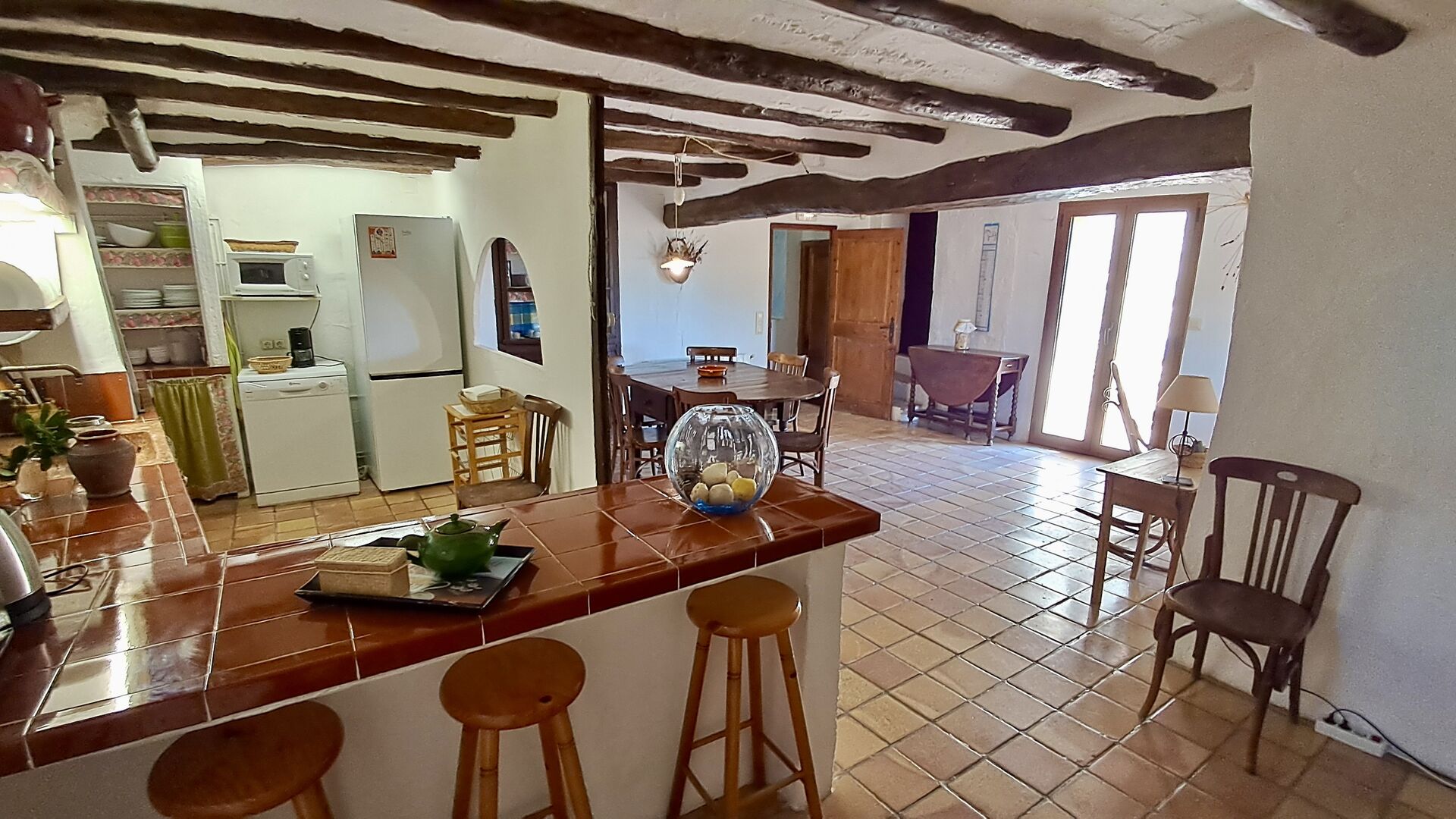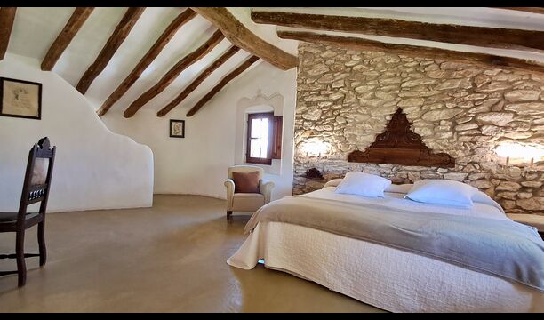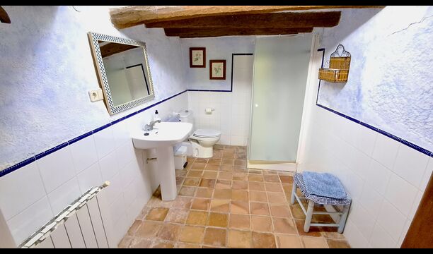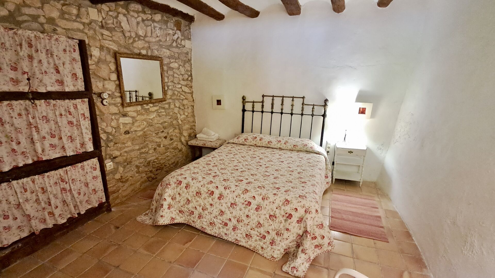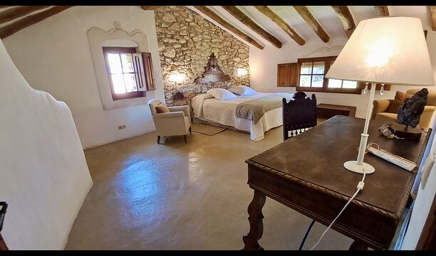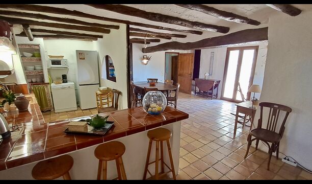 On the first floor, you find the kitchen and open dining room with access to a spacious first floor terrace with excellent view and a barbecue. Here, you can all eat out, enjoying the warm Catalan evenings. In addition, there are 3 large and very spacious bedrooms. They all have a different design, but all of them, have a high standard and a authentic look. One has a double bed, one has two single beds, and the third has two double beds, so it is possible to sleep 4 persons if necessary. Also on this floor, there is a fully equipped bathroom. The kitchen is like the rest of the house of high quality, and it has at the same time rustic and authentic furnishings.