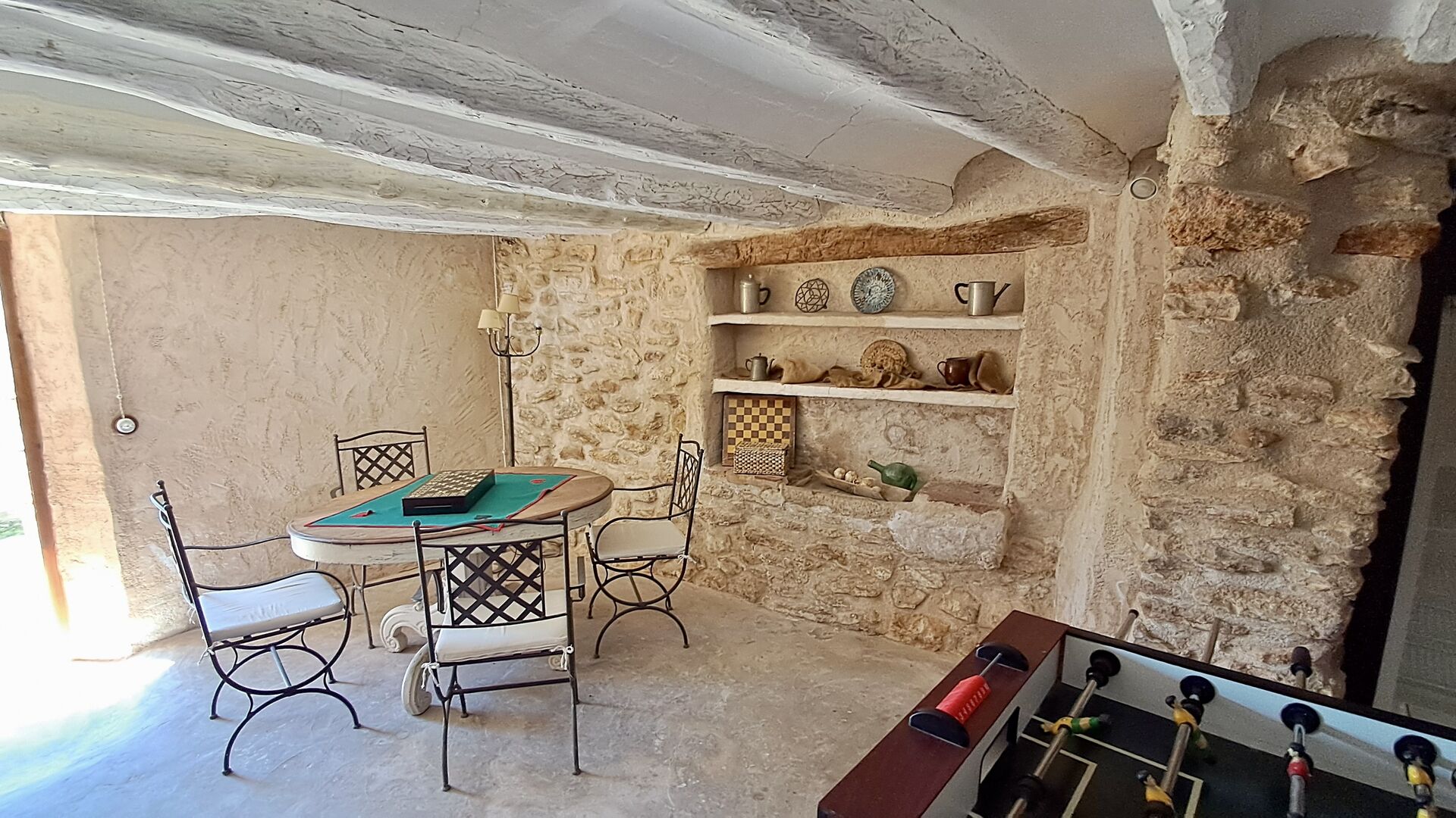 On the backside of the house, there is an outdoor space, where you can enjoy the view from the instructor-chairs. Also, there is space for playing. Inside the house, in the ground floor, there is a game room with a table football. Also, in the ground floor, there is one bedroom and one bathroom.