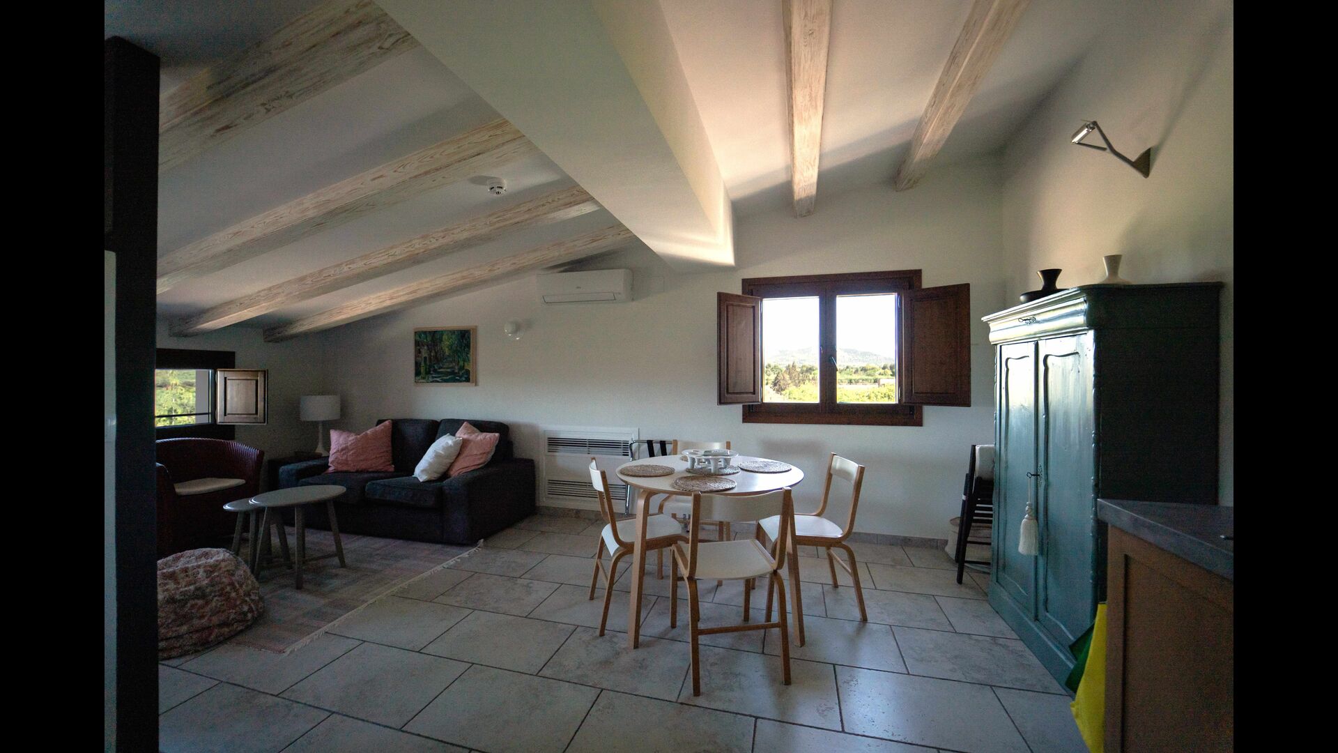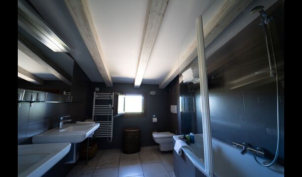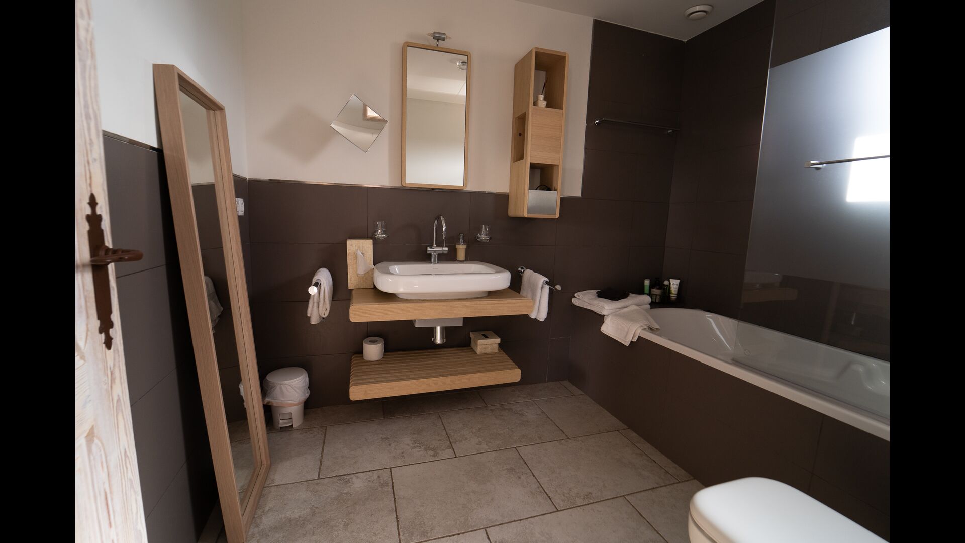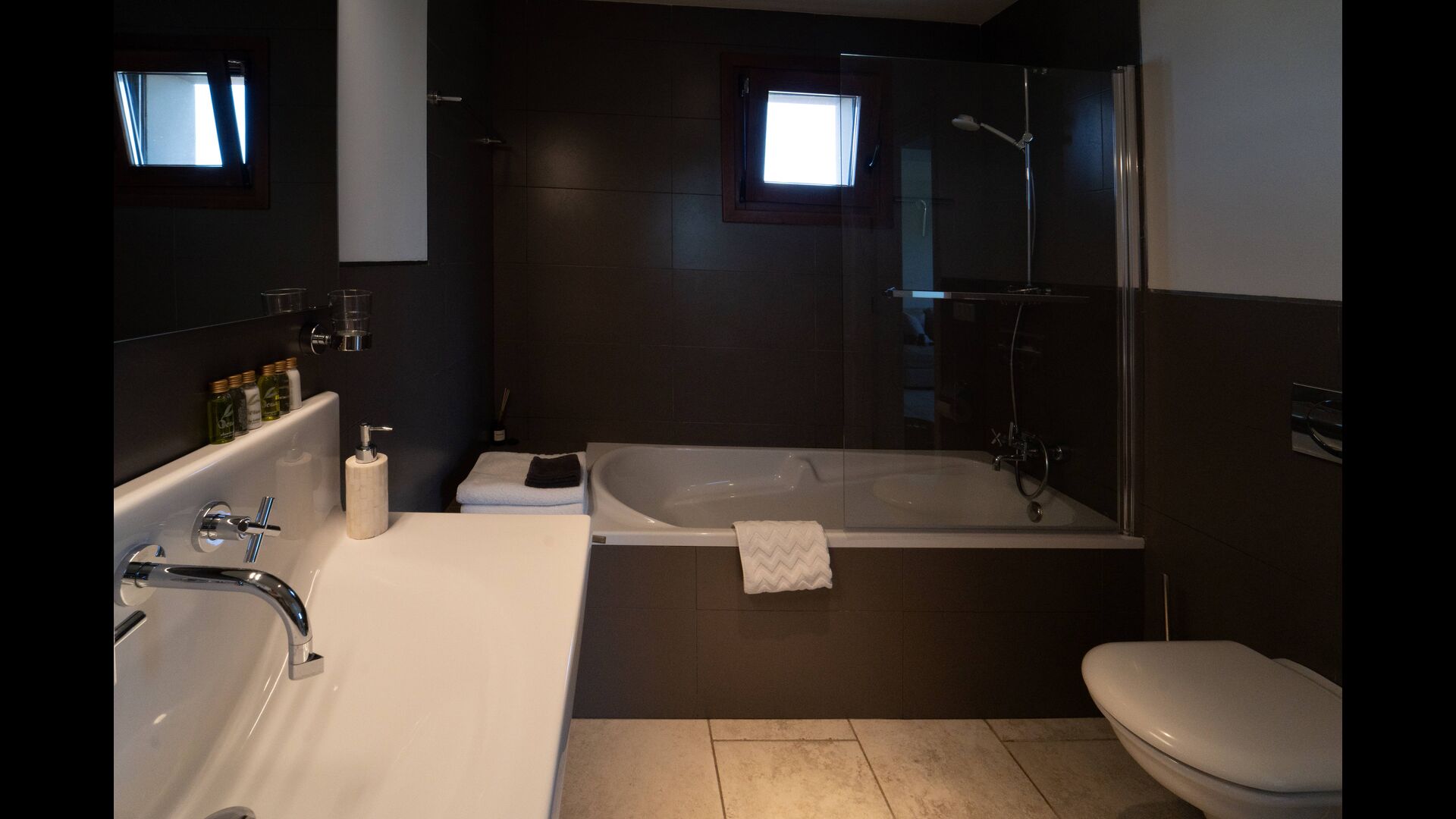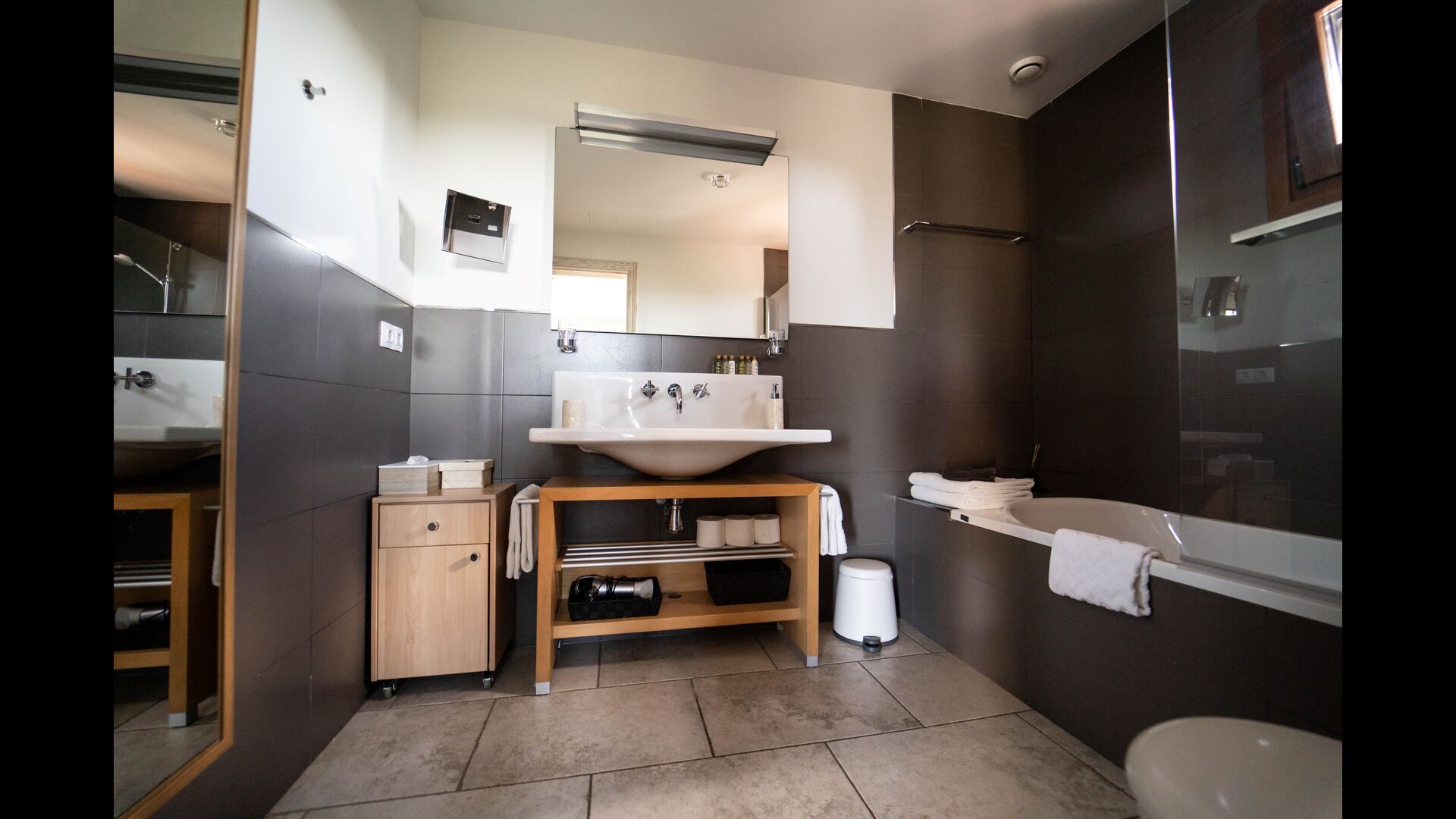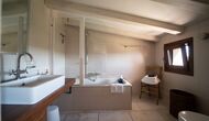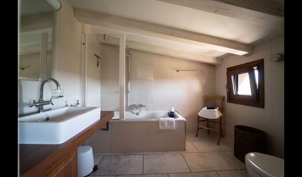As the house in the off-season also works as a hotel/BB, all rooms are hotel standard. Three of them are suites with private sitting area, and one space is a two-bedroom family-apartment for four people, which has its own kitchen. The family-apartment has a large bathroom with a bath and two washbasins.