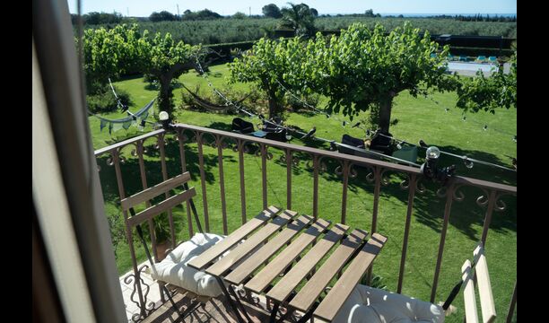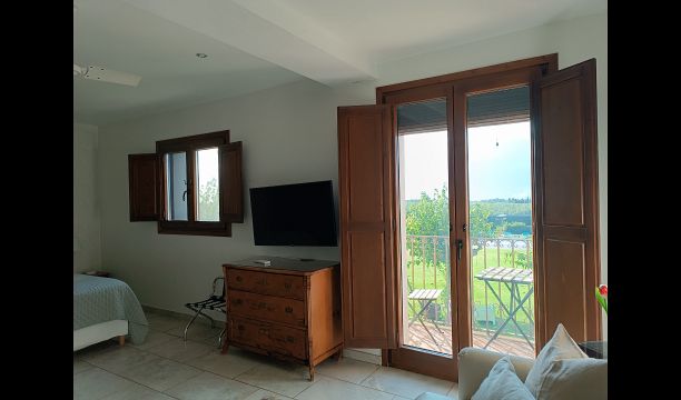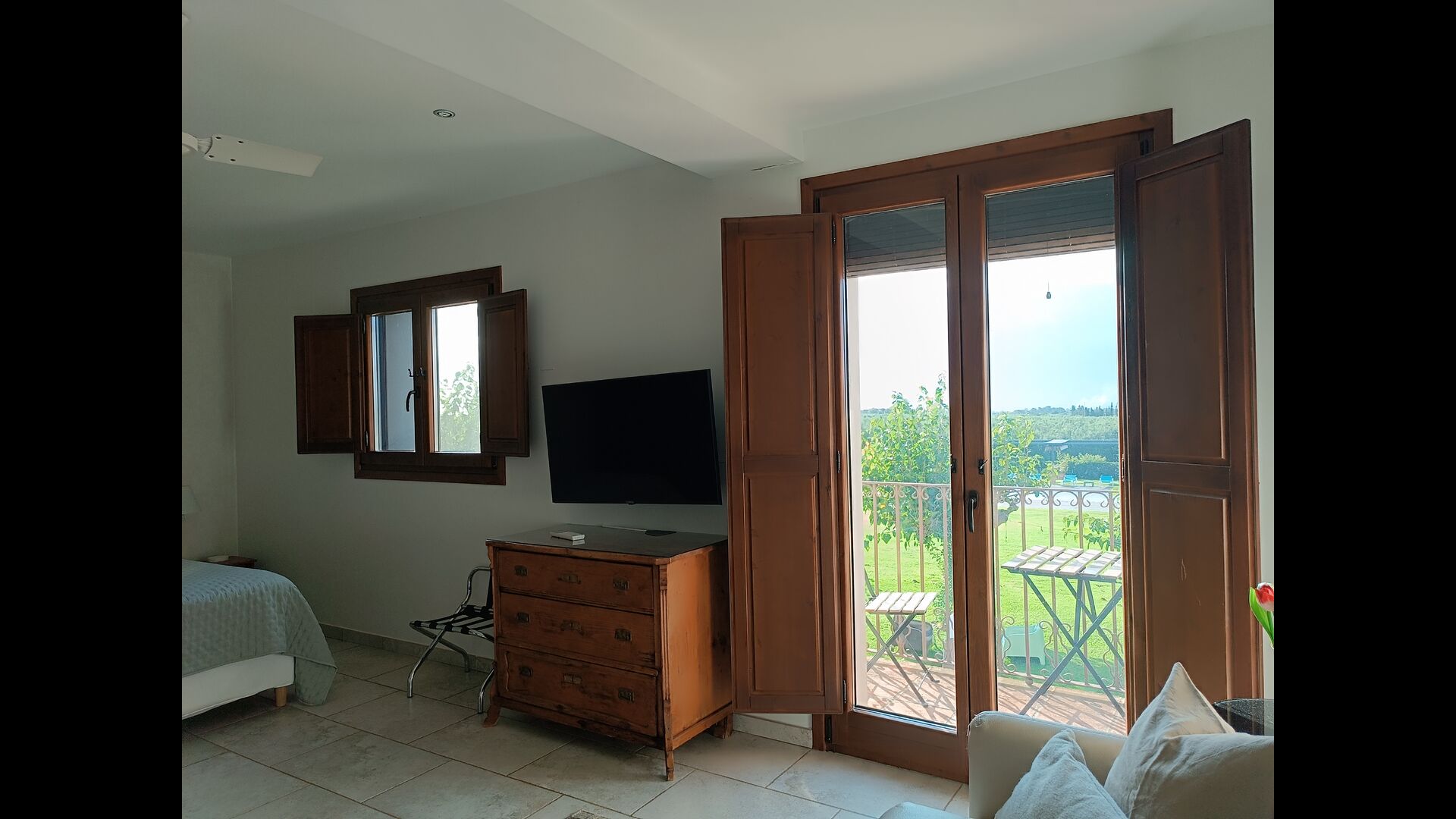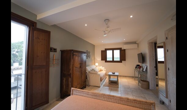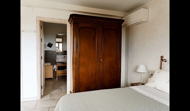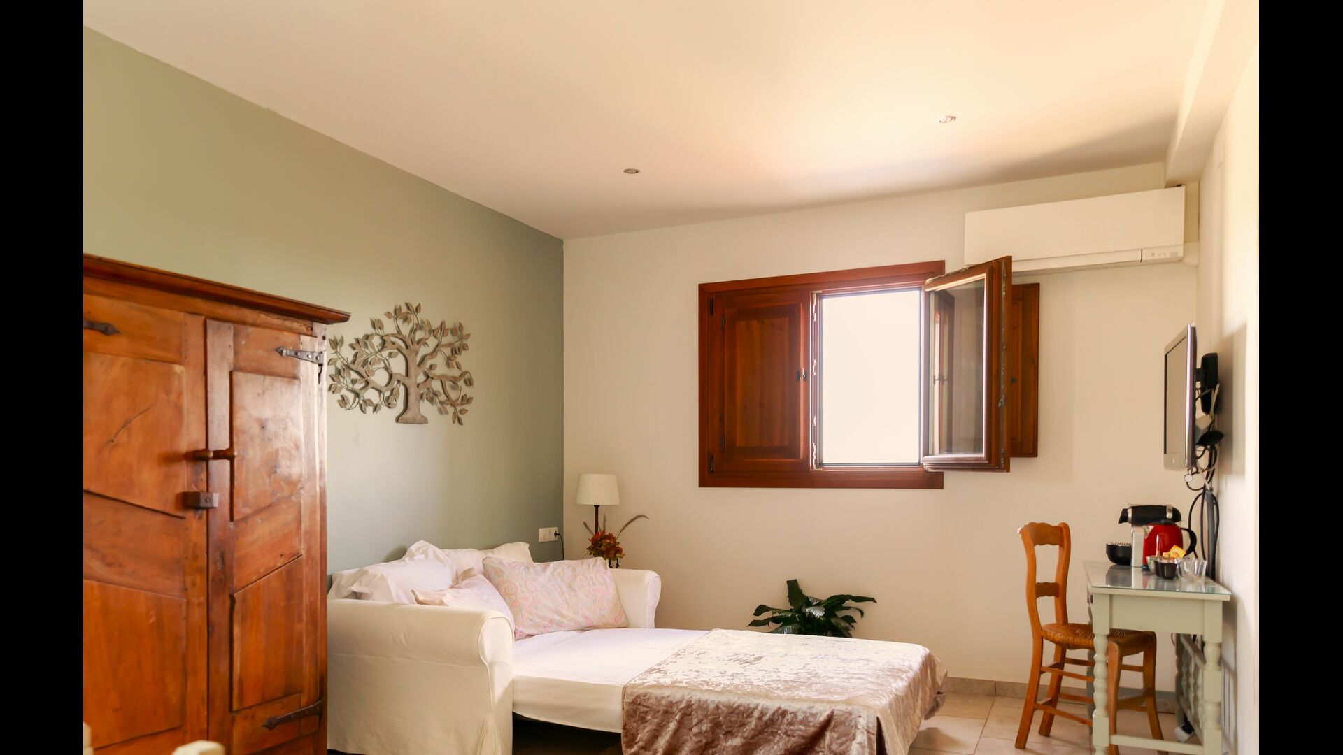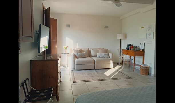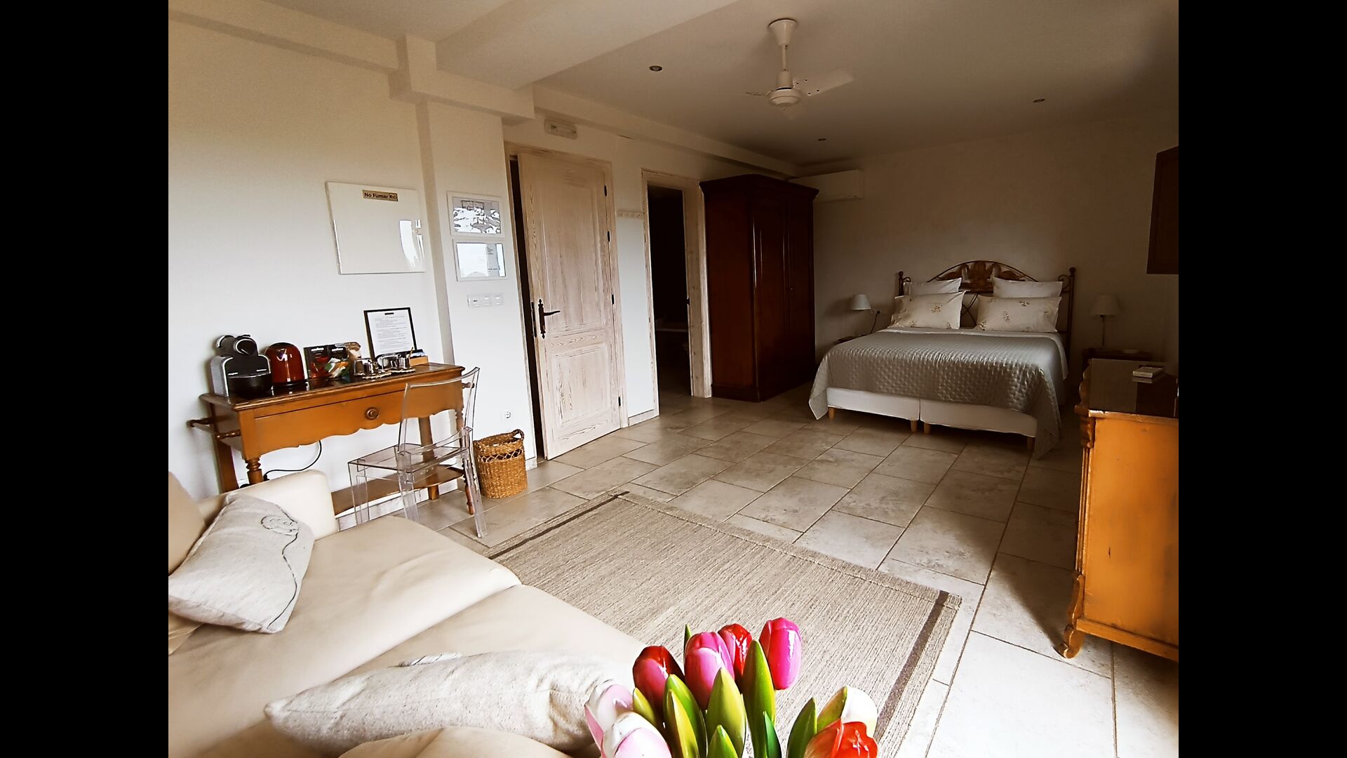 A beautiful superior room, meaning that it is one of the most beautiful and largest rooms of the house. The room is South-facing and has beautiful views over the garden until the sea. The room is airy and light and has a small balcony.