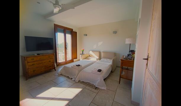 Bedroom 7 is a twin room with 2 single beds of 0.80 x 2.00m and a second TV. On request, the owner adds an extra bed in this second bedroom.