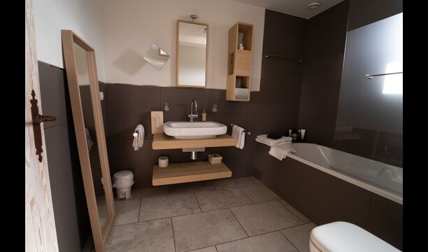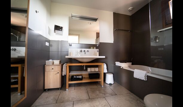 The private en suite bathroom comes with a bath, double sink, toilet, hairdryer, magnifying mirror, and free toiletries. The room has a double bed of 1.60 x 2.00 m and a sofa bed of 1.40 x 2.00 m. Because of its size of 23m2 and bed configuration (double bed and double sofa bed), it is suitable for up to 4 people.