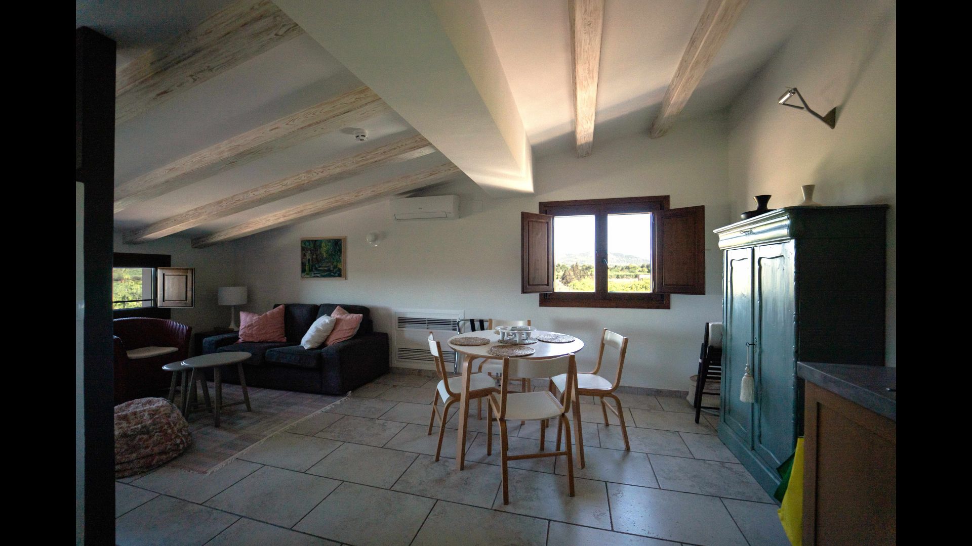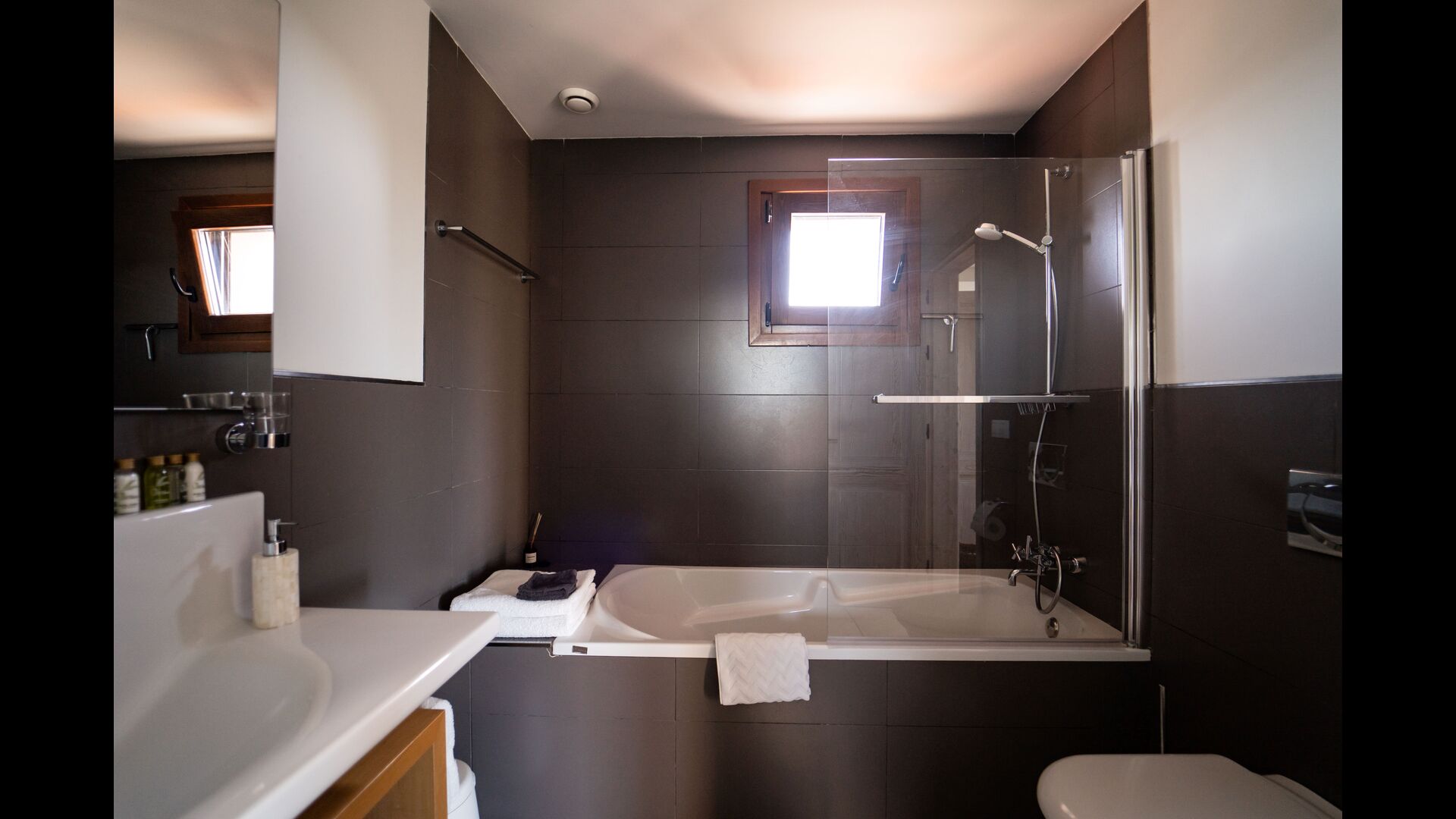 A spacious double room with two single beds of 0.90 x 2.00 and a sofa bed, on the Northside of the house, with view the olive groves. The private en suite bathroom comes with a walk-in shower, sink, toilet, hairdryer magnifying mirror, and free toiletries. The sofa bed of 1.20 x 1.90 makes the room suitable for 3 adults.