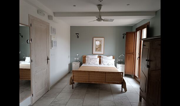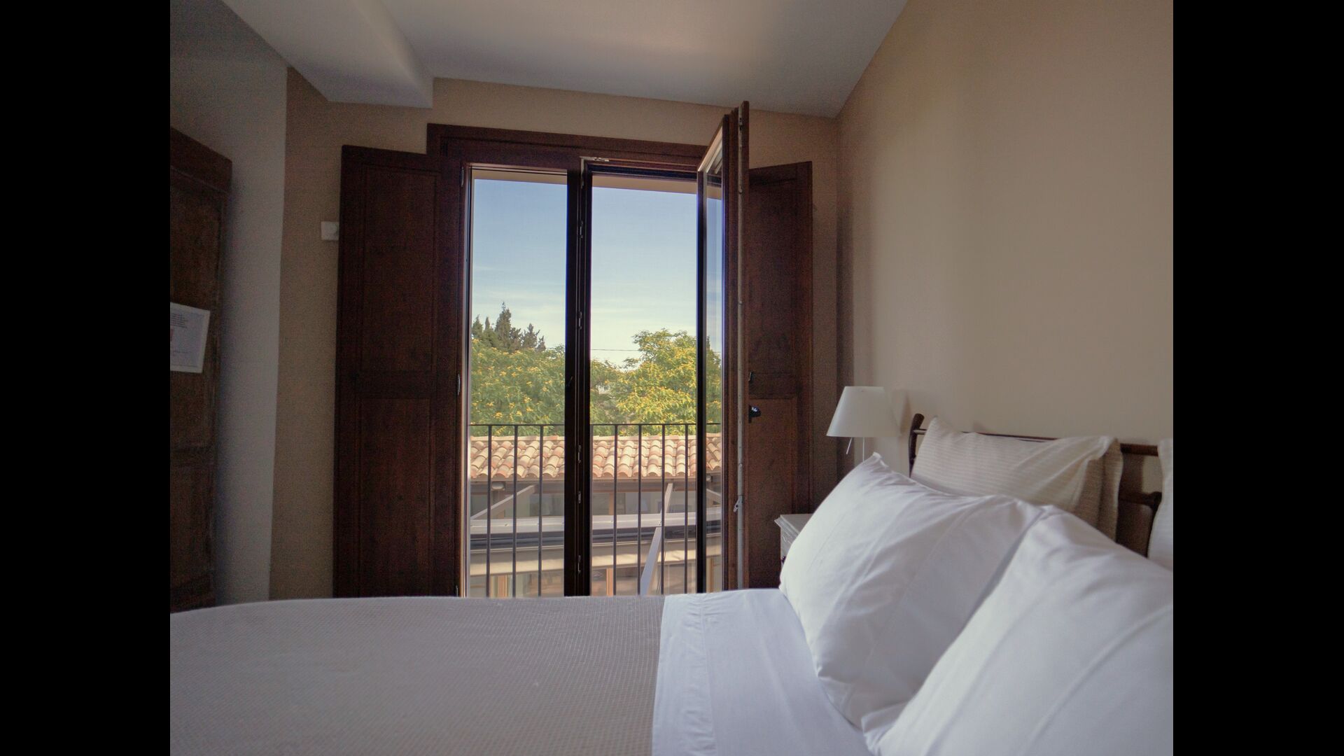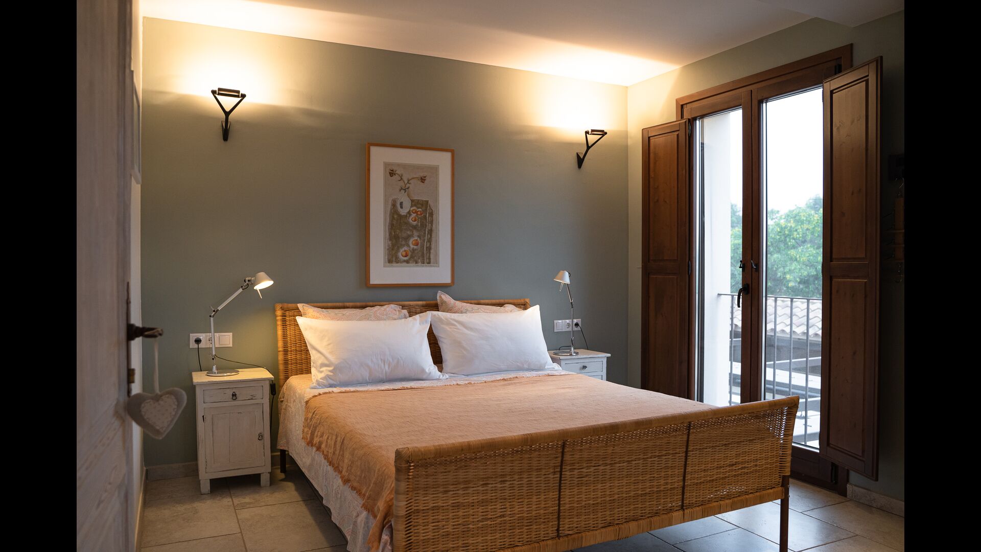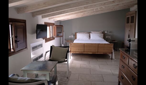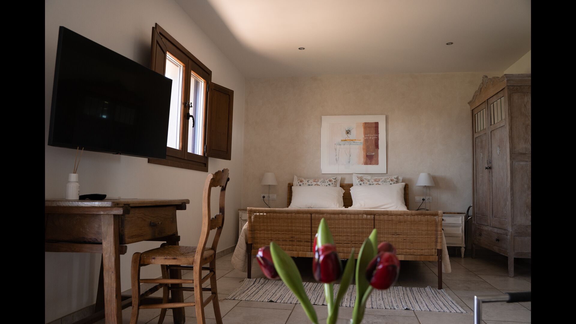 This romantic and cozy double room of 19m2 on the second floor on the East side of the house has views of the olive groves. The en suite private bathroom comes with a bathtub, sink, toilet, hairdryer magnifying mirror, and free toiletries. It has a large double bed of 1.60 x 2.00 m.