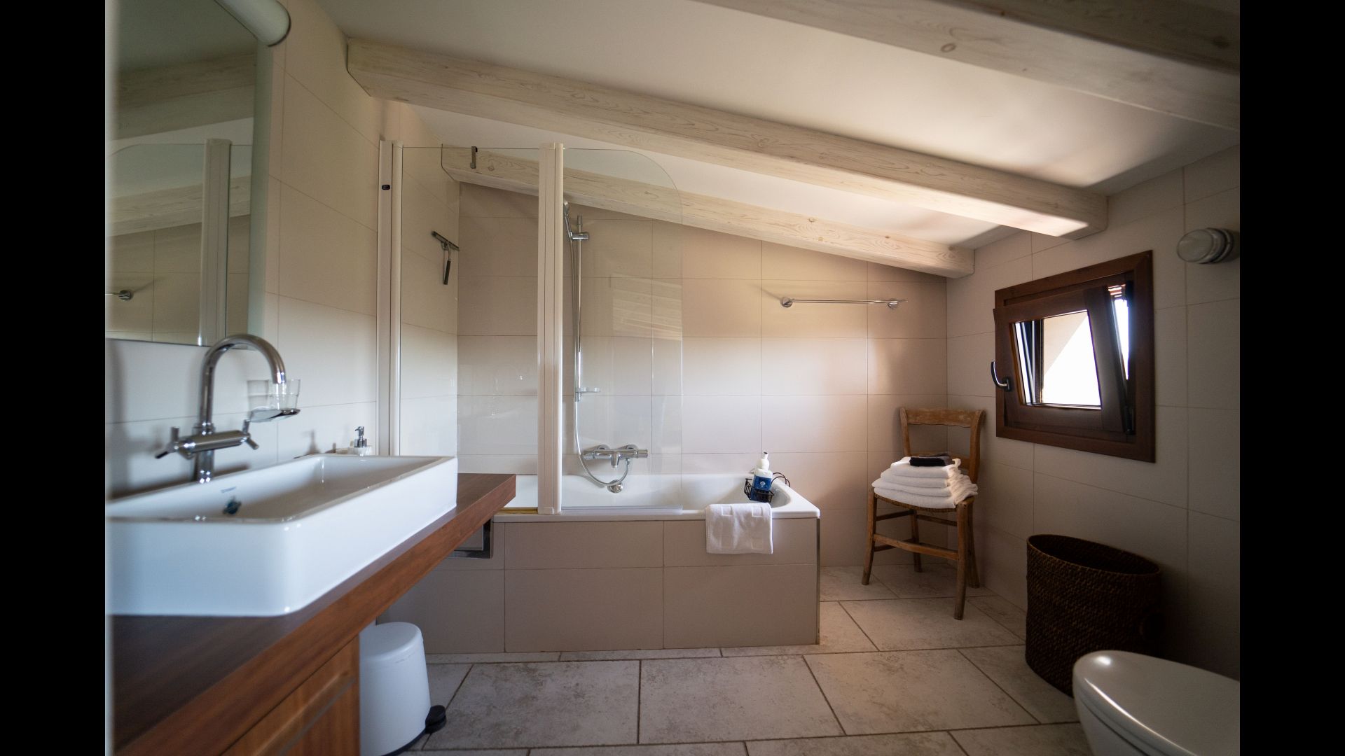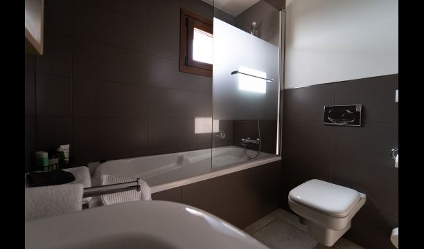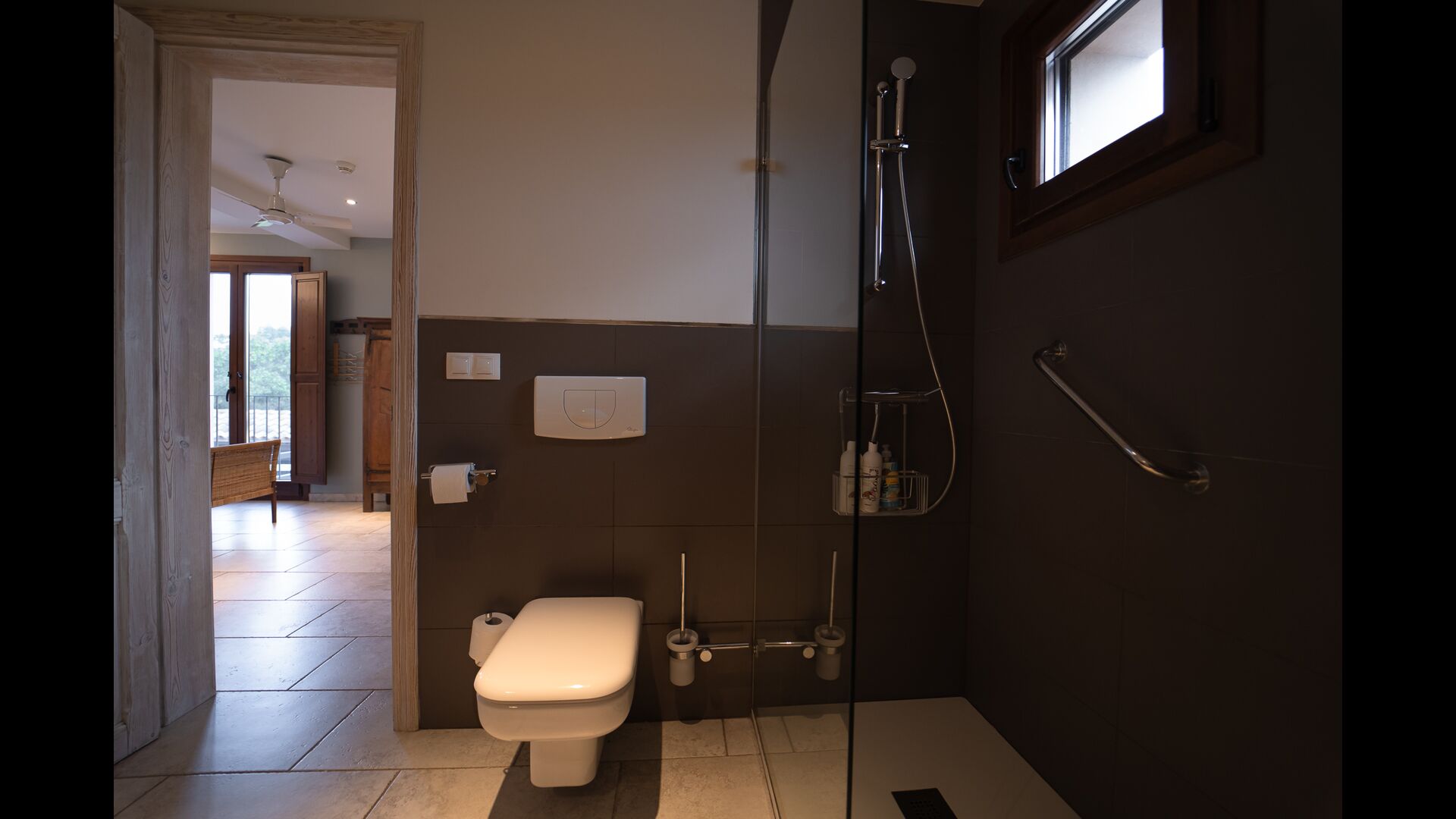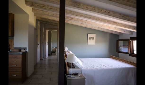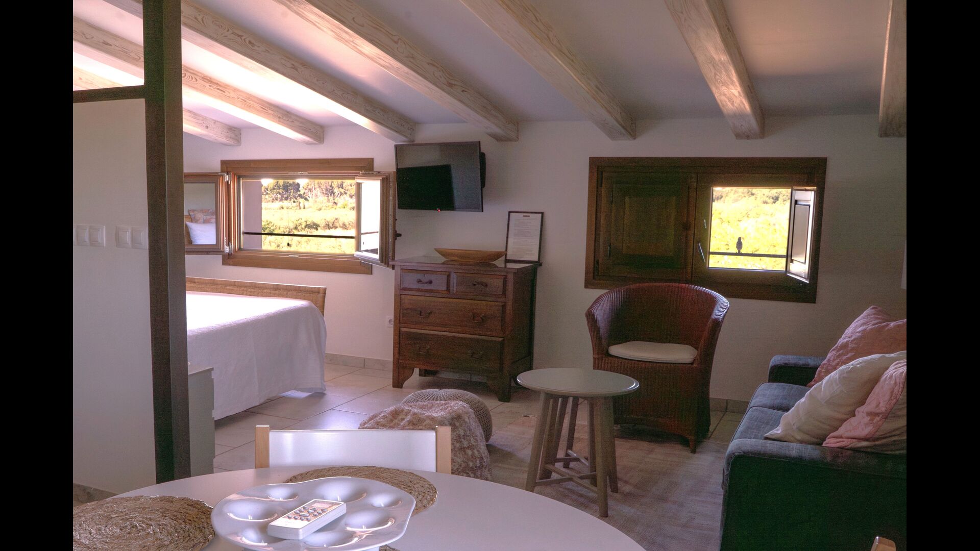 This romantic and cozy double room of 19m2 on the second floor on the East side of the house has views of the olive groves. The en suite private bathroom comes with a bathtub, sink, toilet, hairdryer magnifying mirror, and free toiletries. It has a large double bed of 1.60 x 2.00 m.