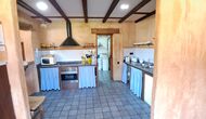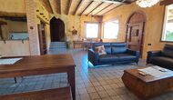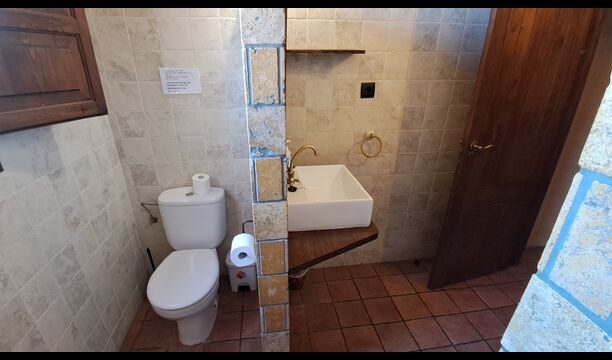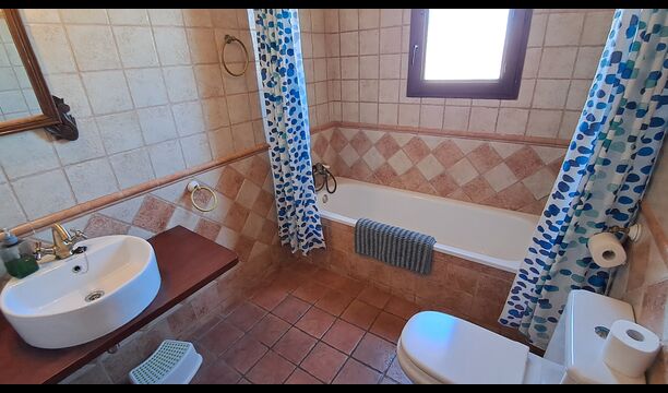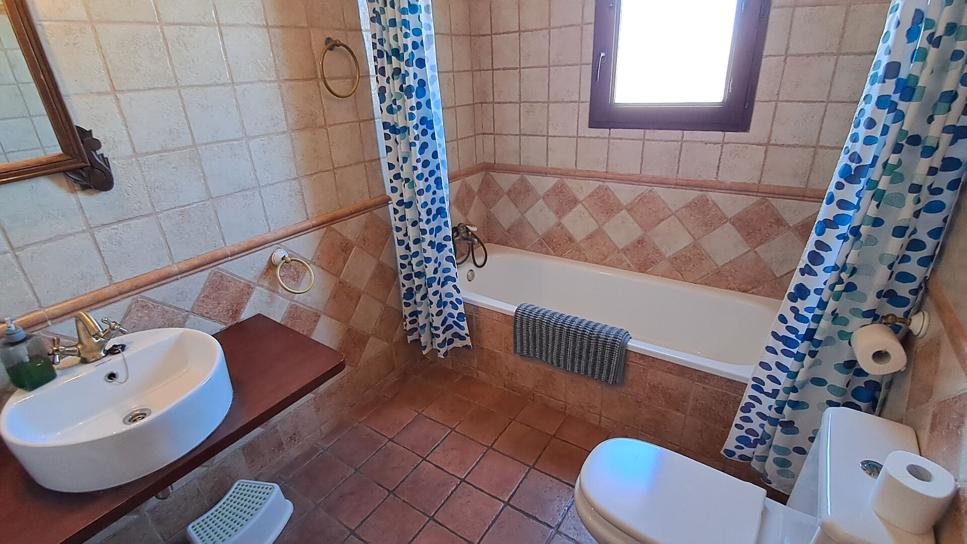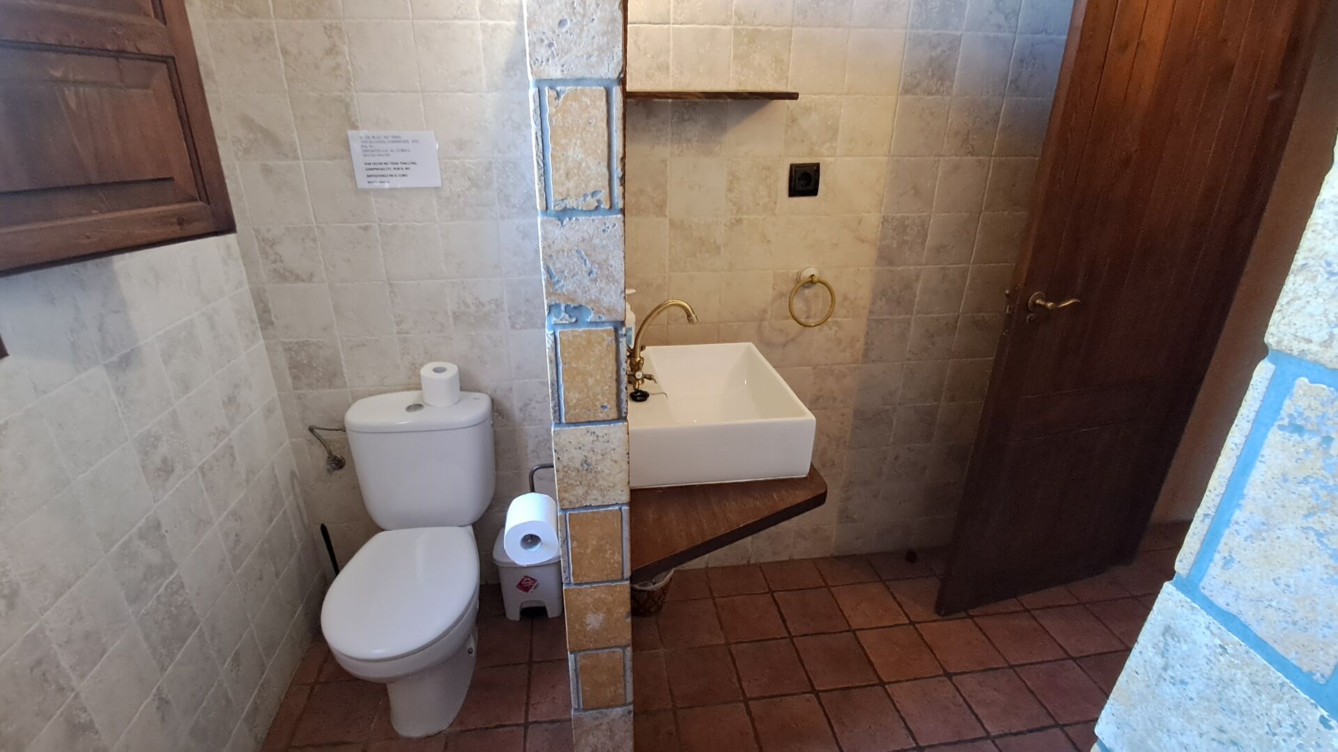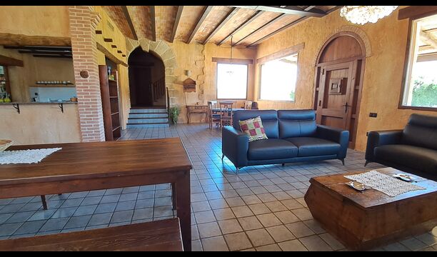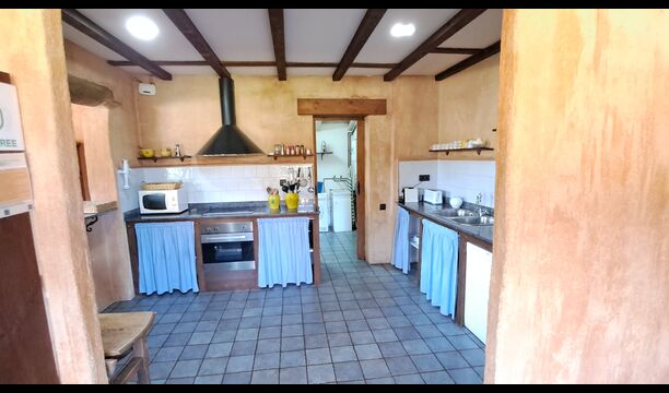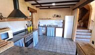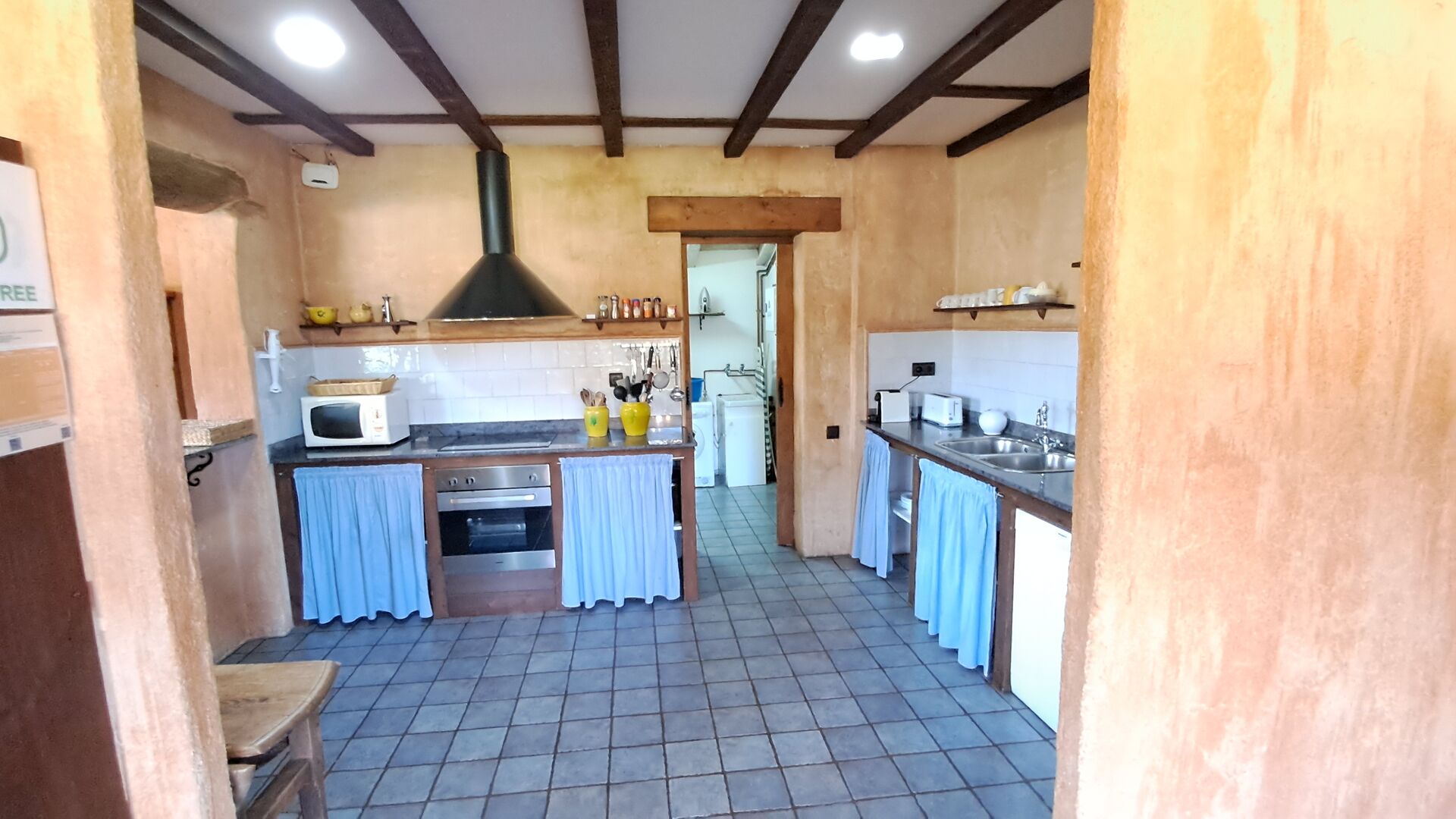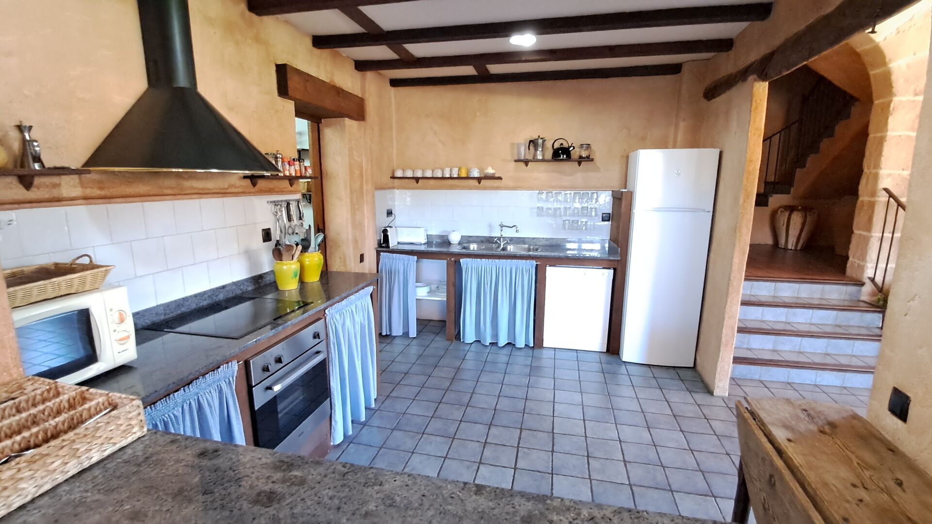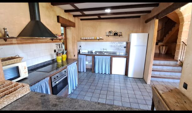 The ground floor is one large common room where the whole holiday group can be social together. There is a long table, so you can dine inside, a sofa corner with flat-screen TV and a cosy seating area. In addition, there is an open kitchen in classic Catalan style, equipped with among other things, a dishwasher, microwave, stove, oven, refrigerator and freezer.