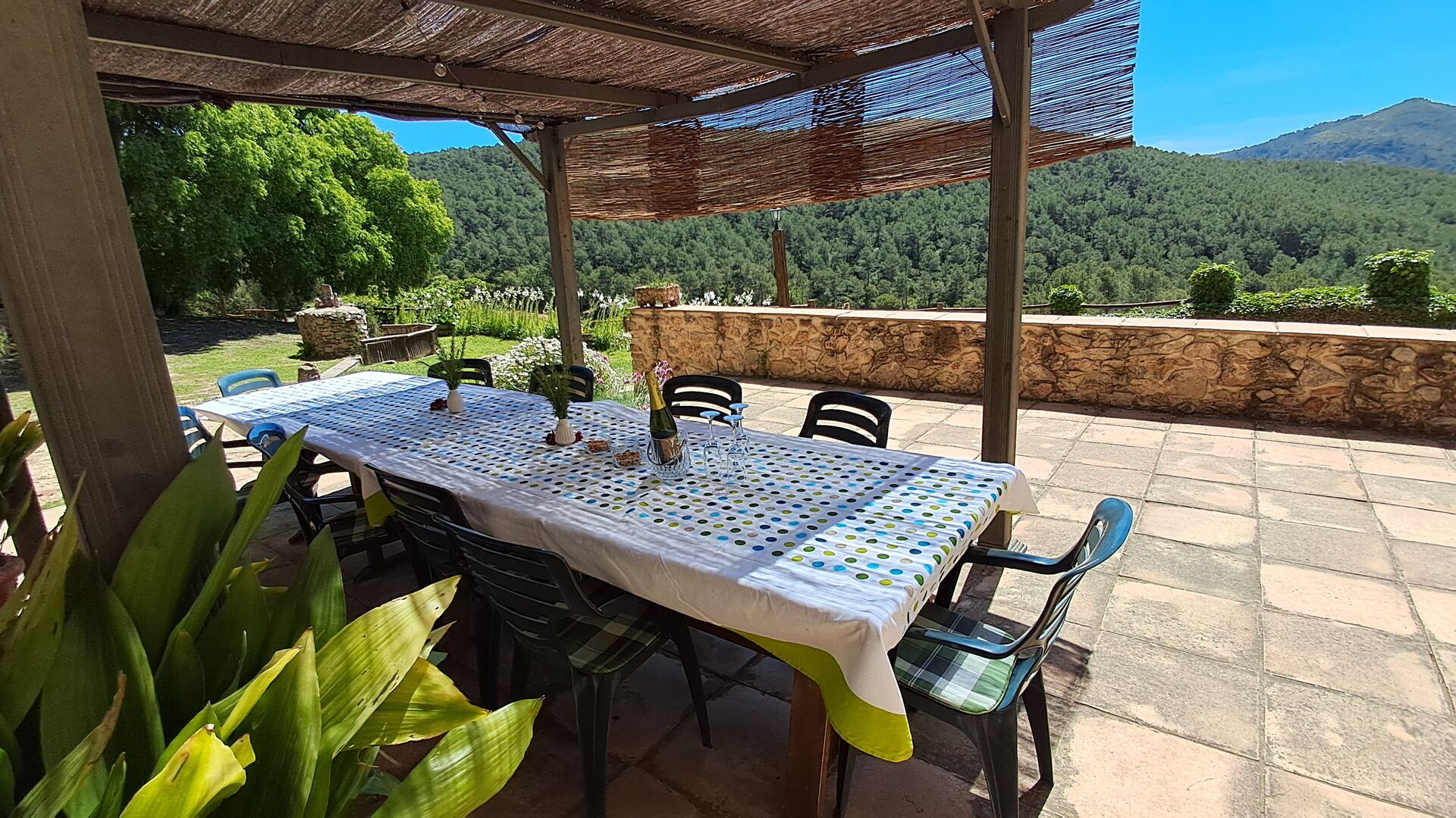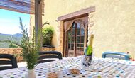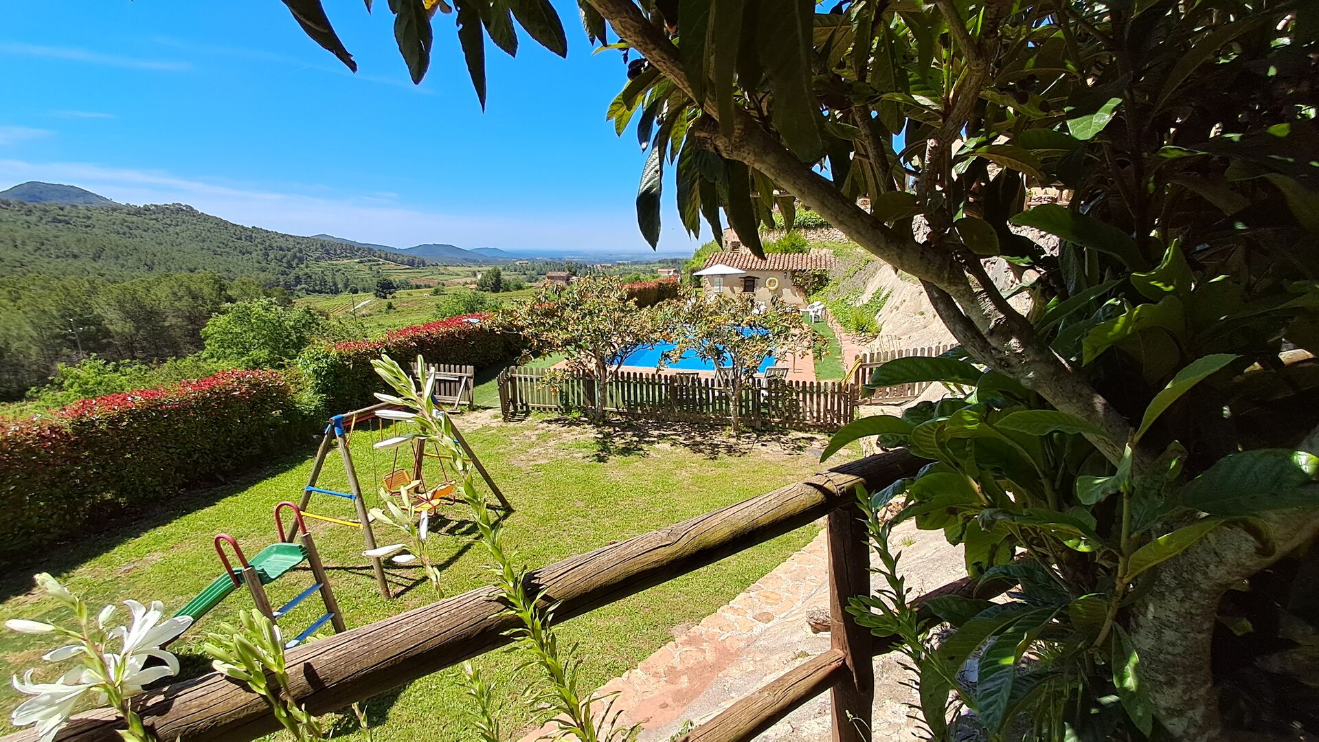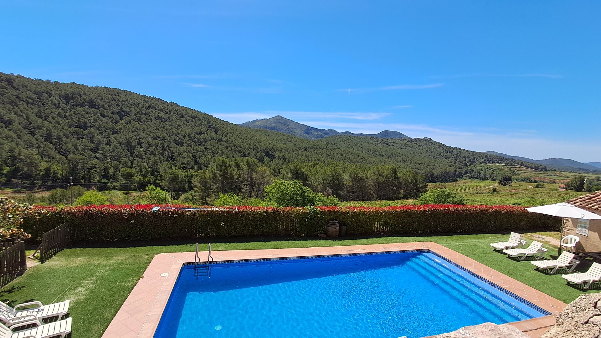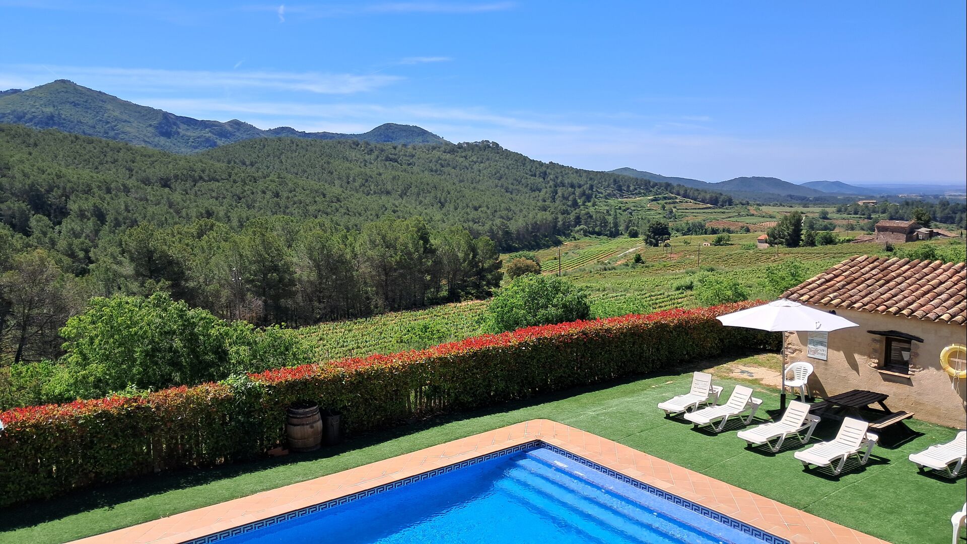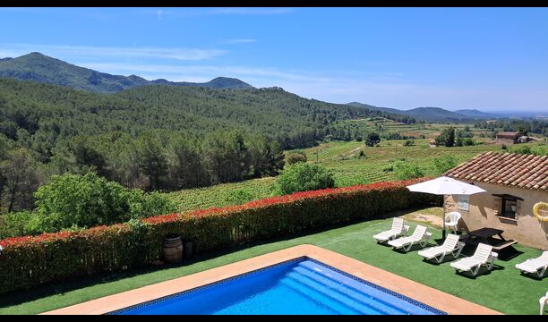 From the moment you enter the property, you feel the tranquillity and the sounds of nature, which will make your vacation relaxing and stress reducing. In the garden, the sunshine makes its way through the treetops of the shady trees in the garden. Below the house, the pool area with the very large swimming pool (6 x 12 meters), has a perfect view over the hills and the vineyards, the first starting rigt at the end of the pool area.