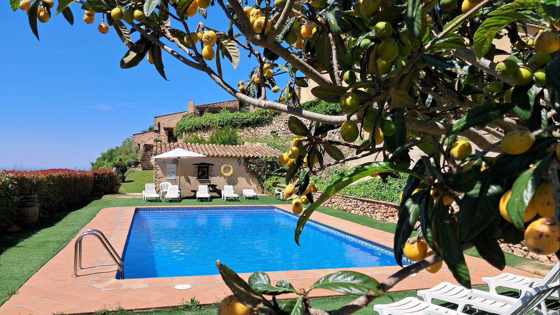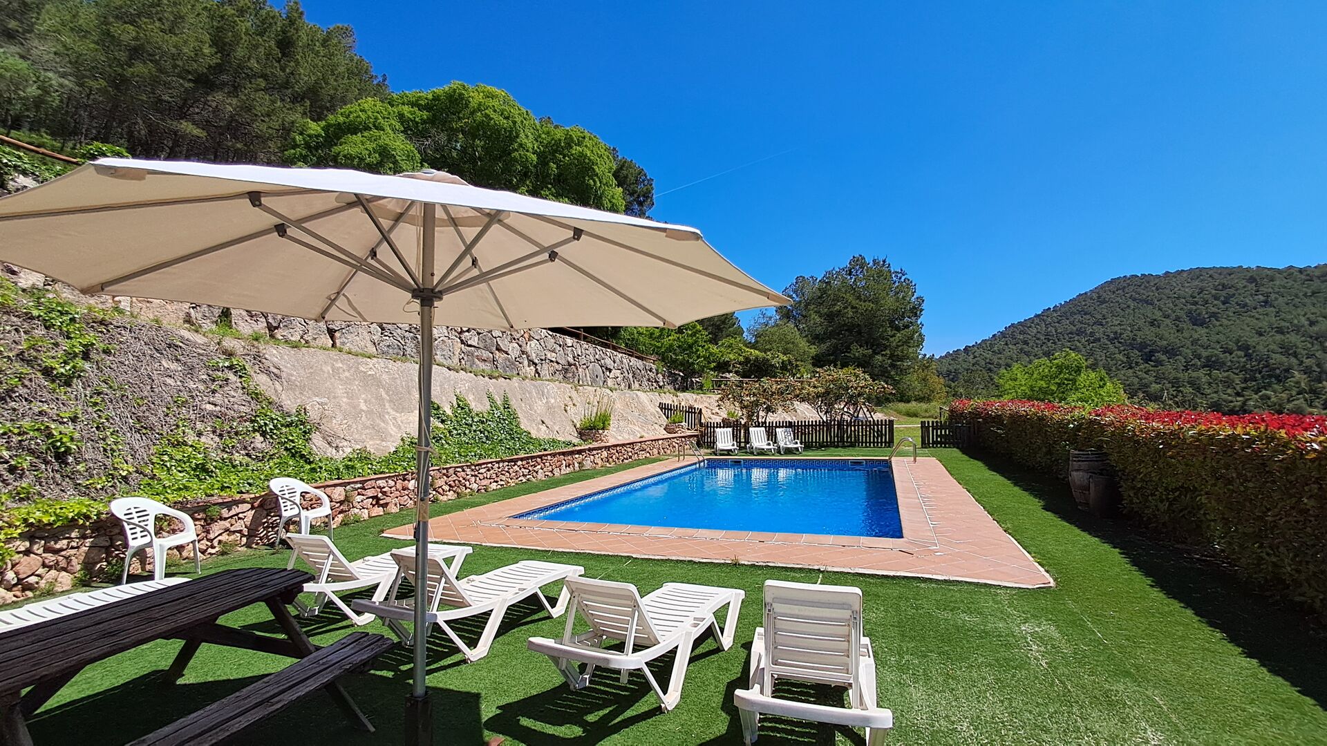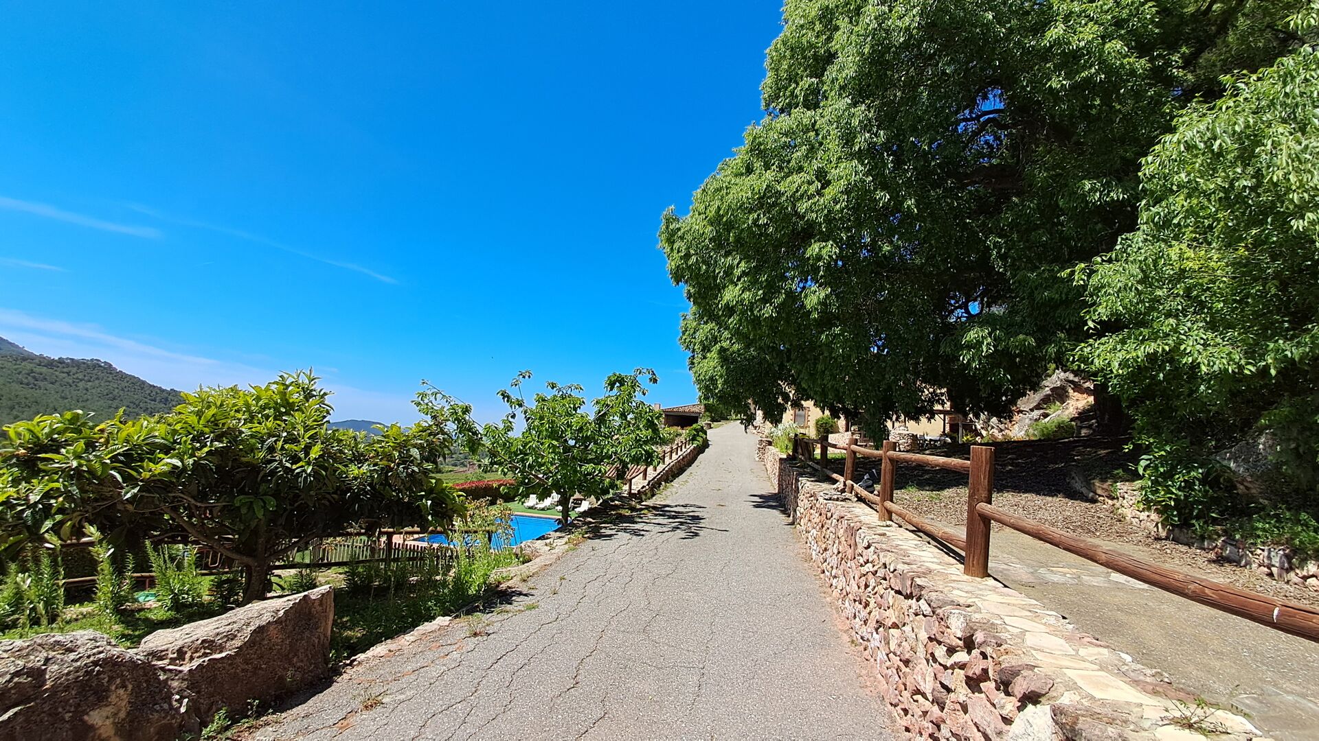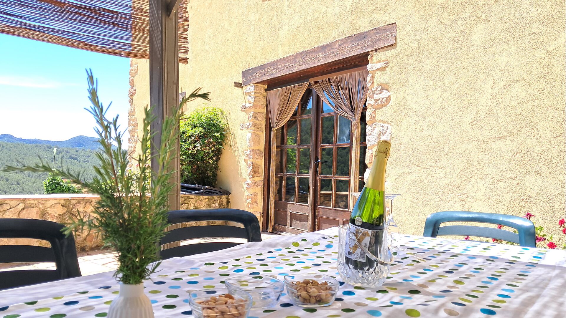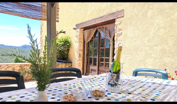 From the moment you enter the property, you feel the tranquillity and the sounds of nature, which will make your vacation relaxing and stress reducing. In the garden, the sunshine makes its way through the treetops of the shady trees in the garden. Below the house, the pool area with the very large swimming pool (6 x 12 meters), has a perfect view over the hills and the vineyards, the first starting rigt at the end of the pool area.