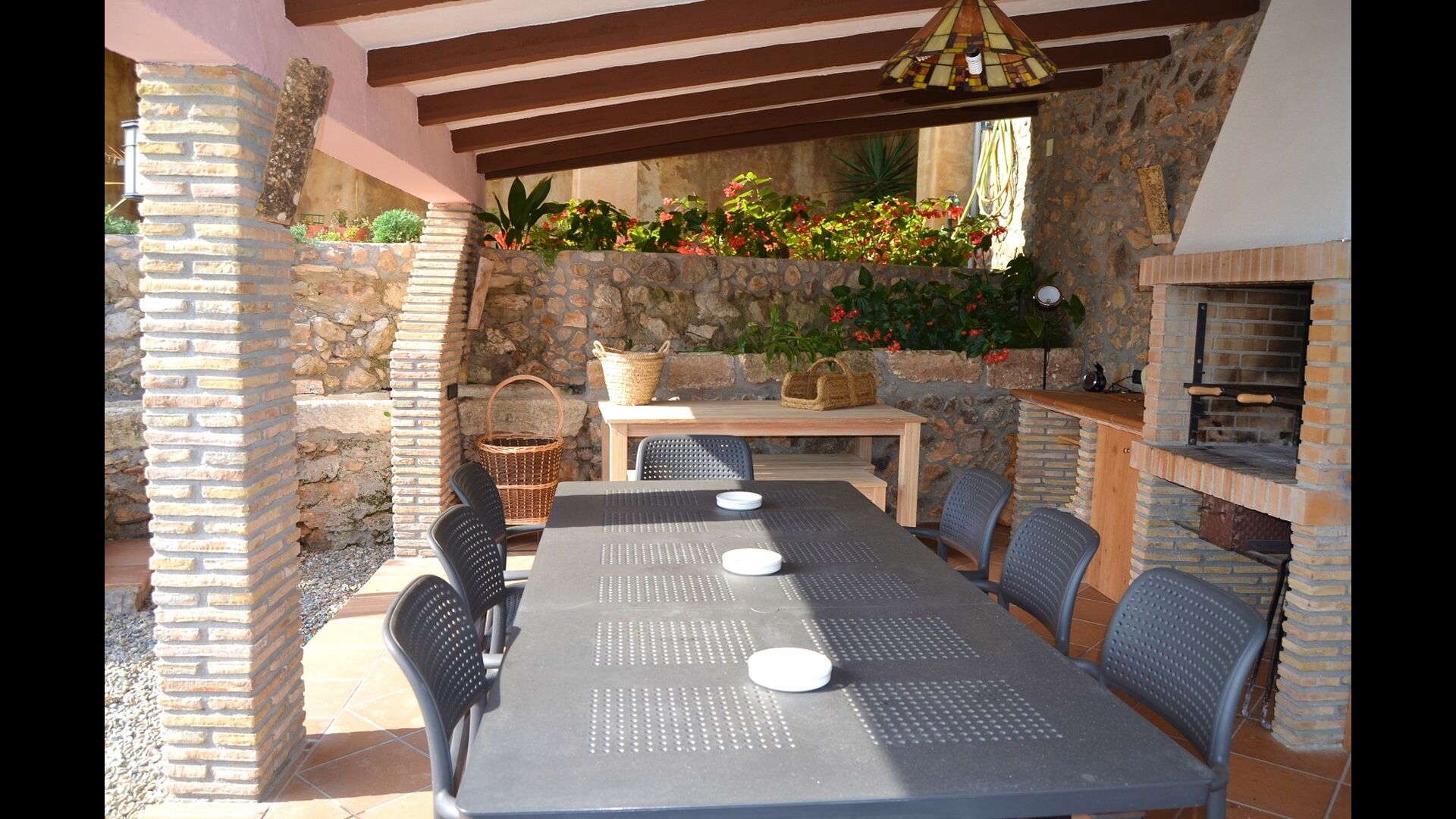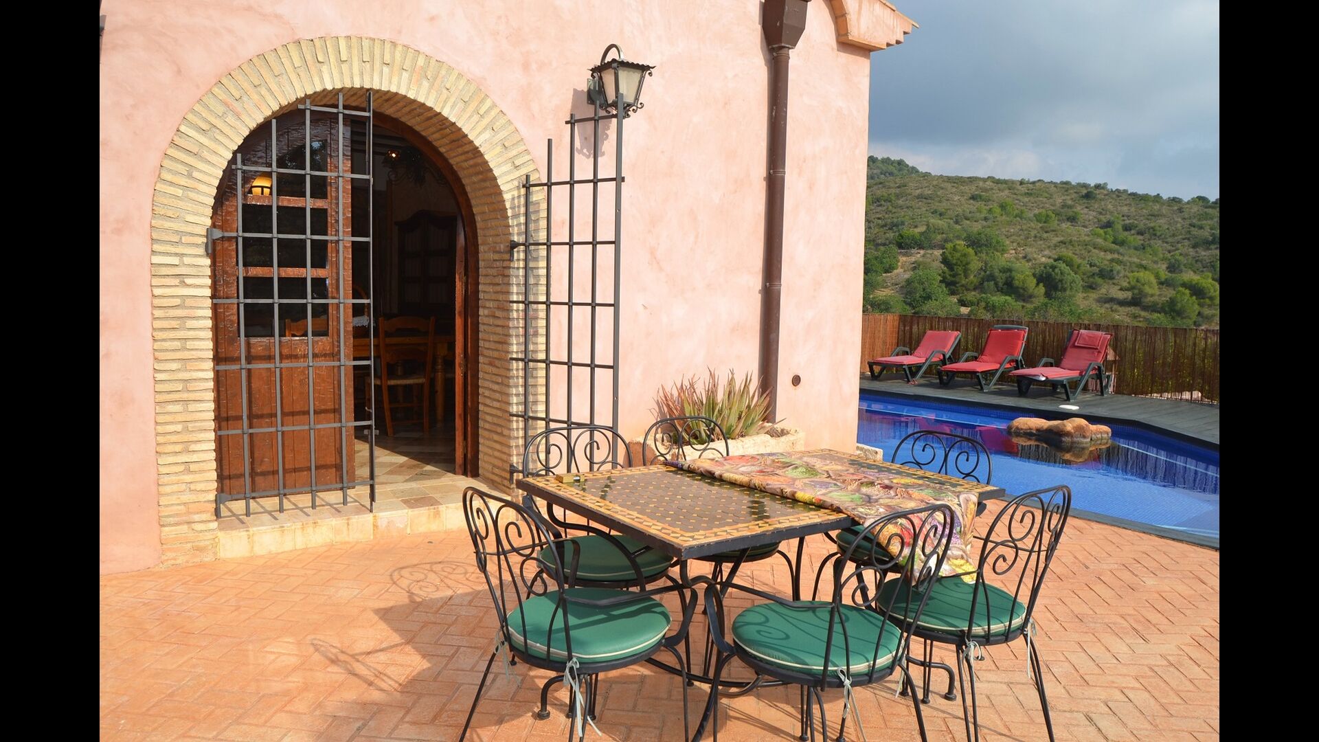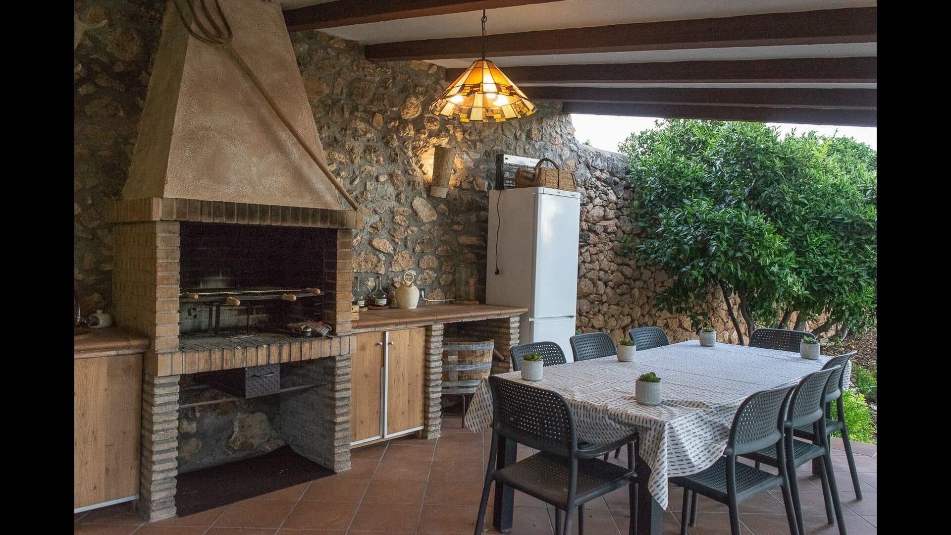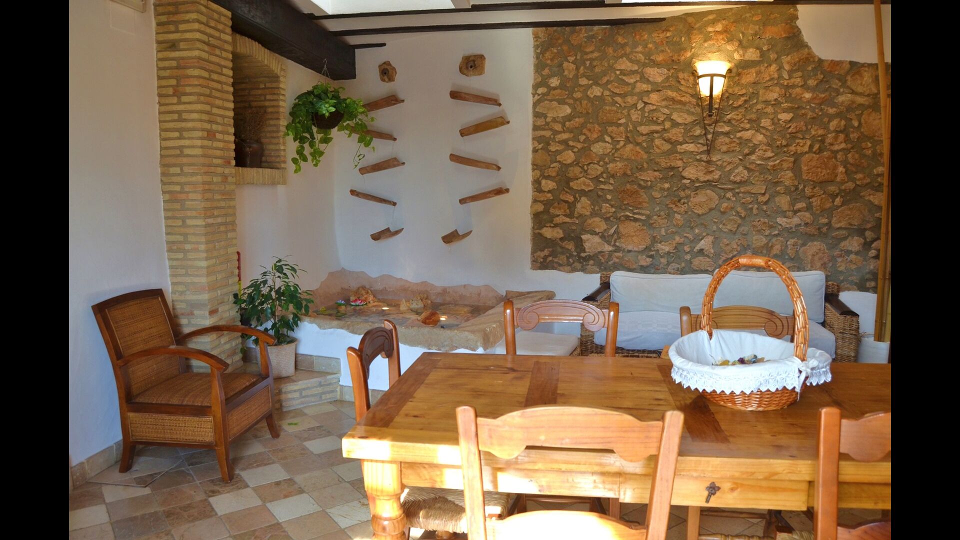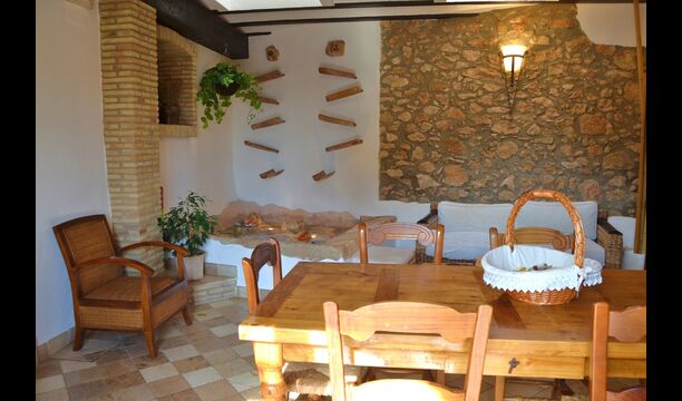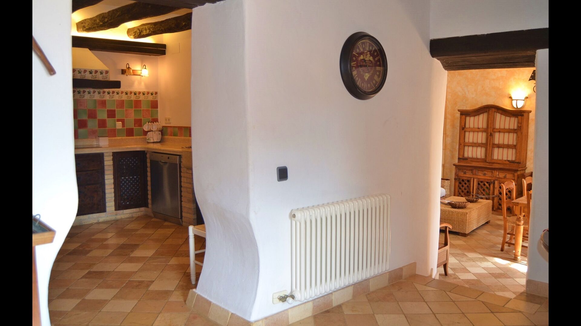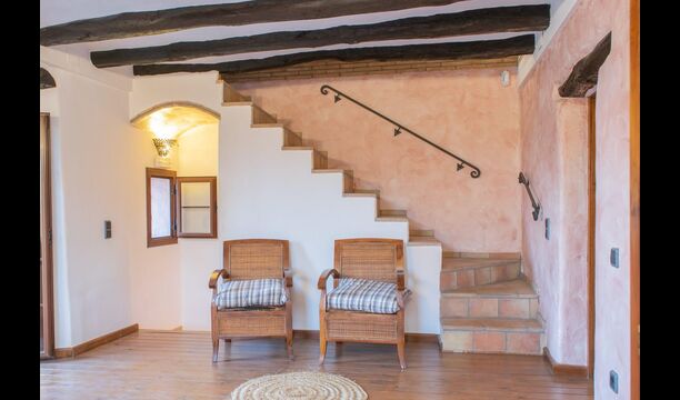 The holiday home is authentically constructed with a typical rural structure and several levels. On the ground floor you will find the well equipped kitchen along with two dining areas, one which also has a cozy corner with sofas and a TV. There is also a bathroom on the ground floor. The ground floor is connected with direct entrance to the outdoor terrace and pool area. Outside you will also find a great BBQ area where a gas grill has been installed. Here you can for instance cook a delicious paella and other delicious spanish dishes.