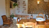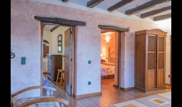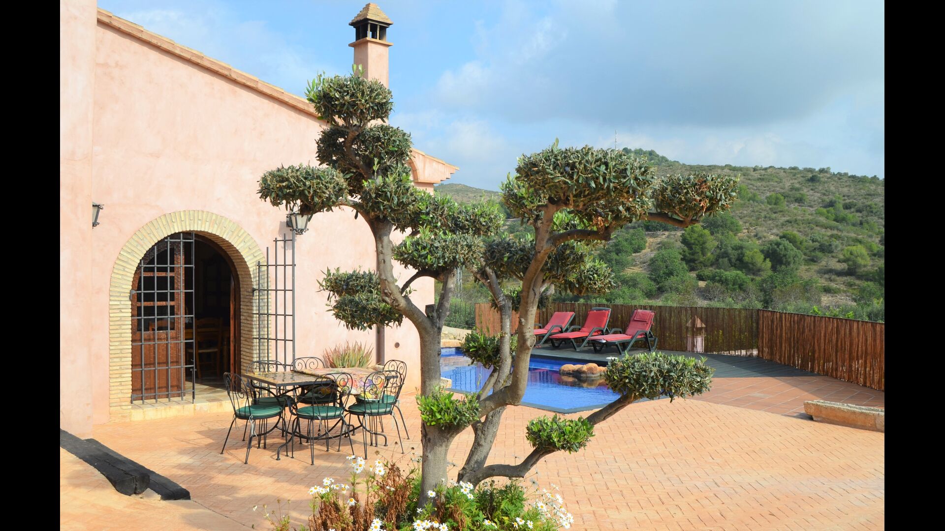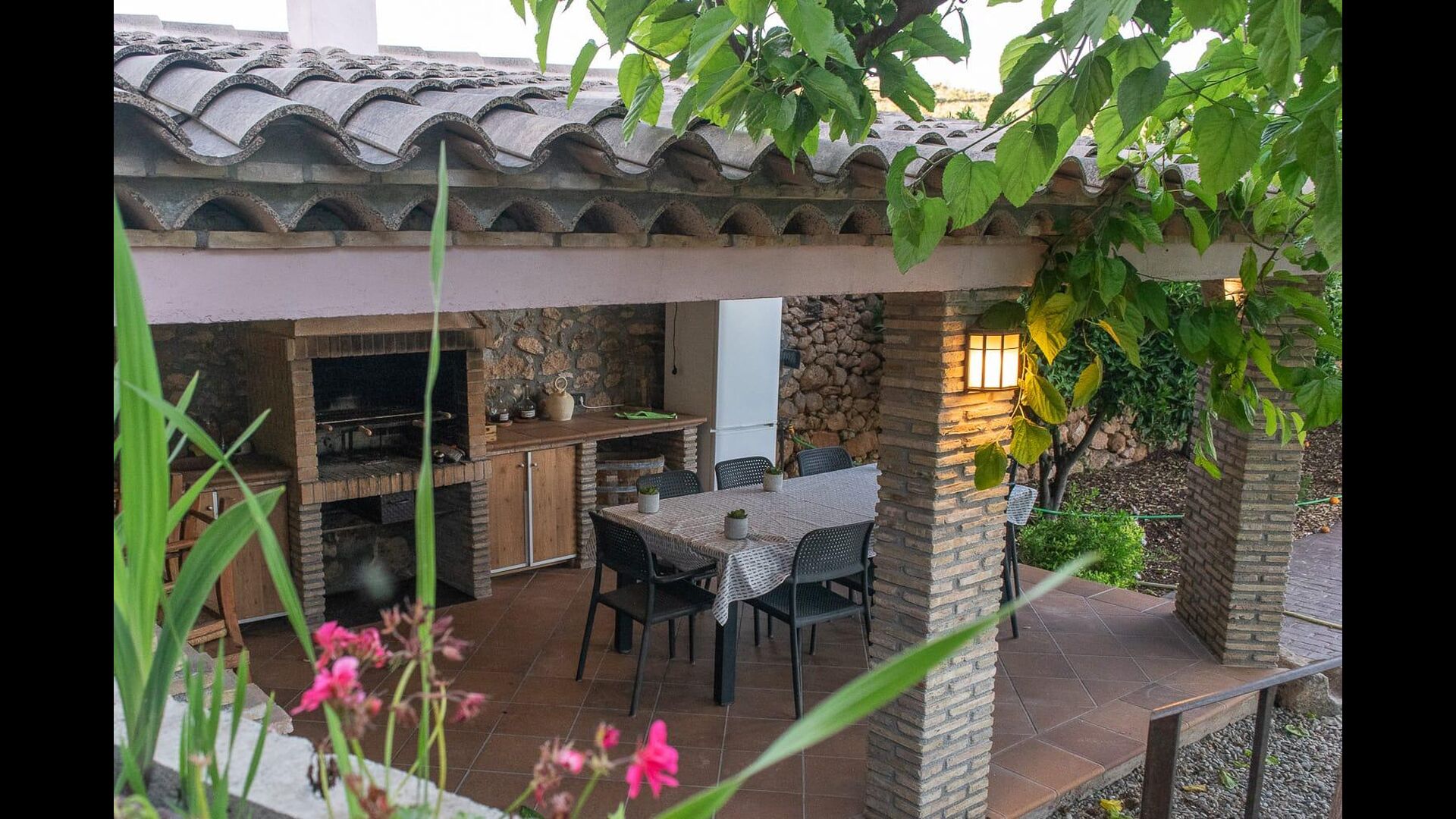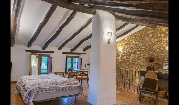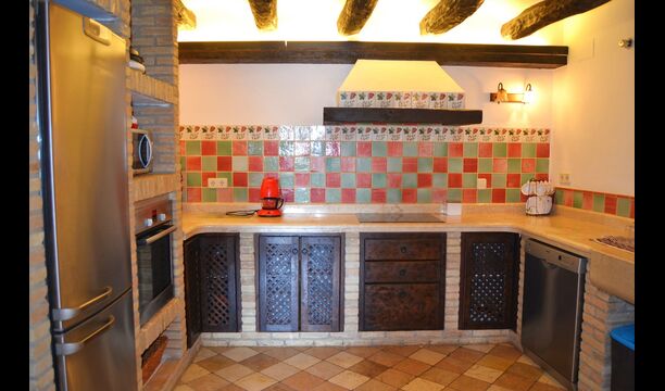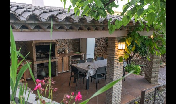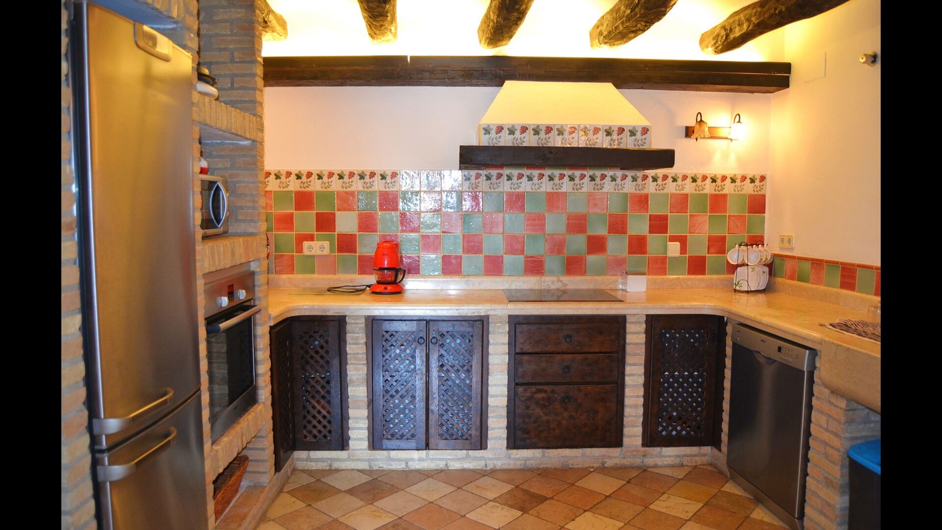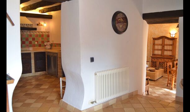 The holiday home is authentically constructed with a typical rural structure and several levels. On the ground floor you will find the well equipped kitchen along with two dining areas, one which also has a cozy corner with sofas and a TV. There is also a bathroom on the ground floor. The ground floor is connected with direct entrance to the outdoor terrace and pool area. Outside you will also find a great BBQ area where a gas grill has been installed. Here you can for instance cook a delicious paella and other delicious spanish dishes.