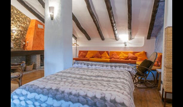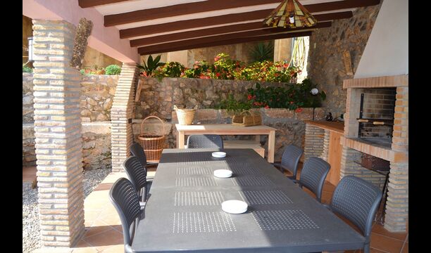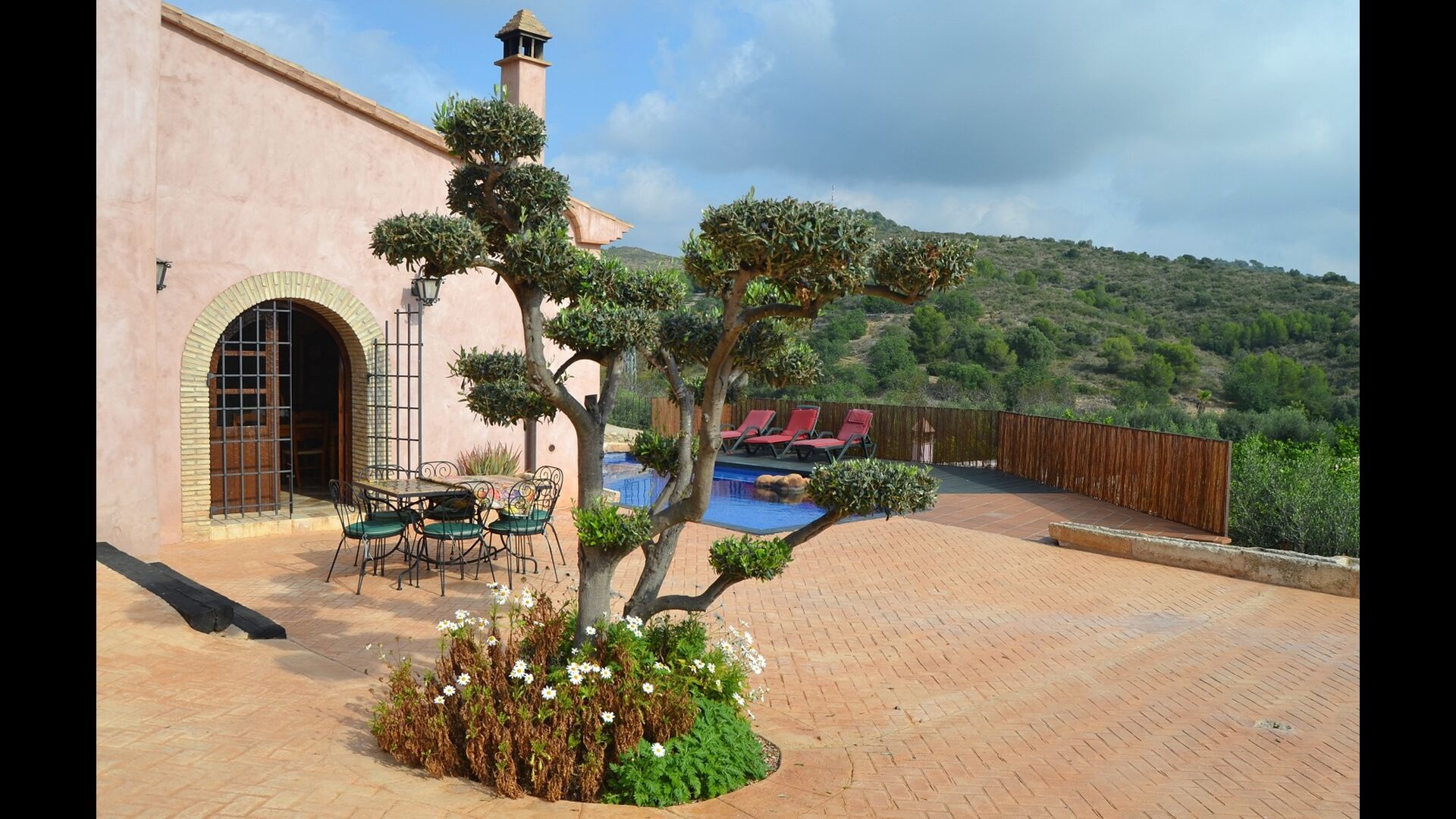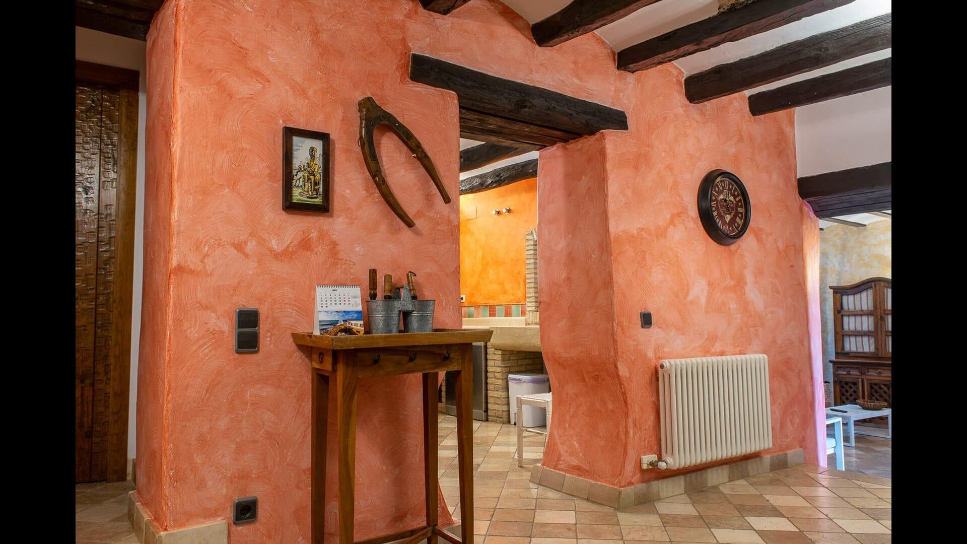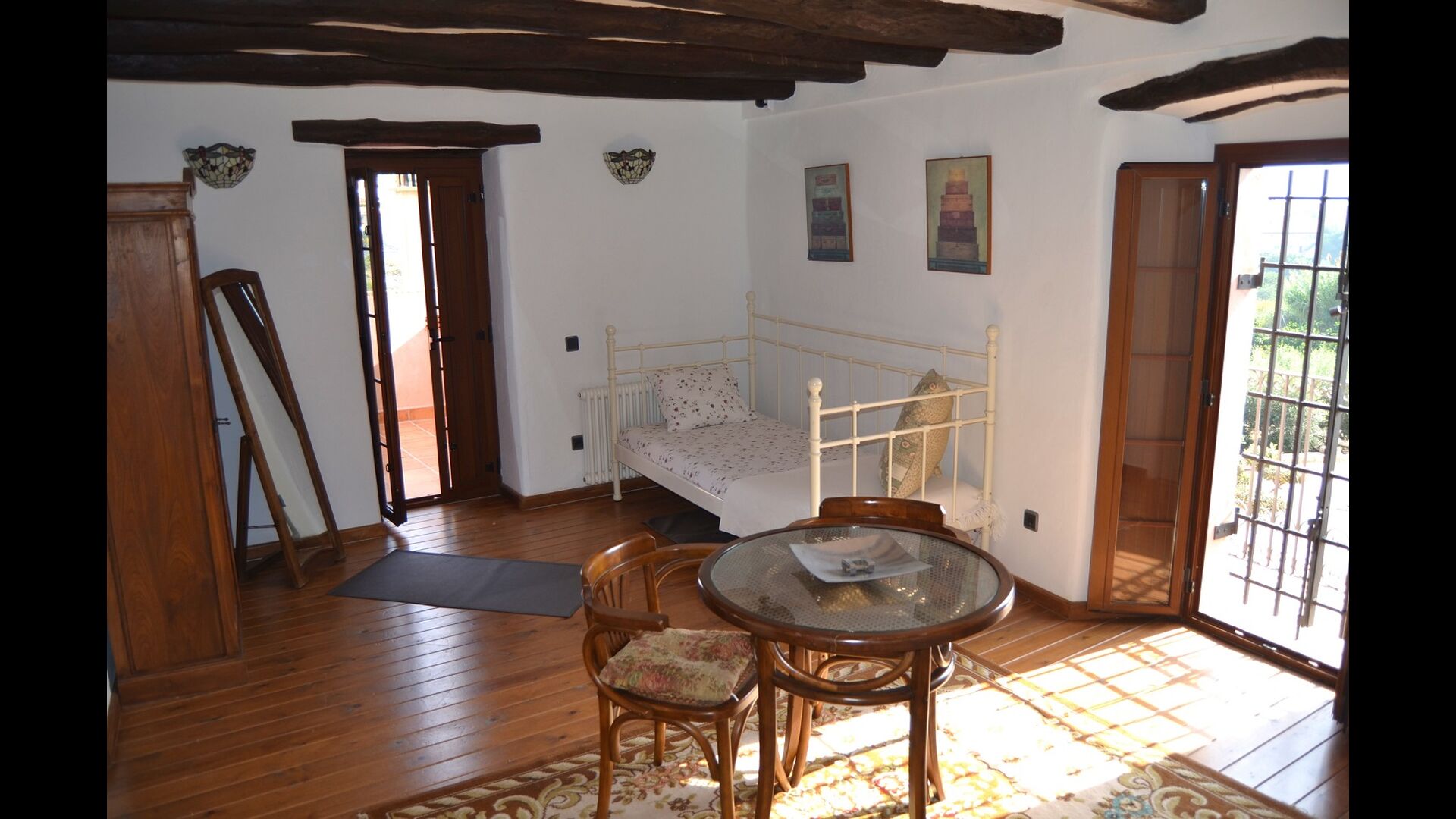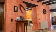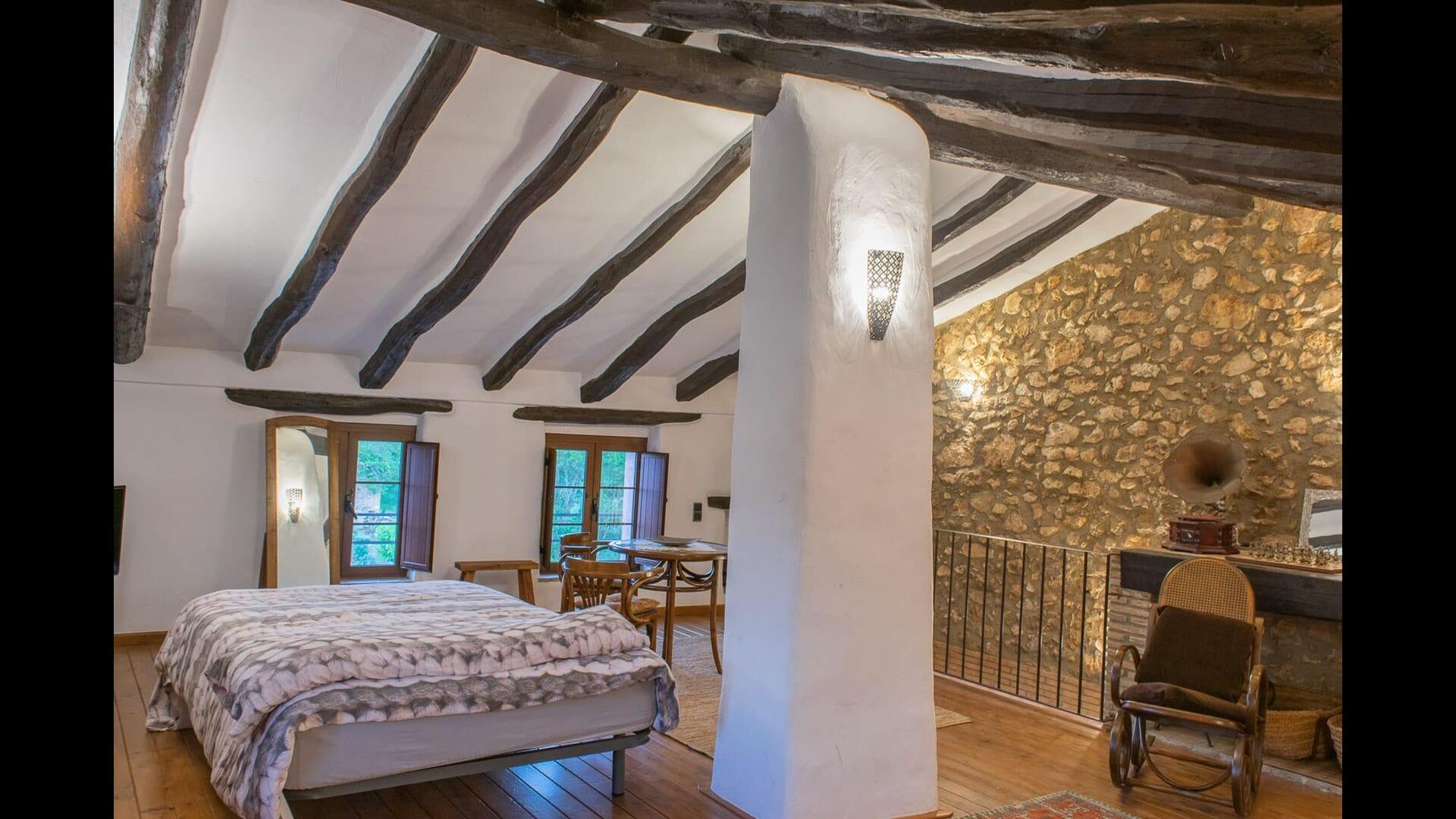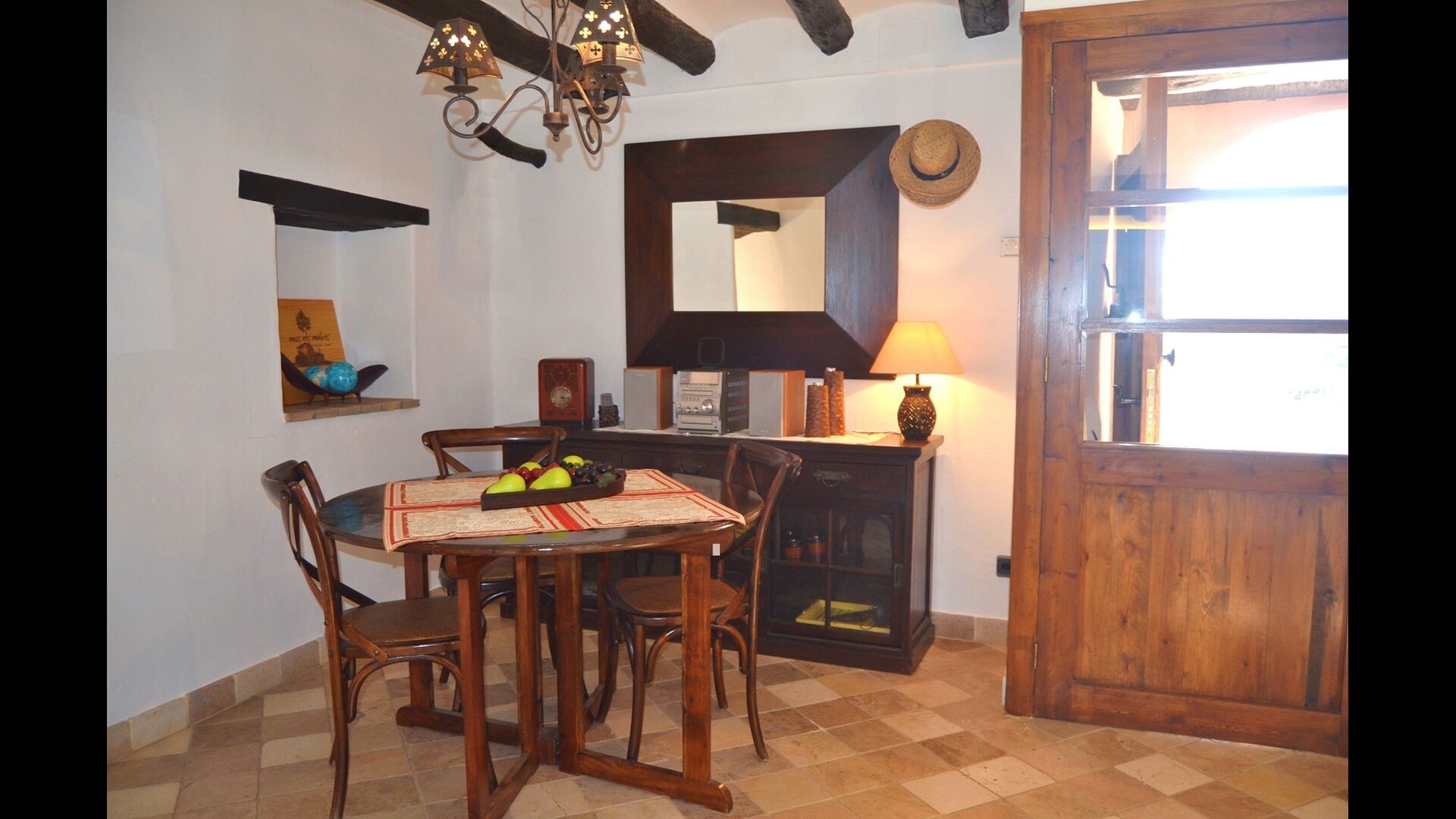 The holiday home is authentically constructed with a typical rural structure and several levels. On the ground floor you will find the well equipped kitchen along with two dining areas, one which also has a cozy corner with sofas and a TV. There is also a bathroom on the ground floor. The ground floor is connected with direct entrance to the outdoor terrace and pool area. Outside you will also find a great BBQ area where a gas grill has been installed. Here you can for instance cook a delicious paella and other delicious spanish dishes.
