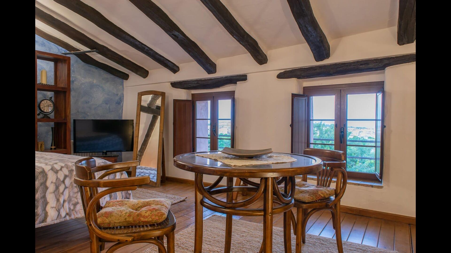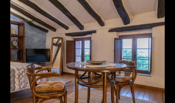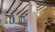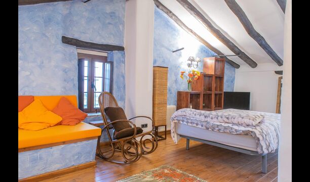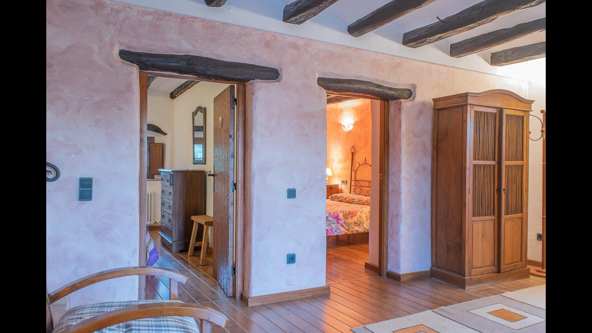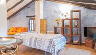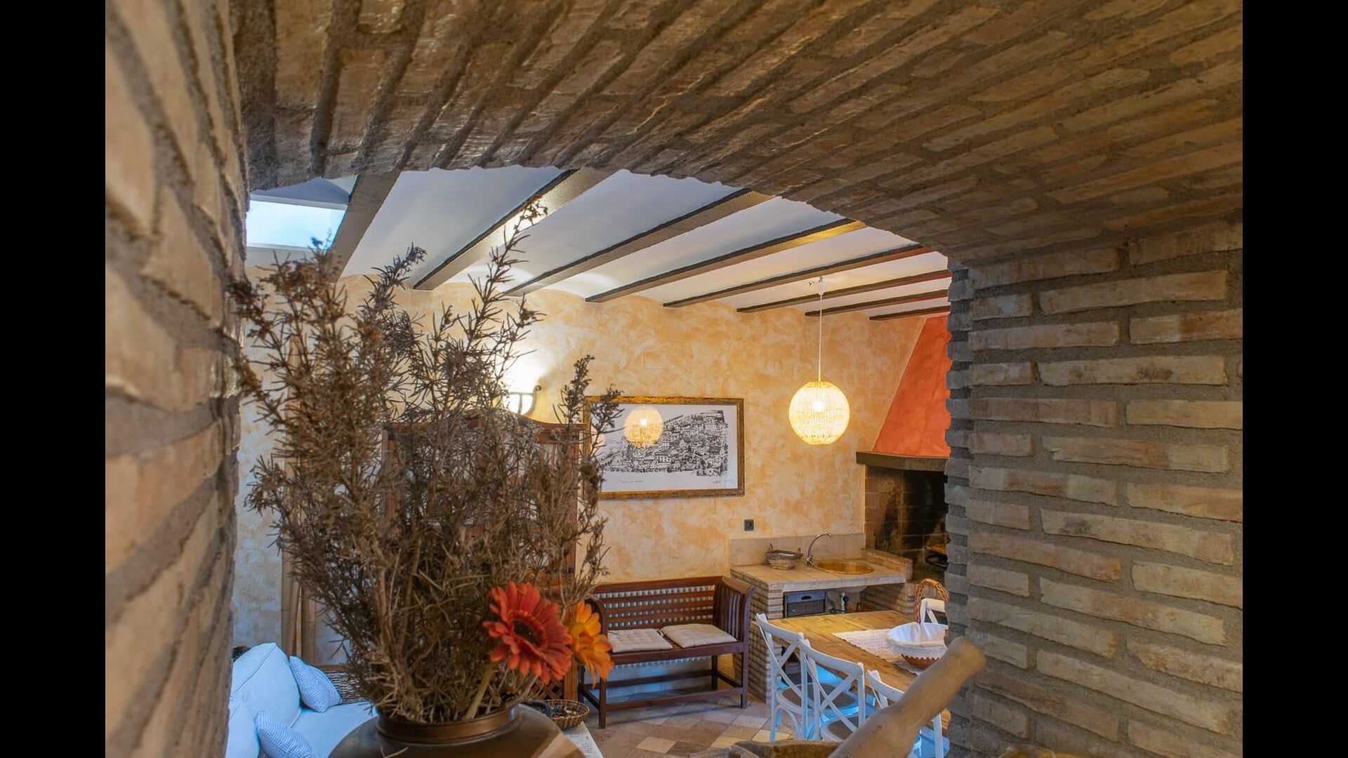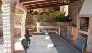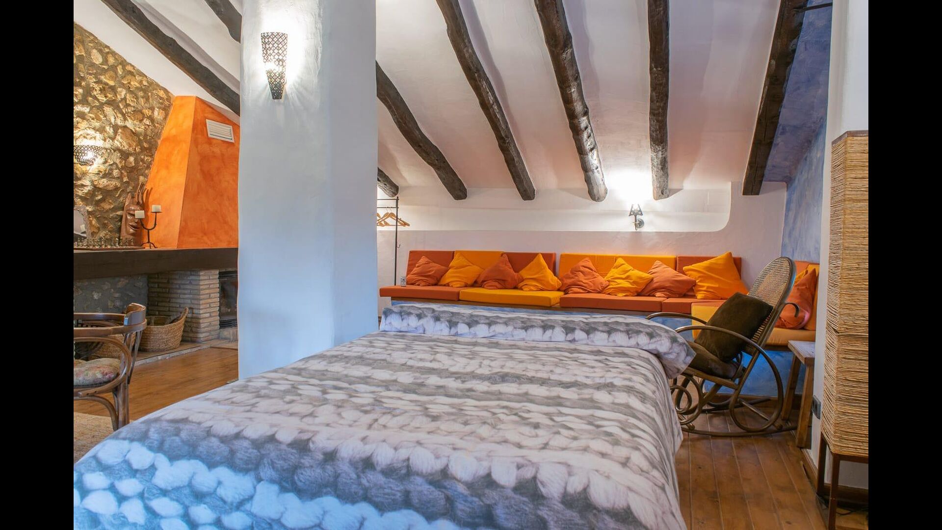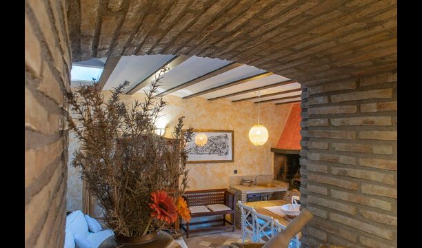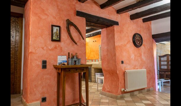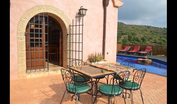 The holiday home is authentically constructed with a typical rural structure and several levels. On the ground floor you will find the well equipped kitchen along with two dining areas, one which also has a cozy corner with sofas and a TV. There is also a bathroom on the ground floor. The ground floor is connected with direct entrance to the outdoor terrace and pool area. Outside you will also find a great BBQ area where a gas grill has been installed. Here you can for instance cook a delicious paella and other delicious spanish dishes.